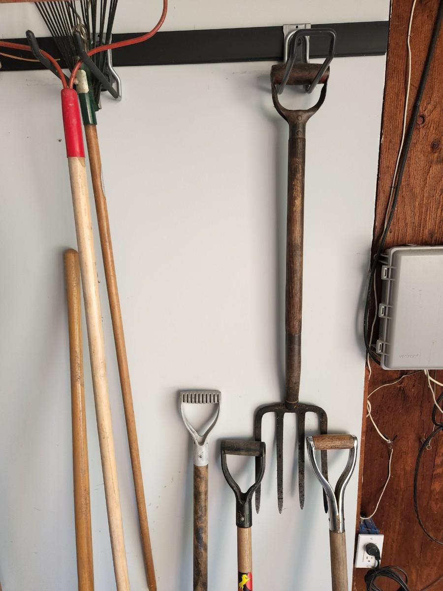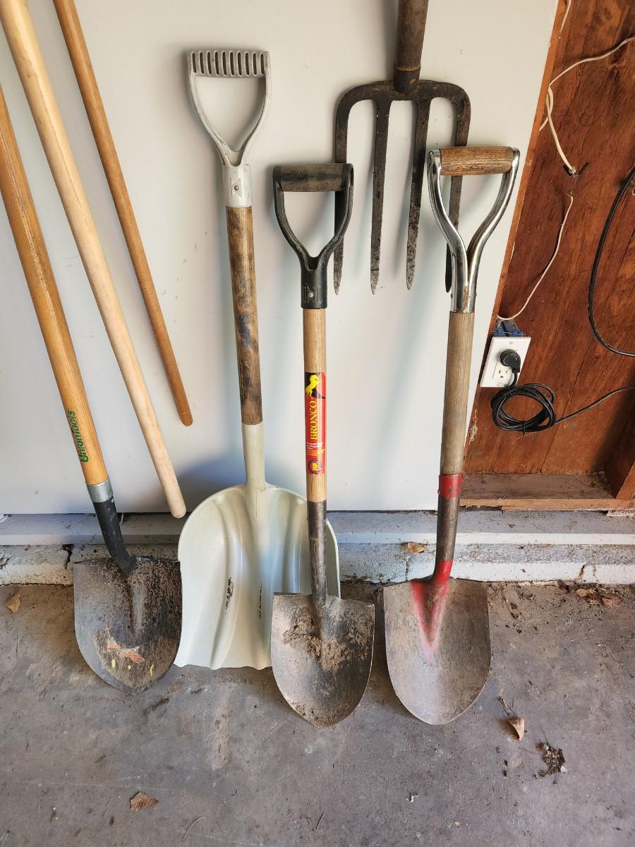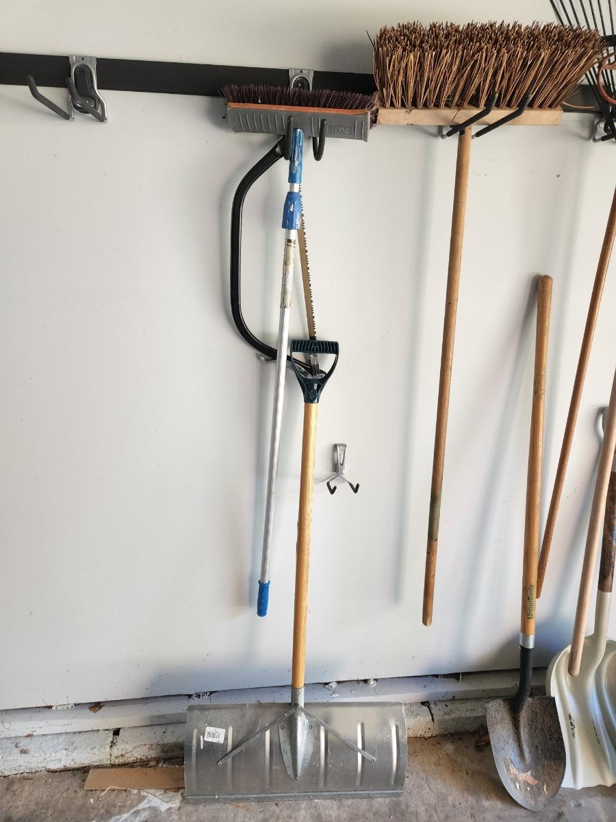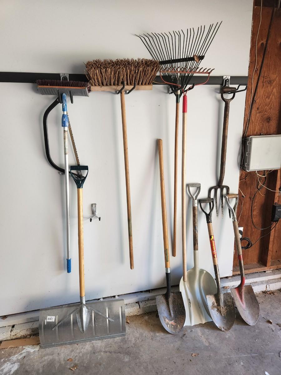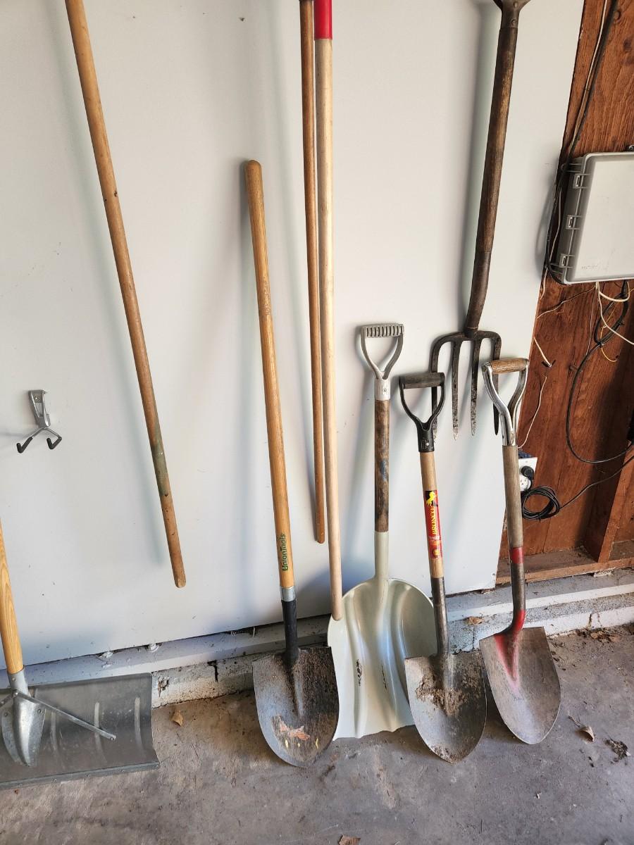 Lot of Shovels, Fork ,Racks, Brooms pruning saw.