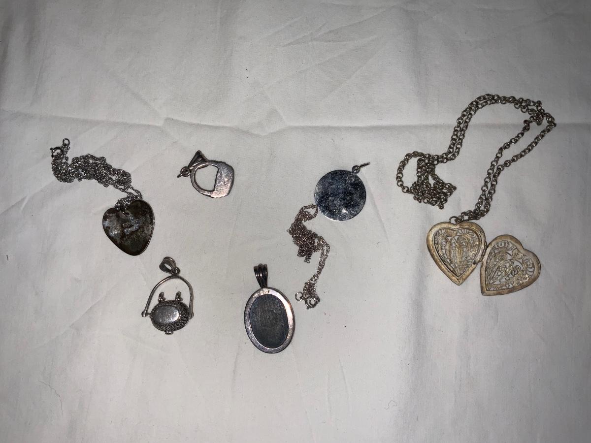 Lot of silver necklace pieces. Some marked Sterling or 925. Not verified or tested. Please see photos for condition . Locket does not stay closed and has no jewelers marks or metal purity.