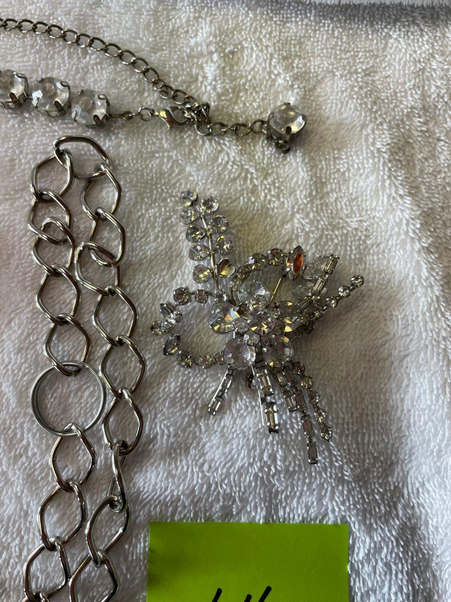 The one rhinestone pin (on right) has discolored stone.