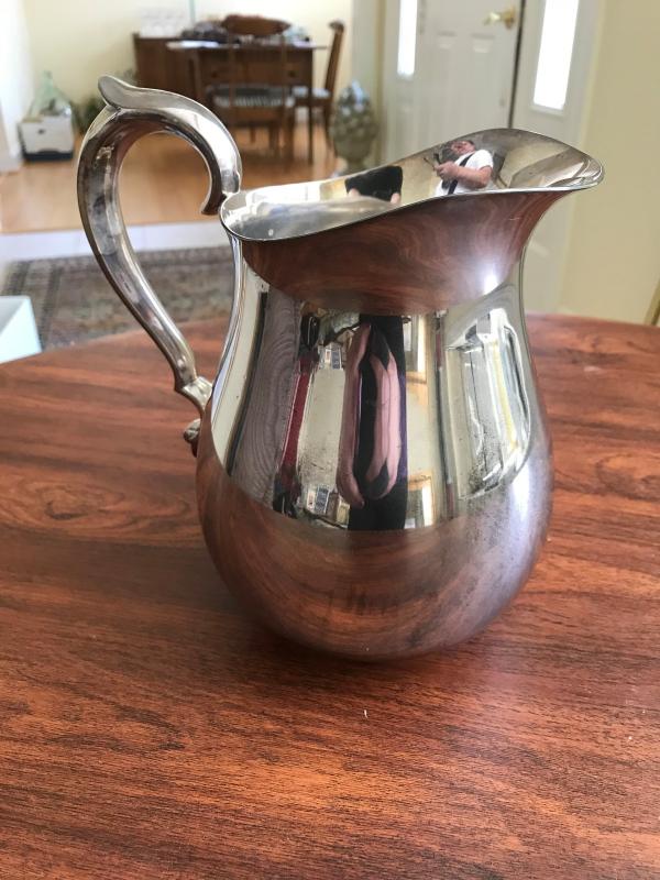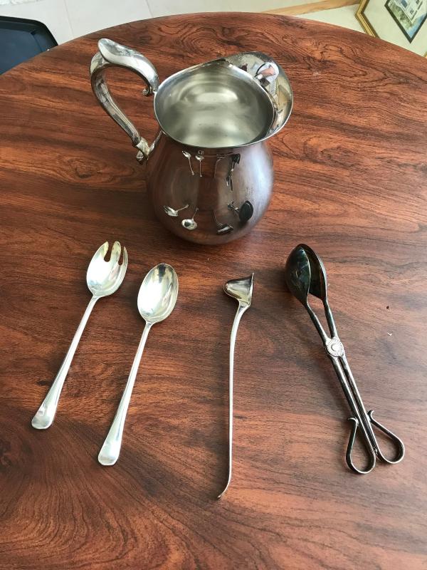 Lot includes-Heavy silver plate water pitcher. Along with silver plated sissor style salad servers, individual spoon and fork salad servers, and candle snuffer.