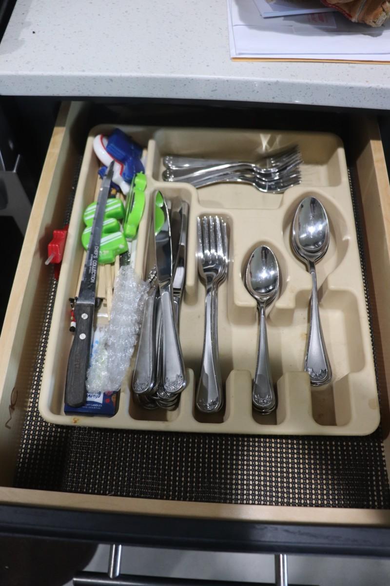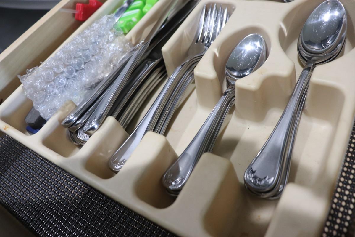 This lot includes a collection of forks, spoons, and knives, along with a stylish holder for easy storage and display. The utensils feature a silver-tone finish, making them suitable for casual dining or special occasions. The holder adds a functional and decorative touch, keeping everything organized and accessible. Perfect for entertaining or as an addition to your kitchenware.