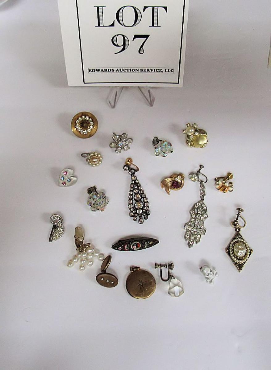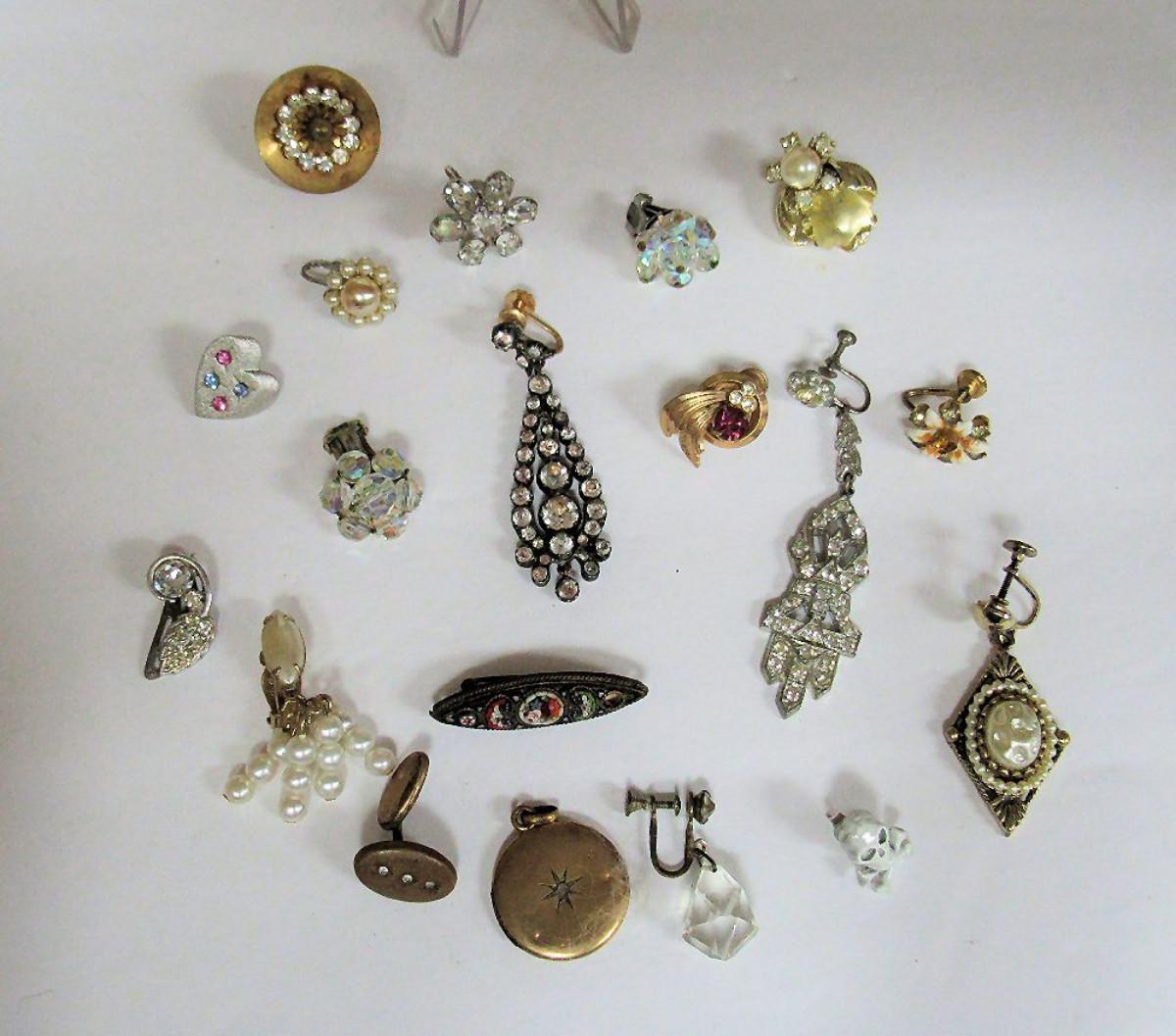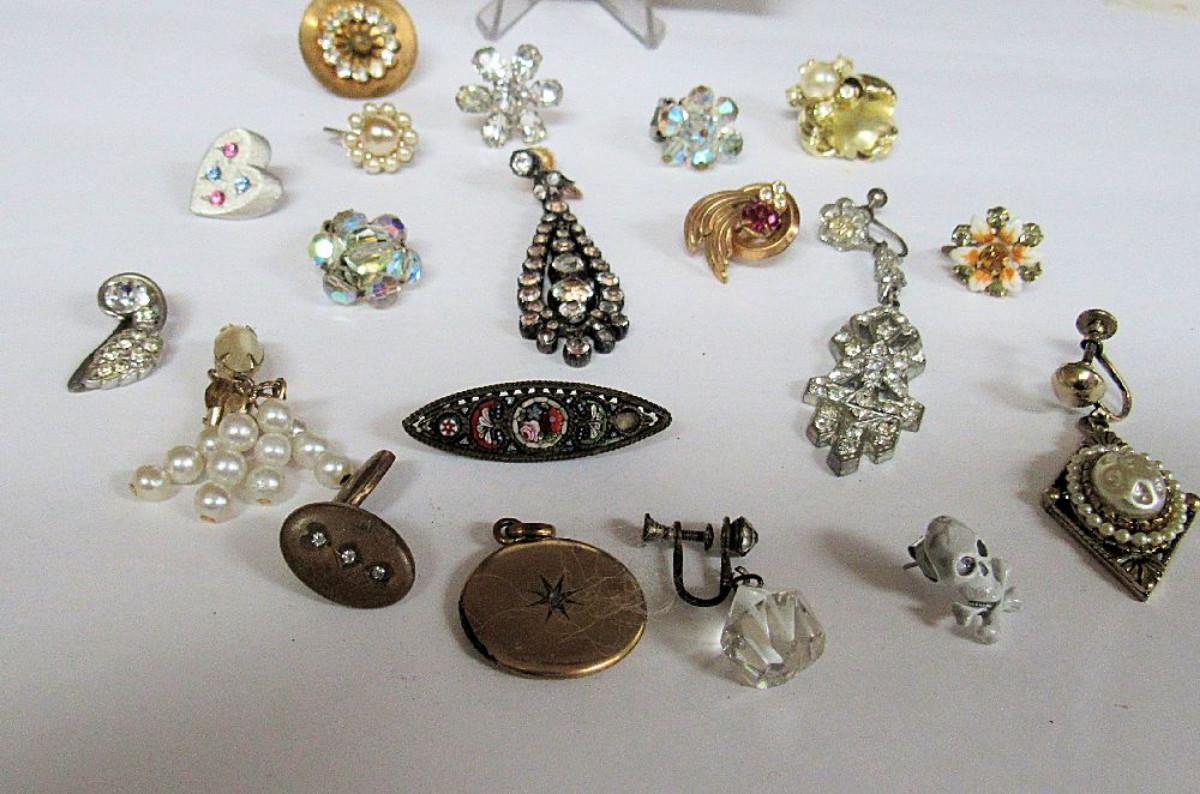 Some nice earrings in this lot, unfortunately they are all singles, no mates. One cuff link. One locket has a dent in it. There is one nice Italy pin but it is missing a small section. Hoping someone can use these for repair or crafting. Shipping is available at shipping cost plus $5.00 handling fee on one box, $10.00 handling fee on two boxes, $15.00 handling fee on 3 boxes. Helps cover shipping materials and labor cost.