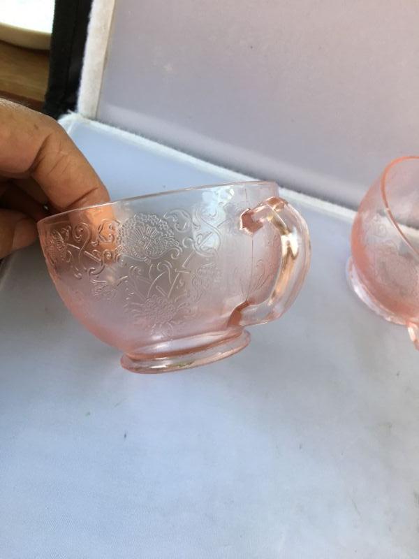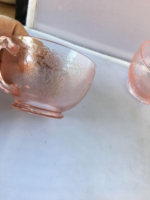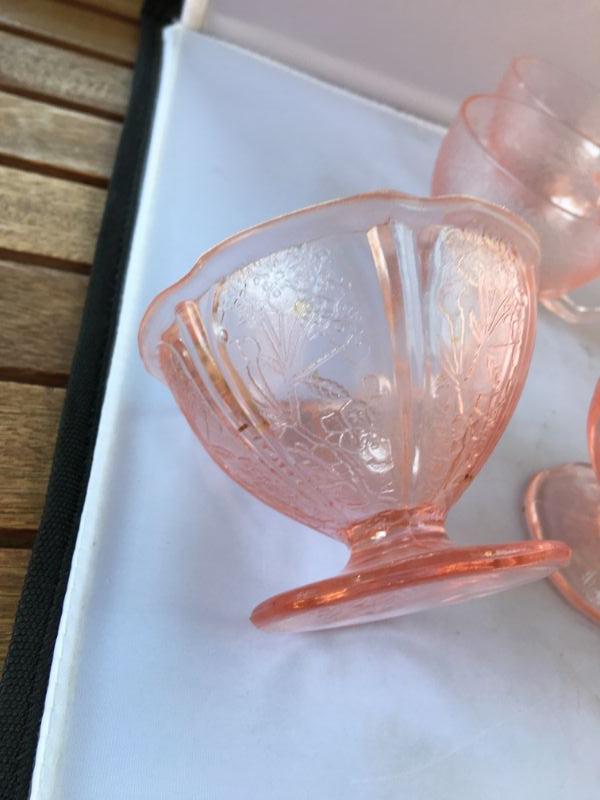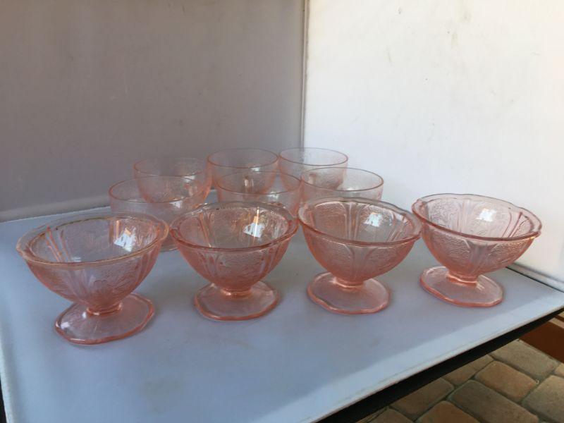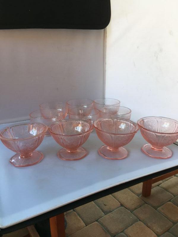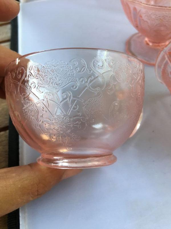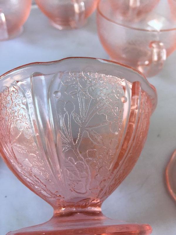 Lot of Six Etched Footed Depression Cups with handles and FOUR Footed Etched Ice Cream Glasses