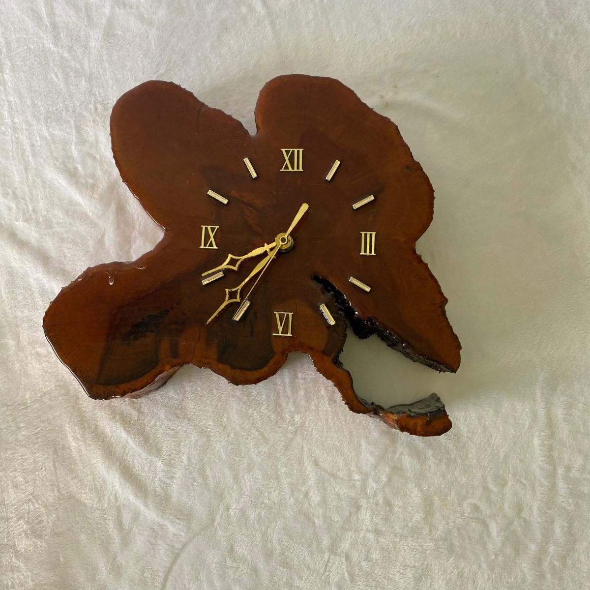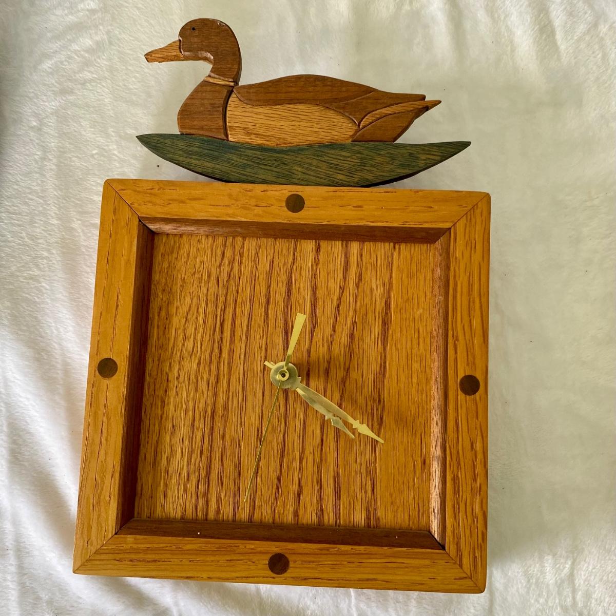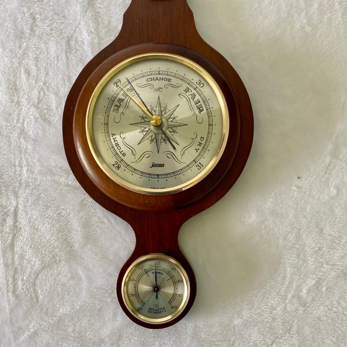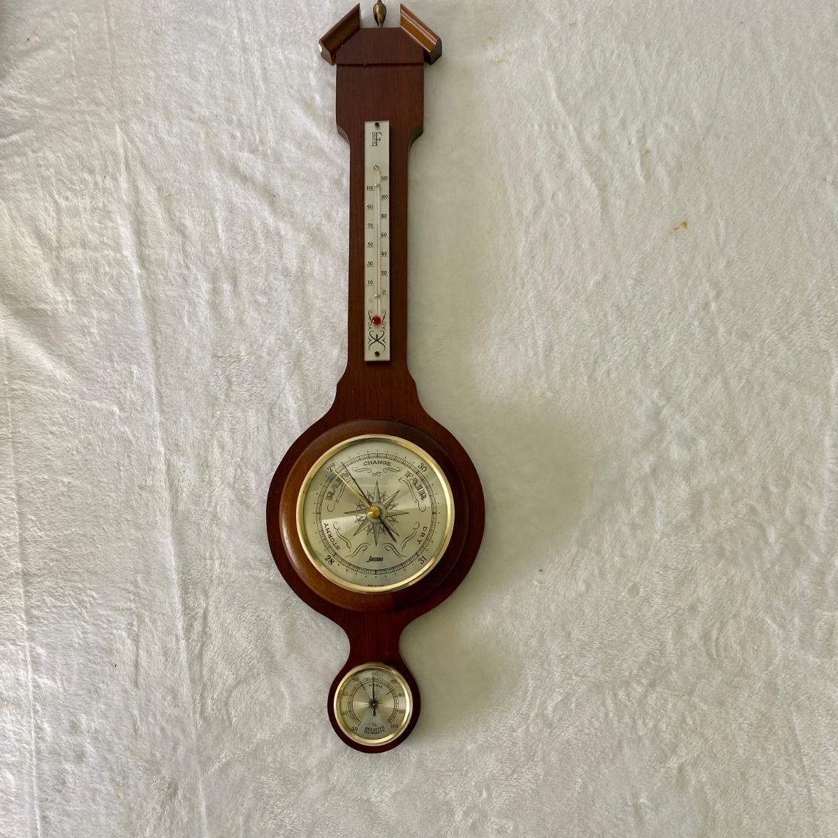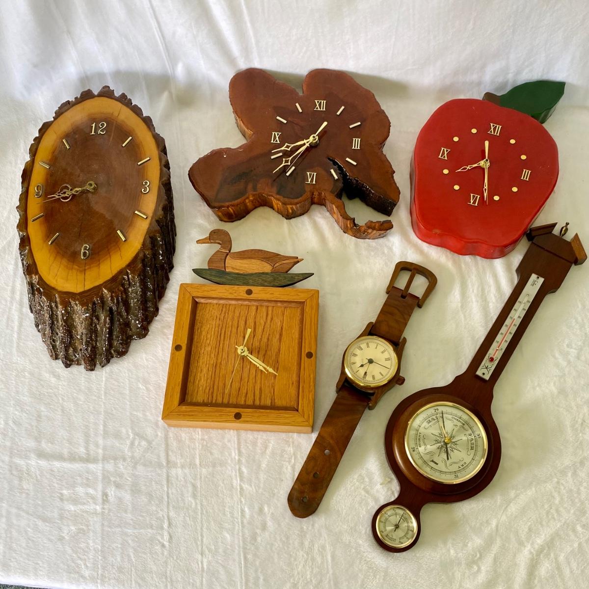 Lot of six wooden clocks and barometer. Barometer measures 20”H. Largest clock measures 16”H. Good condition.