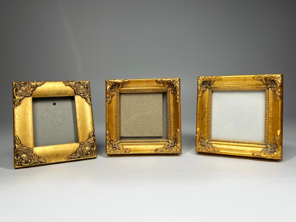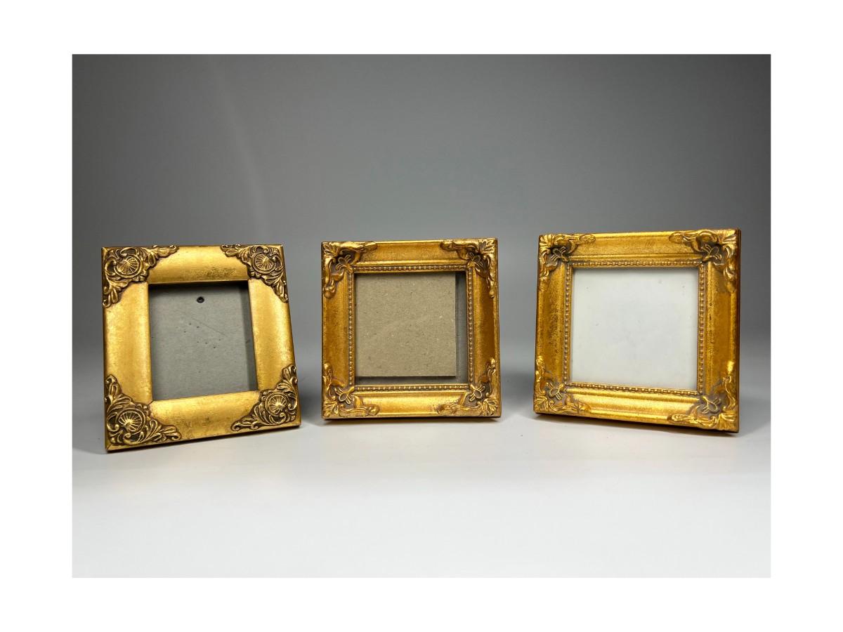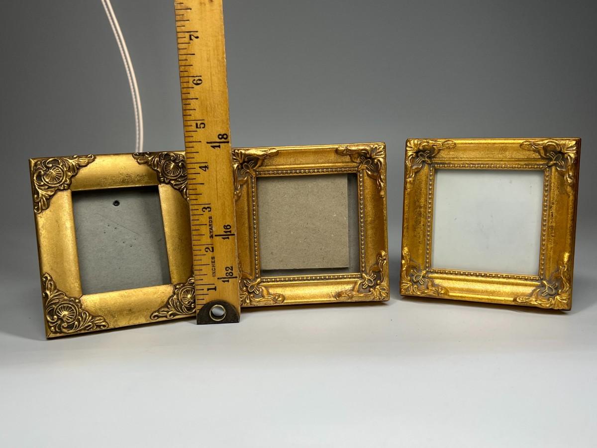 Lot of Small Antique Vintage Styled Gold Frames, the back of one of the frames is lifting near one of the corners, there is no other significant damage to the other frames and is in overall good useable condition. Check pictures for more details and for sizing.