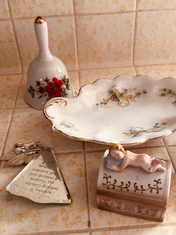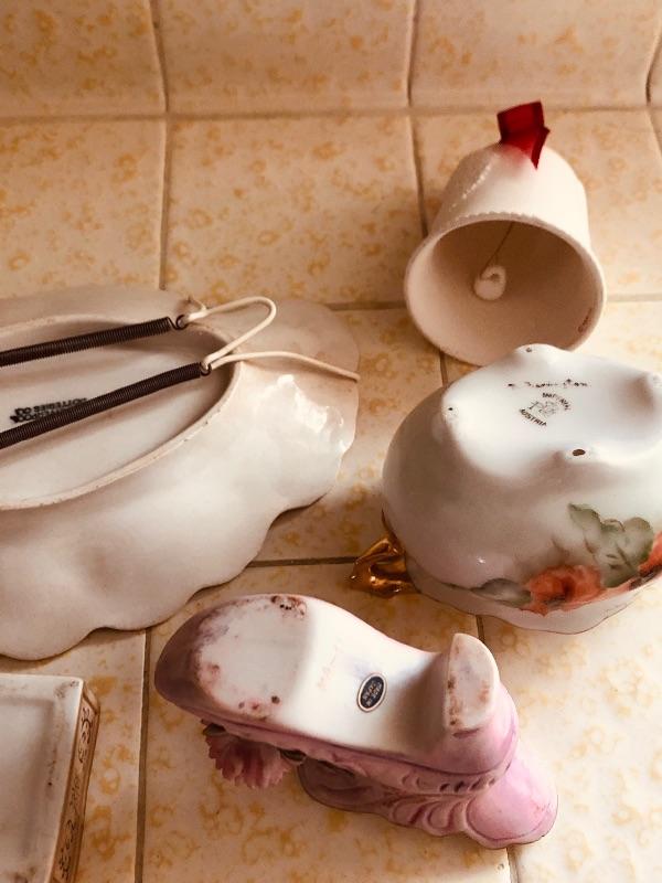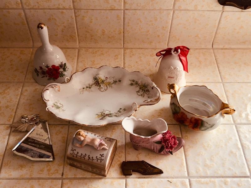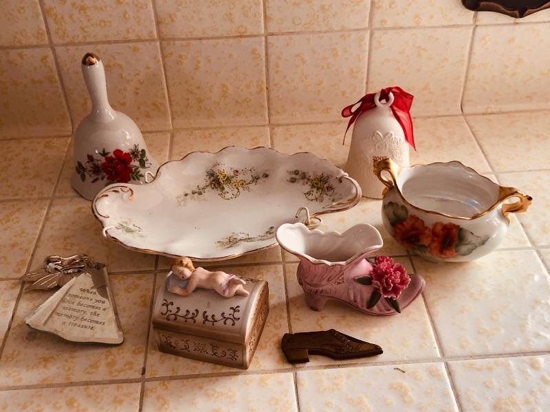 Lot of Small Collectible Decor Pieces, Lefton kewpie on box, shoe, bells, knife