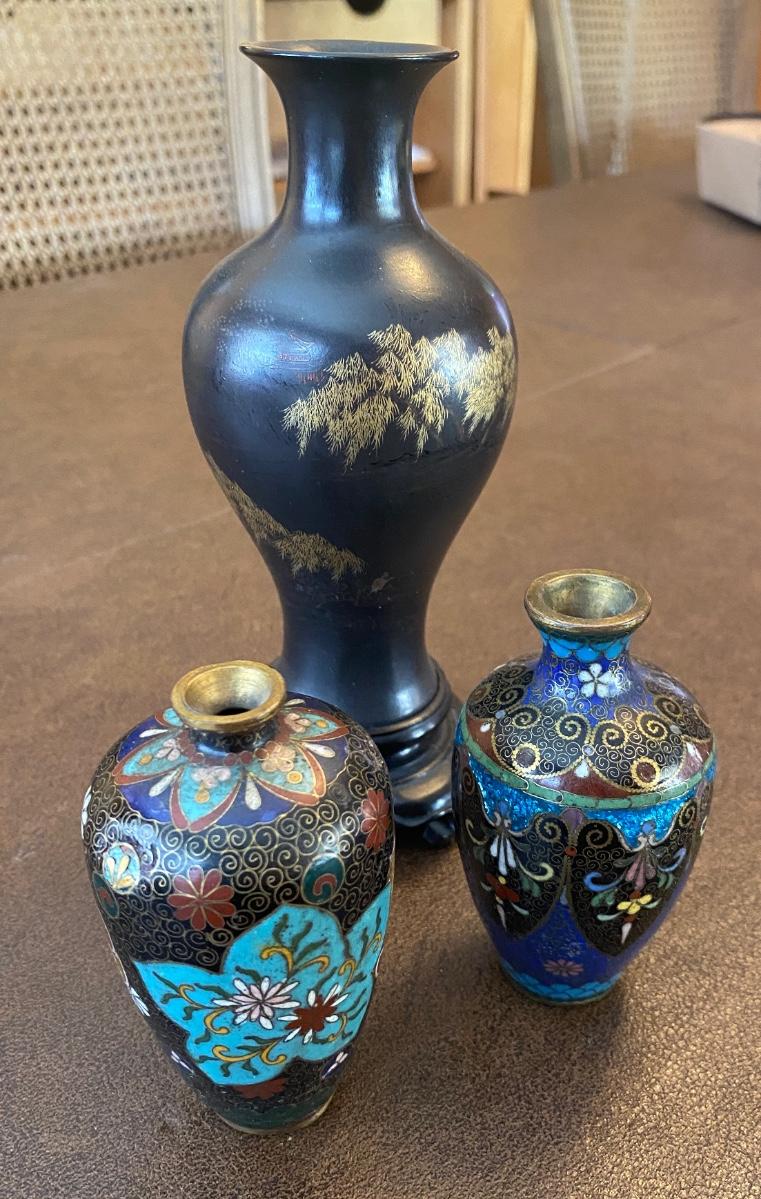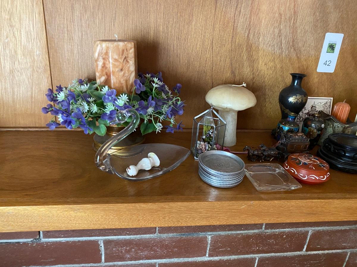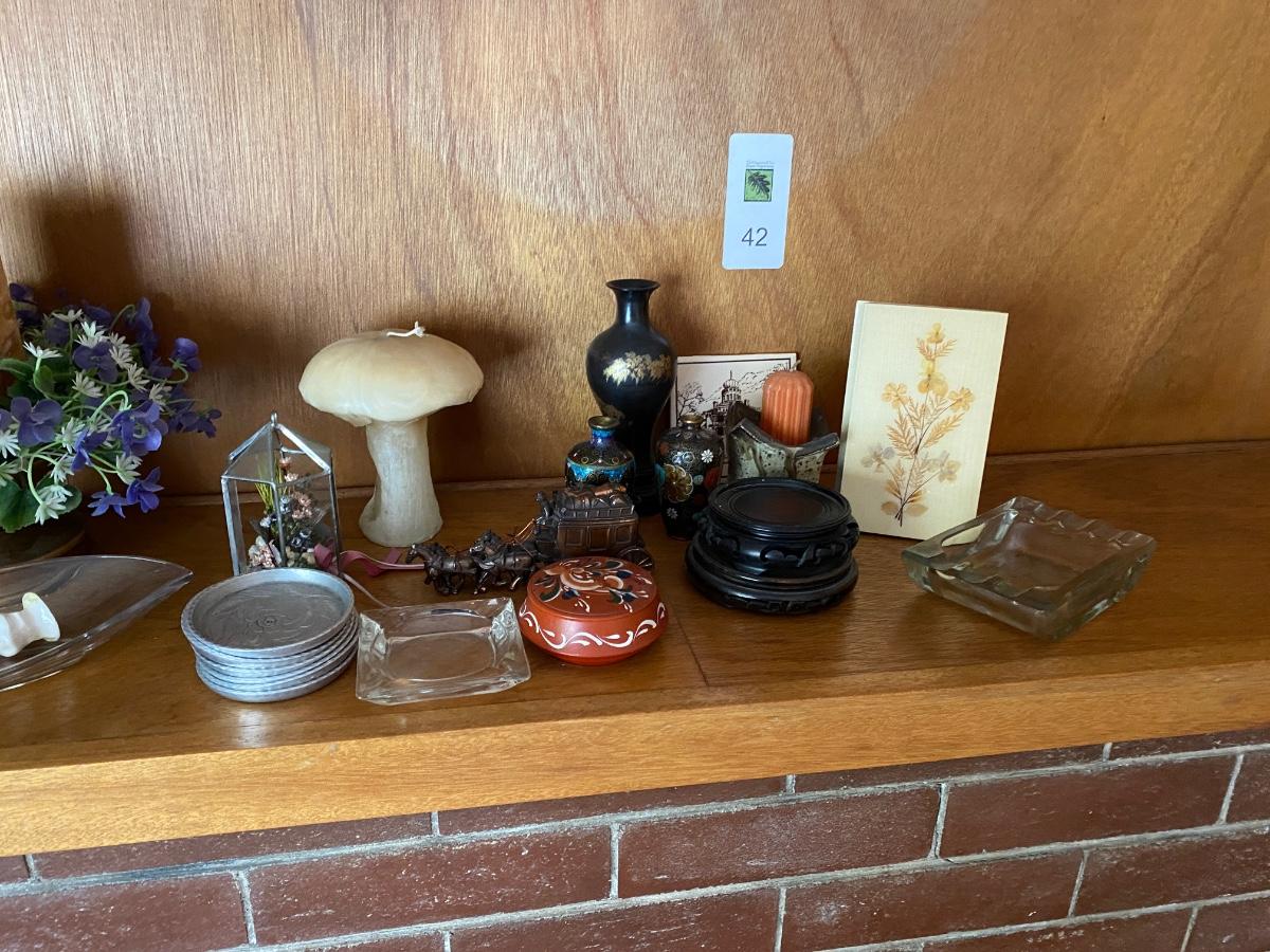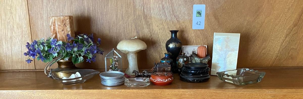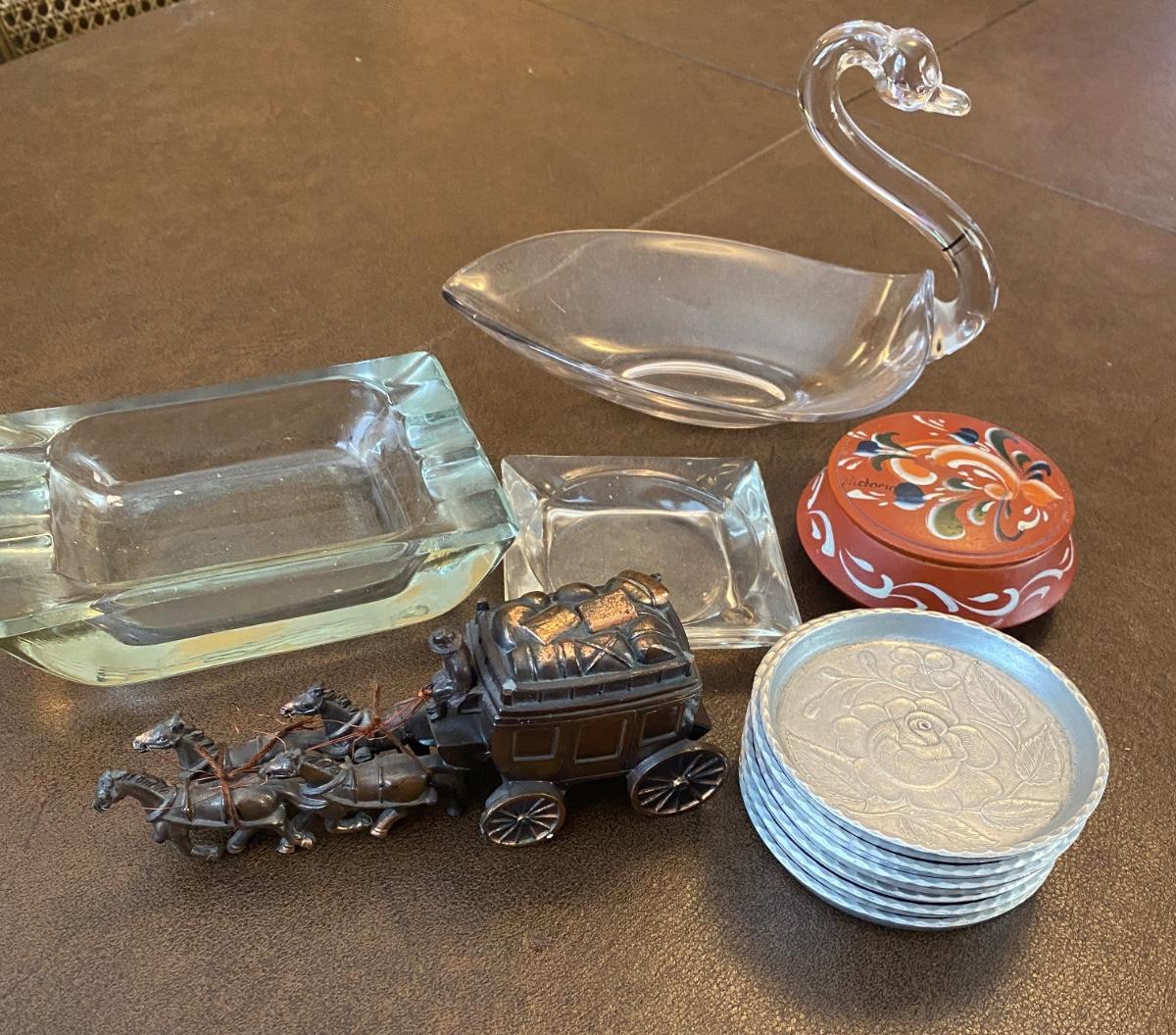 Includes candles, glass ashtrays, small model stagecoach and two Cloisennai vases (Vases are 4”x2”) among other small items.