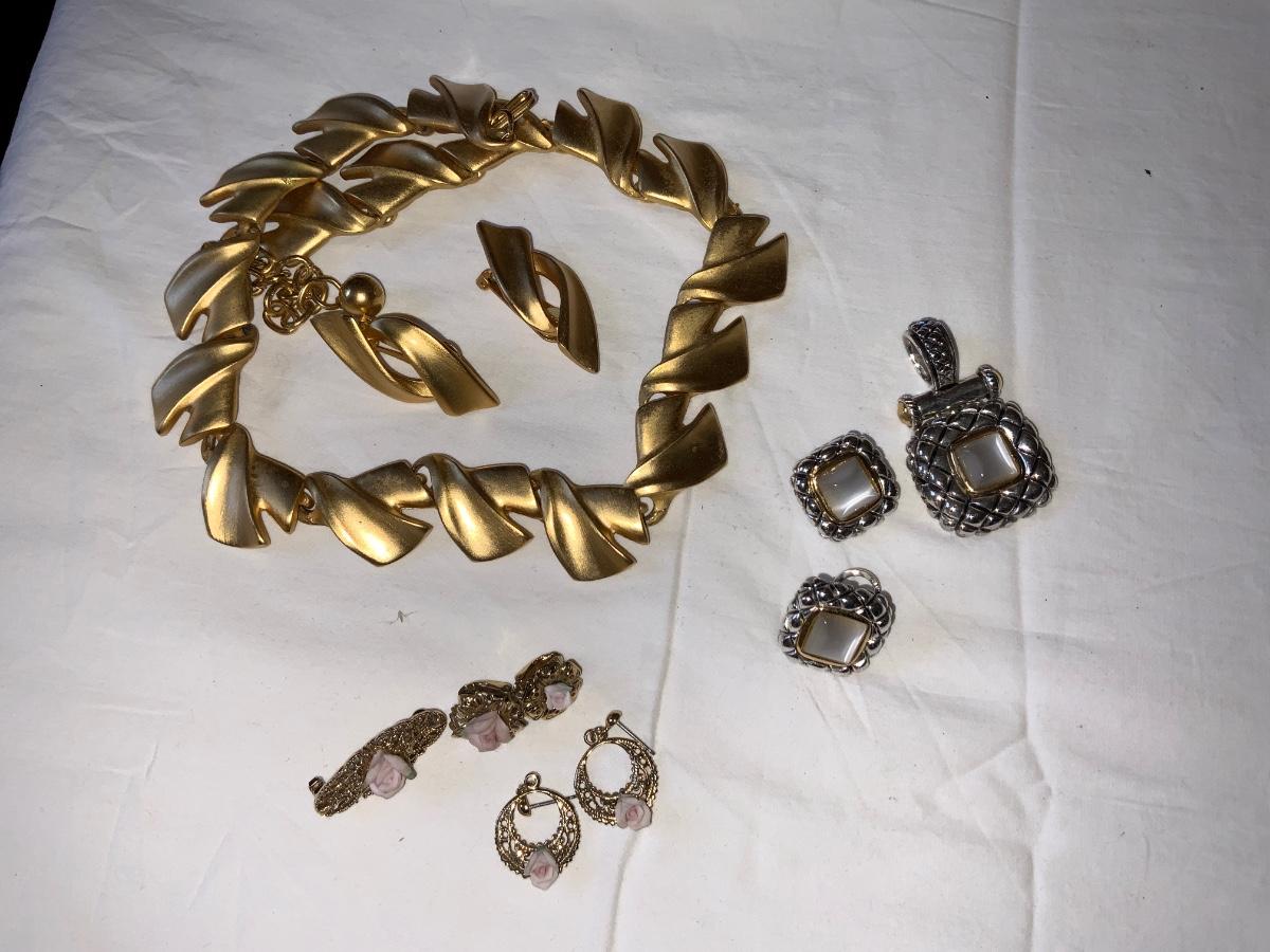 This lot has 3 small sets of jewelry. Vintage. Please see photos for Condition. Makers marks on back of some pieces