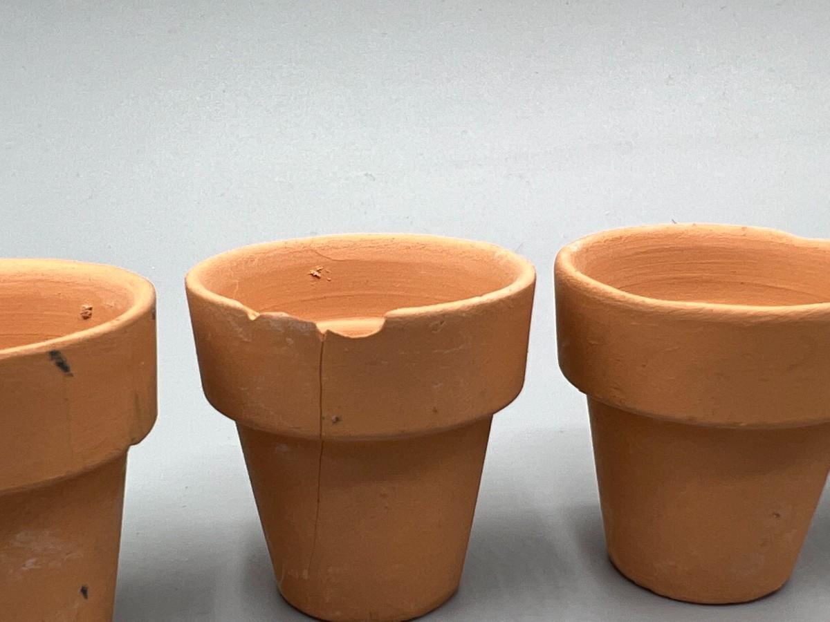 Lot of Small Miniature Terra-Cotta Clay Gardening Planter Pots, there is a chip on the lip of one of the pots, but there is no other significant damage to the rest of the lot and is in good displayable condition. Check pictures for more details and for sizing.