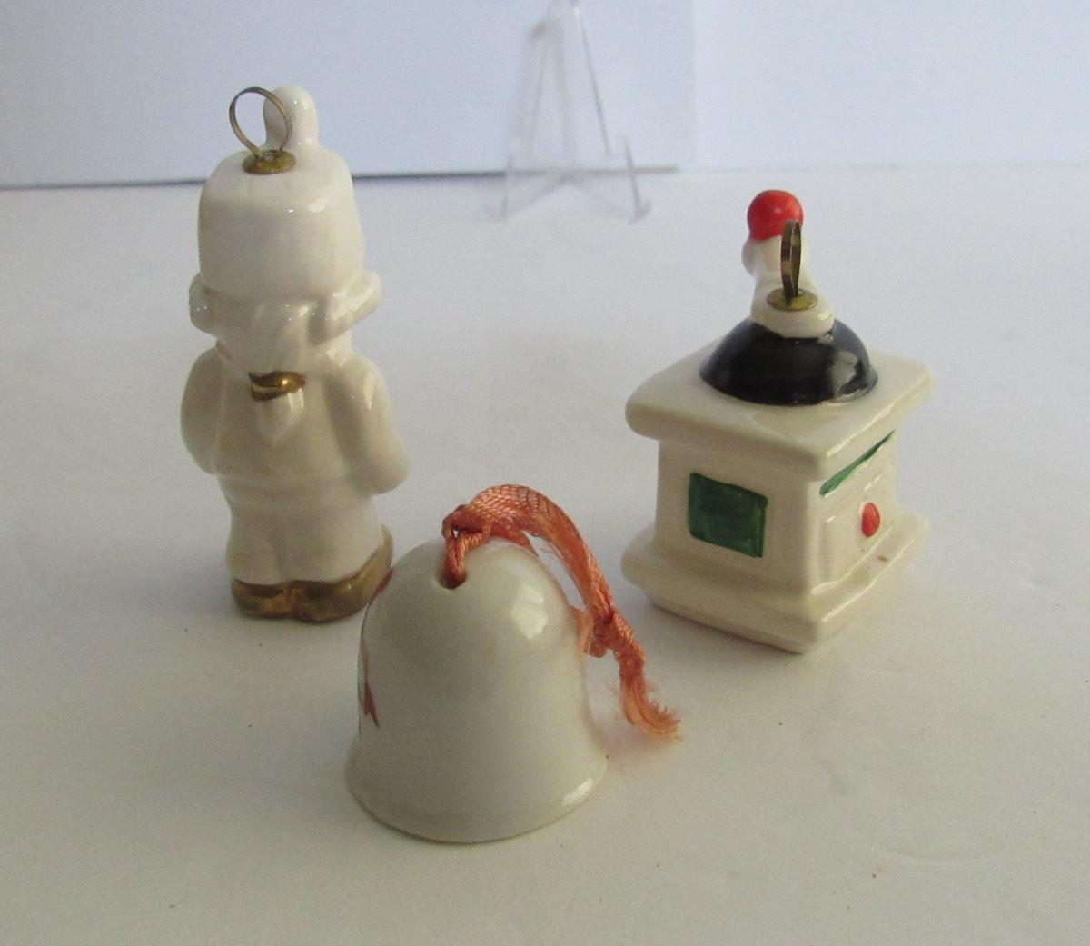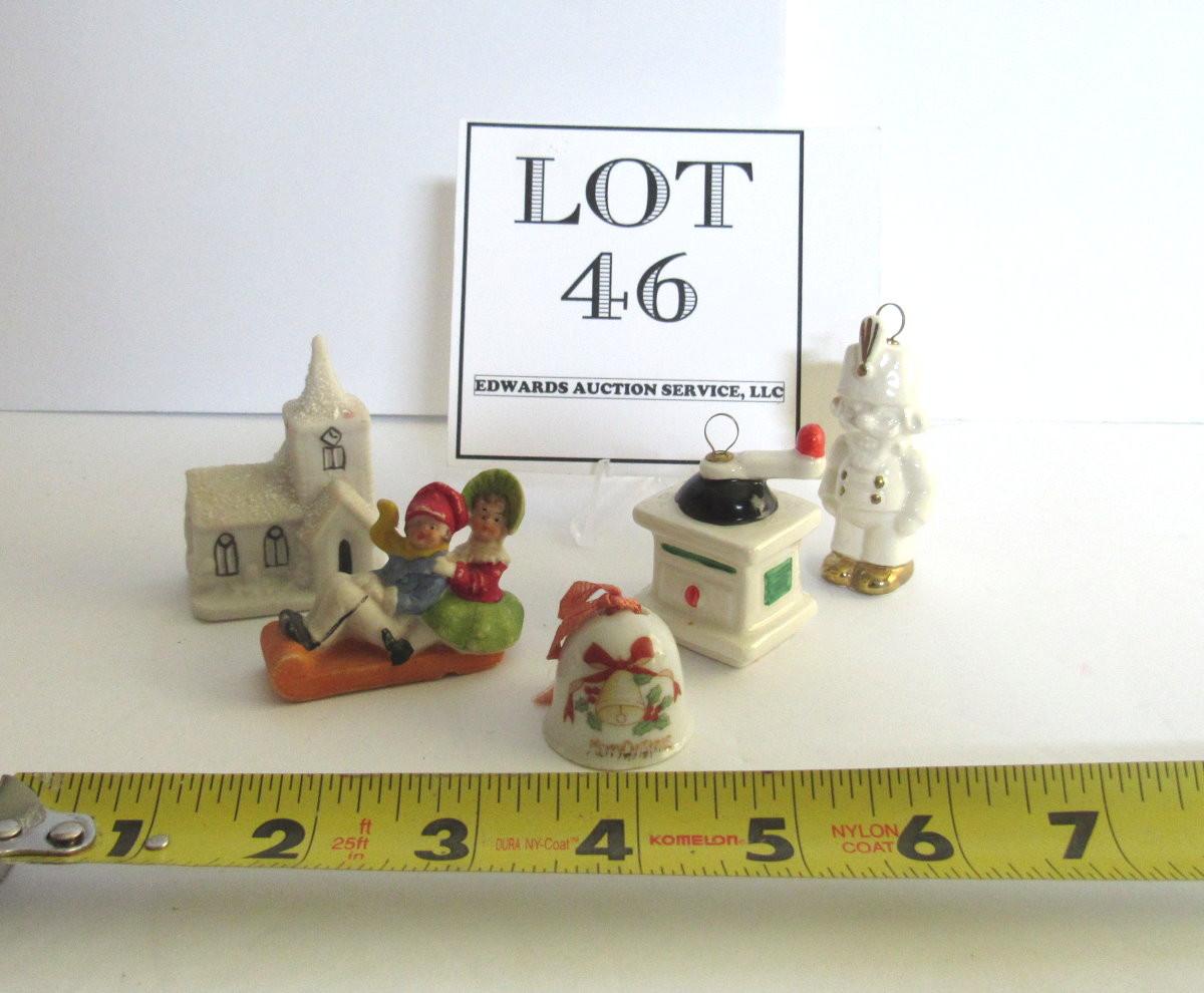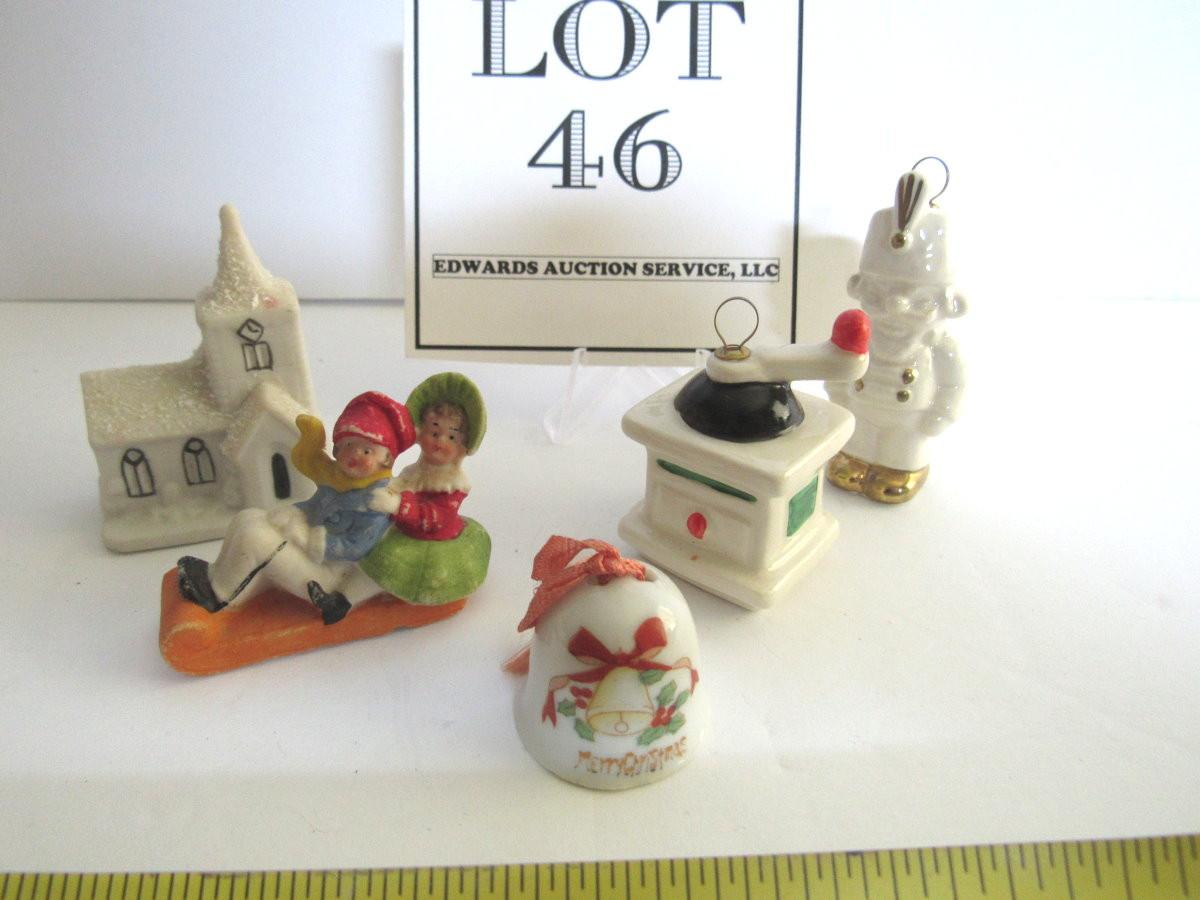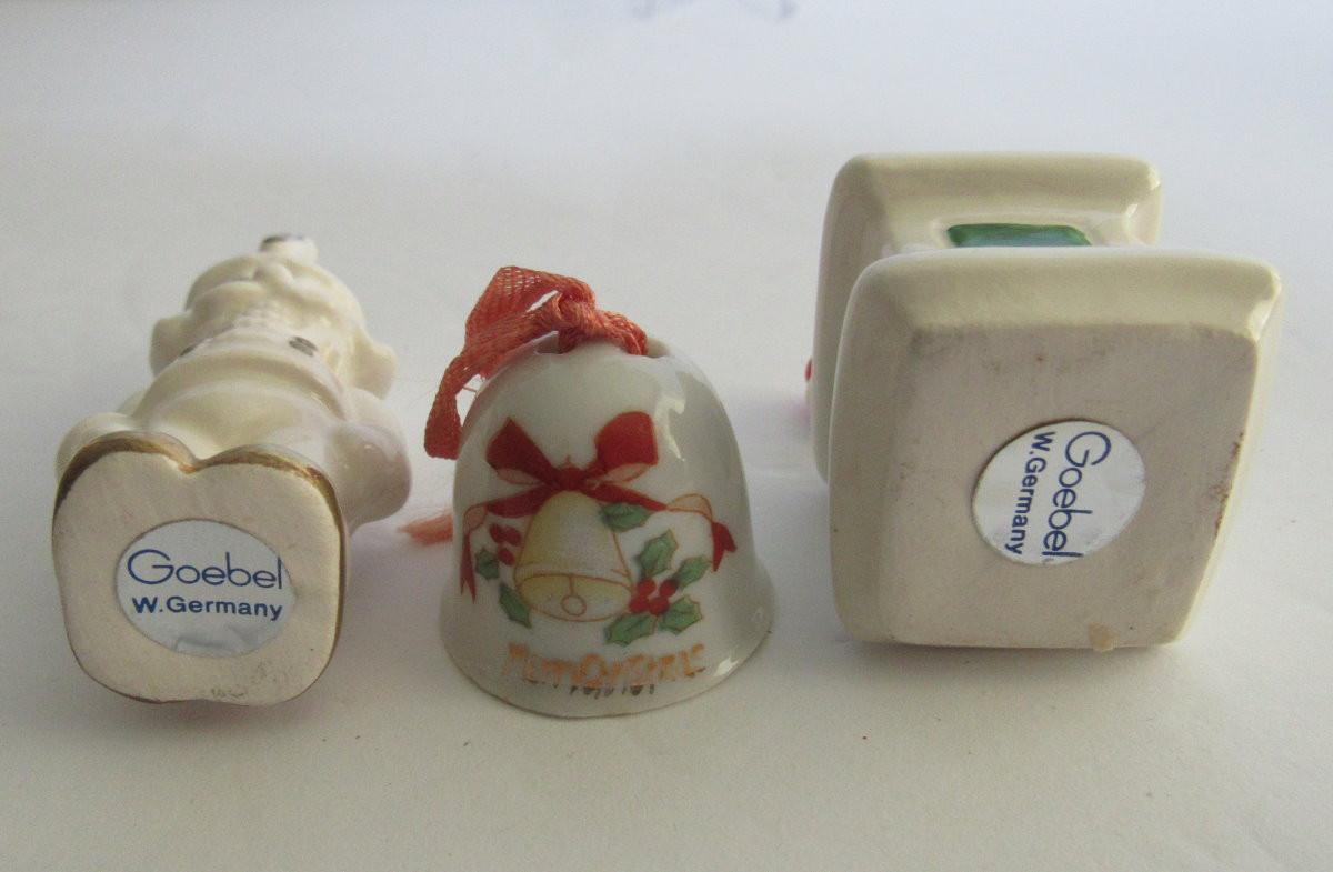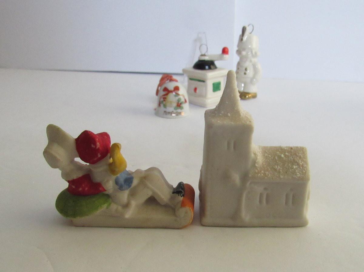 Lot of Small Vintage Christmas: German Figurine, Japan Bell, Snowy Church and 2 Goebel Germany