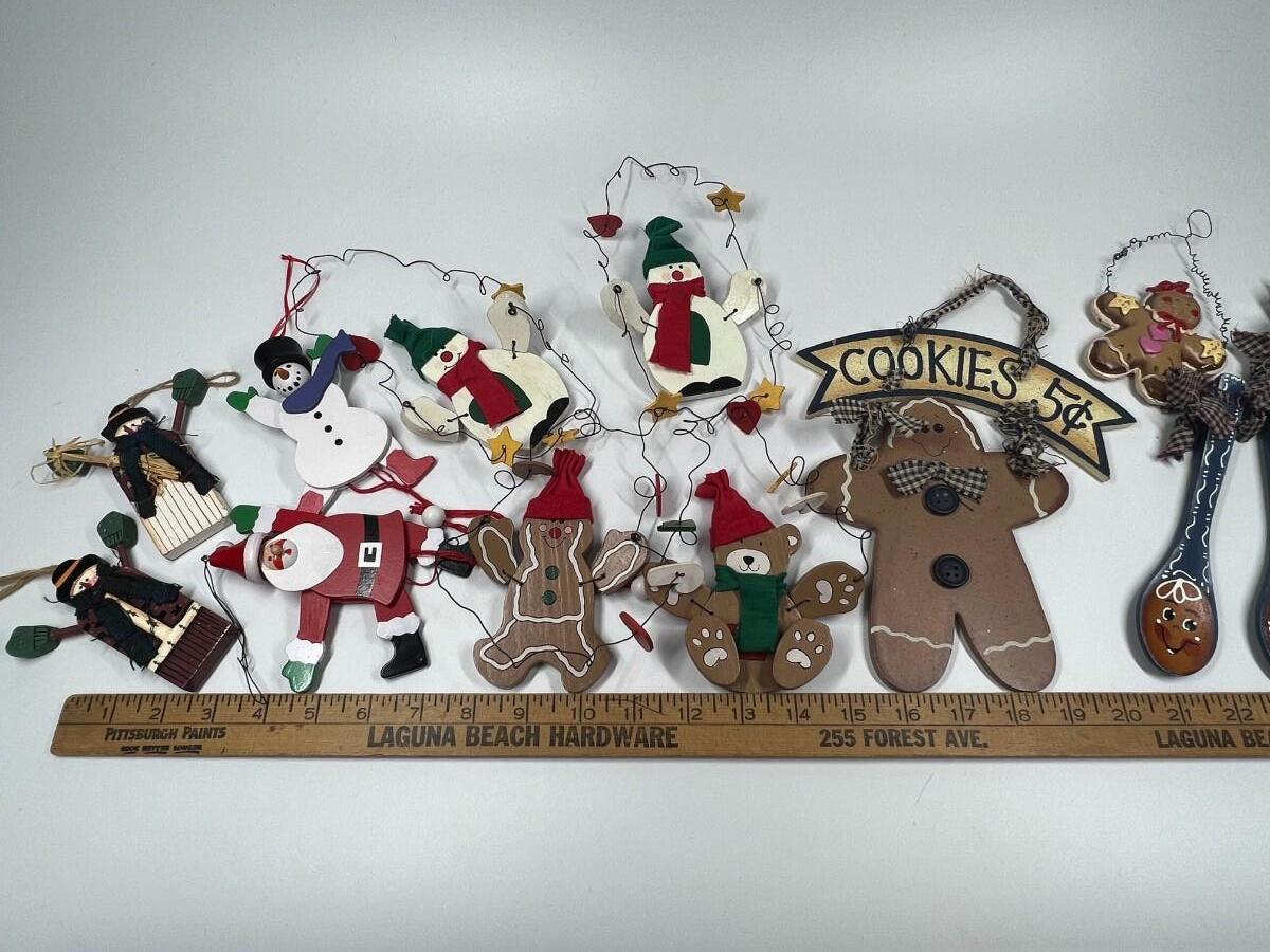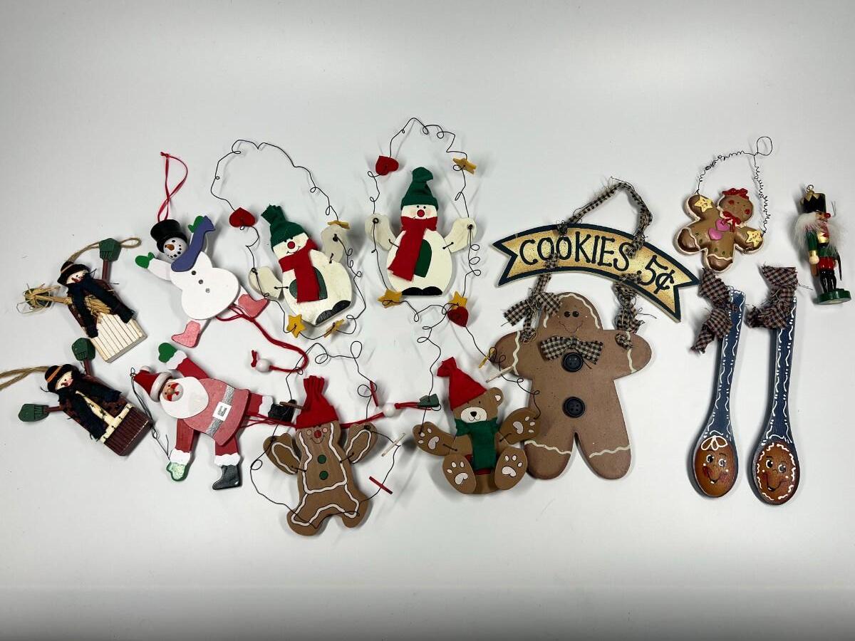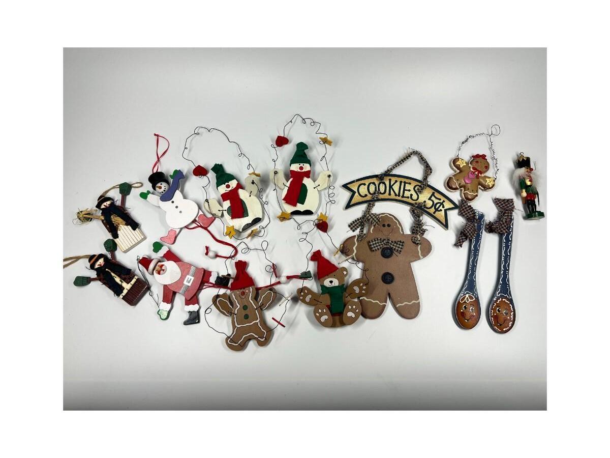 Lot of Small Wood Ornaments & Hanging Decor Gingerbread Men, Snowmen, Santa Claus & More