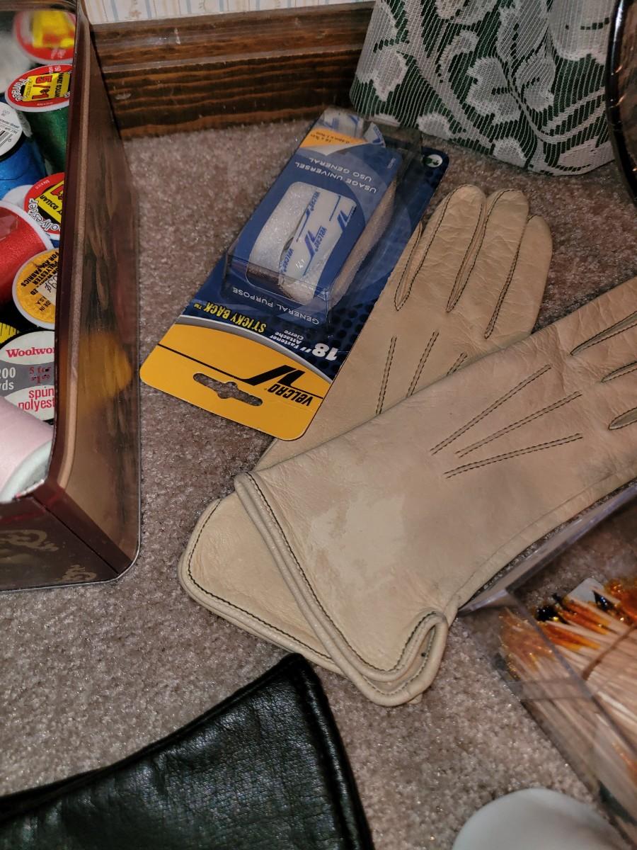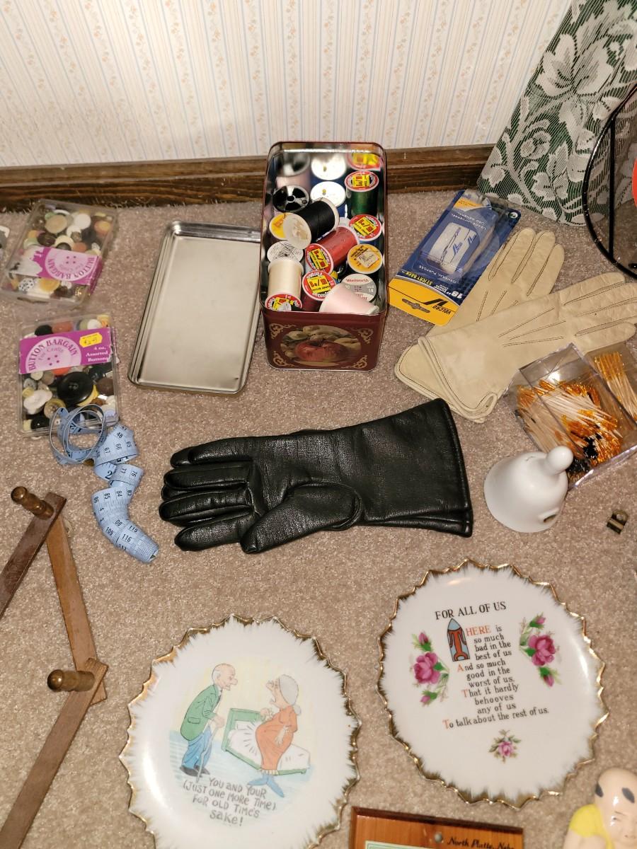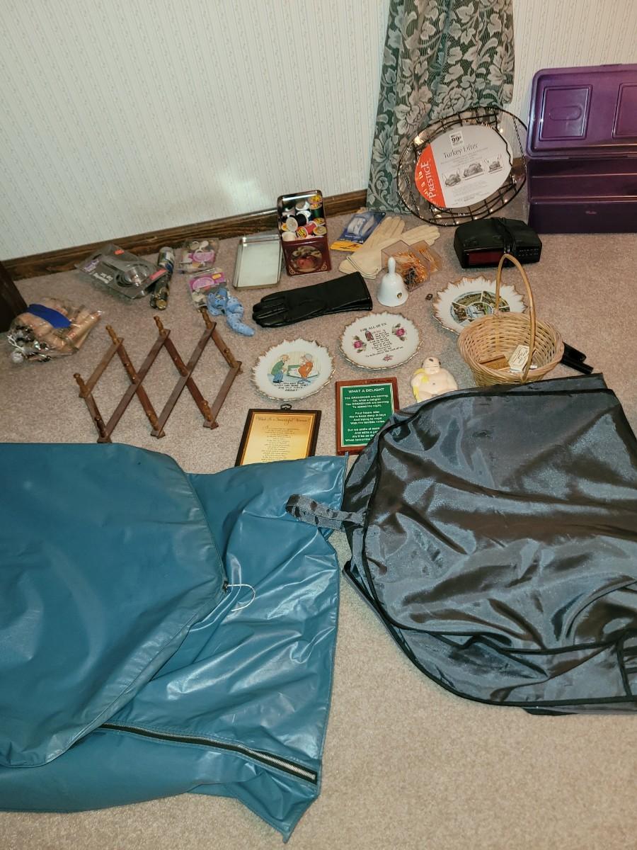 Everything pictured, sewing stuff, women's leather gloves, two garment bags, 2 small flashlights and a bunch more small items