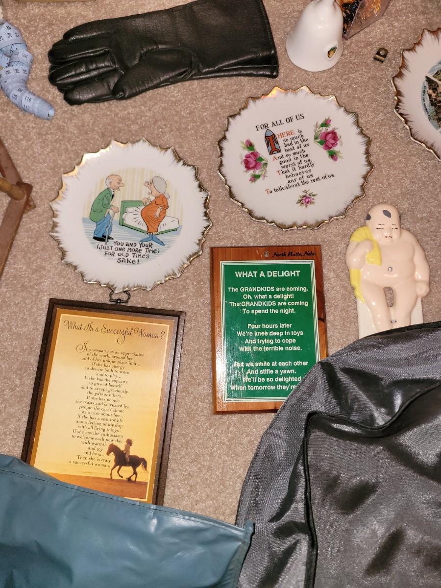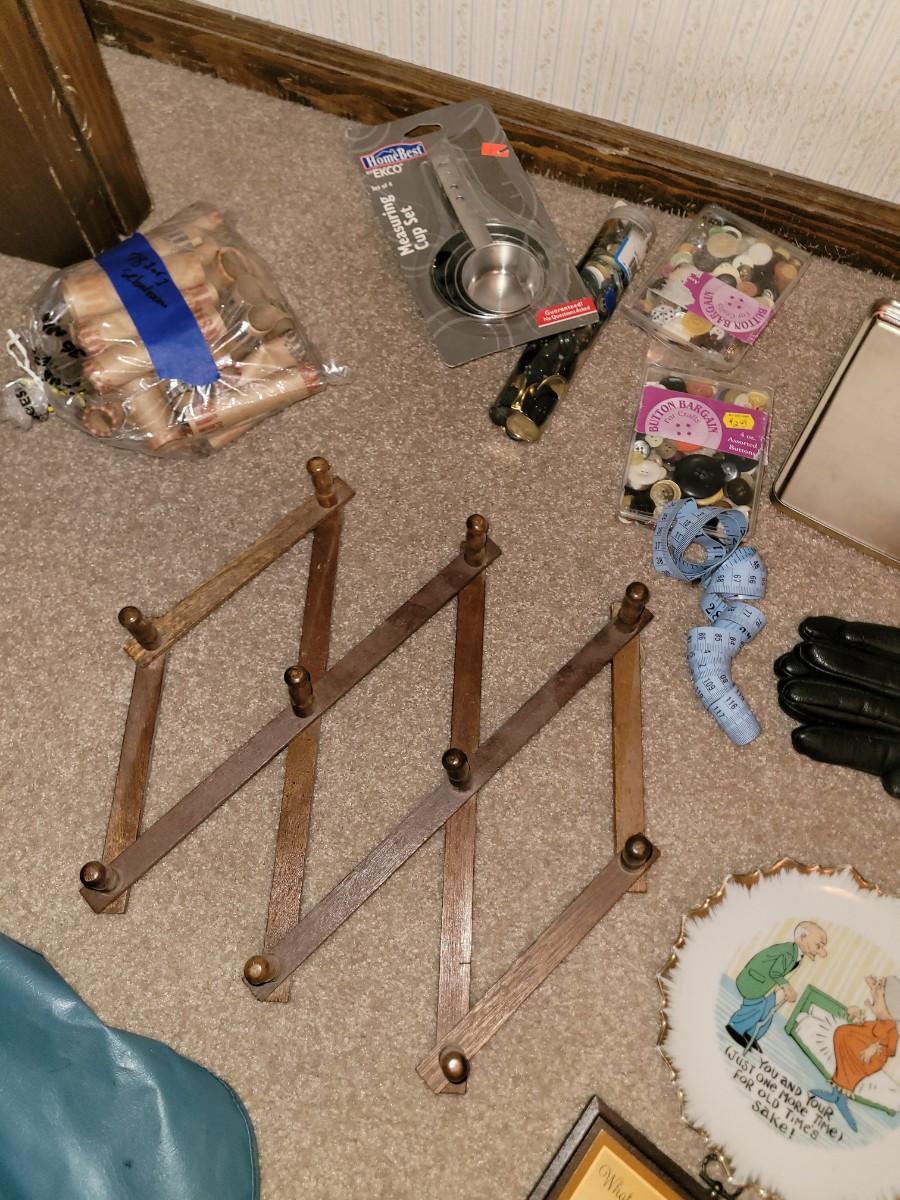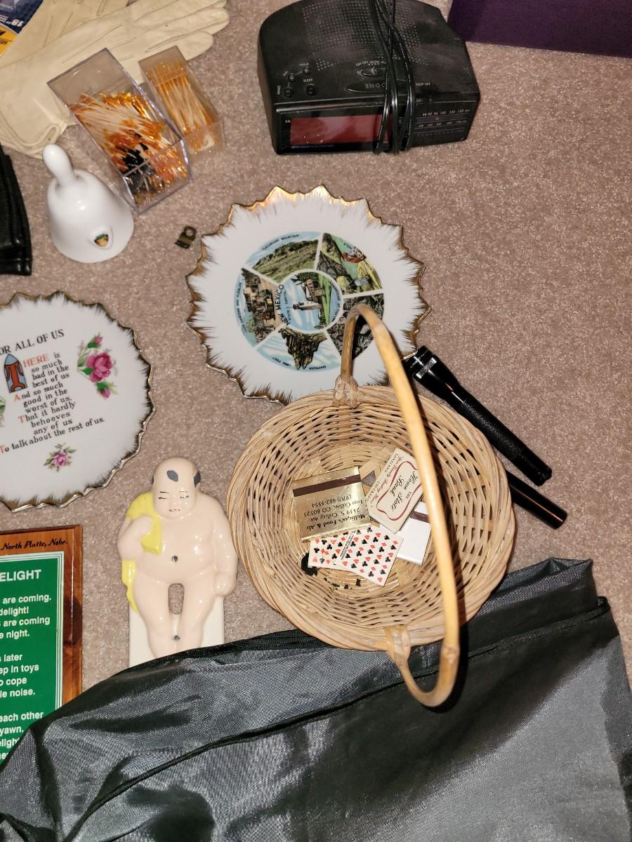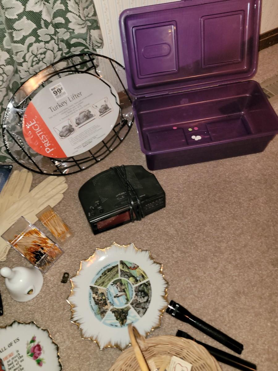 Everything pictured, sewing stuff, women's leather gloves, two garment bags, 2 small flashlights and a bunch more small items