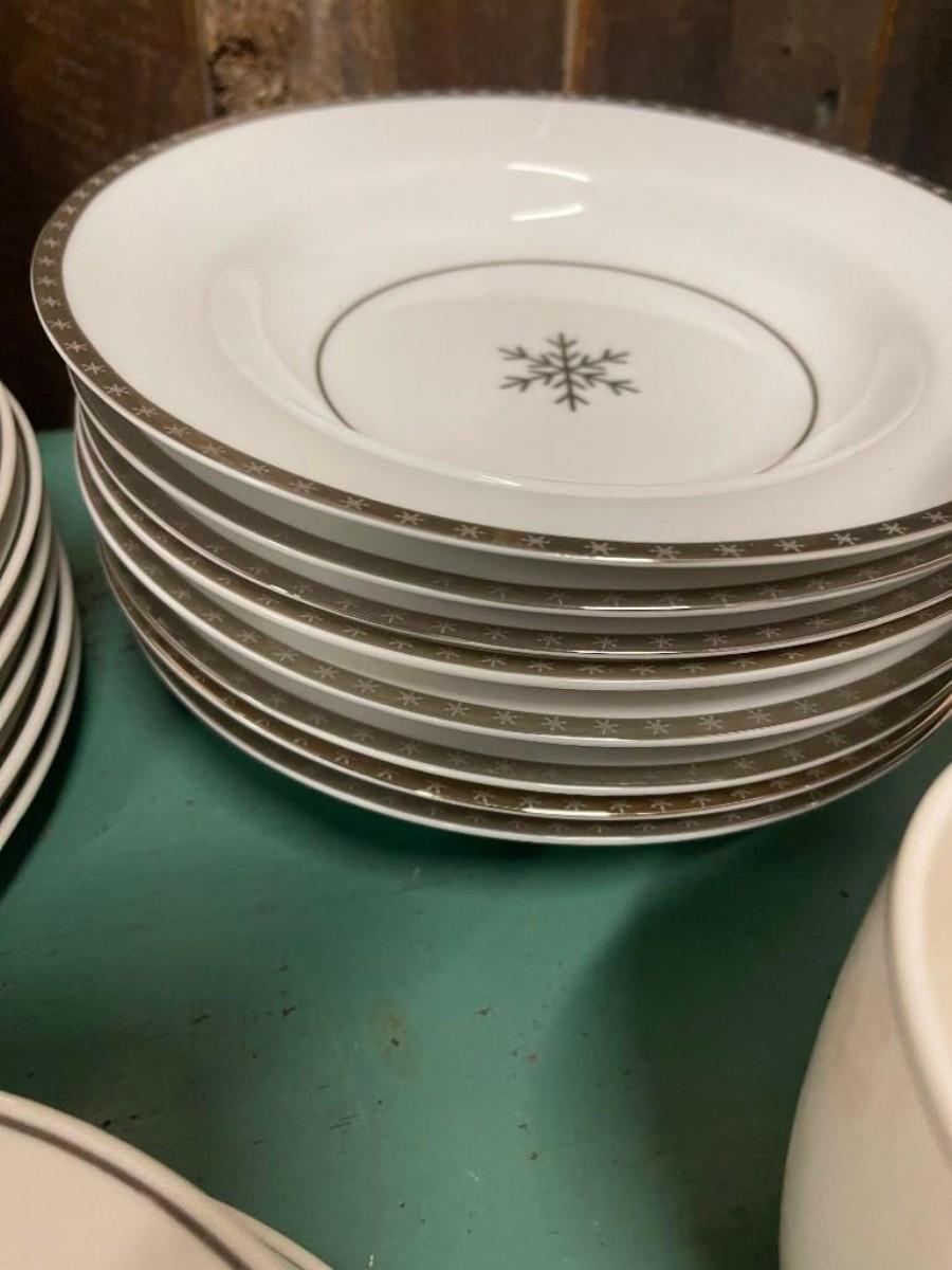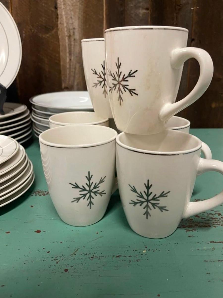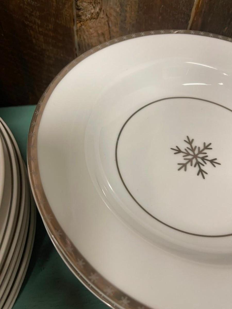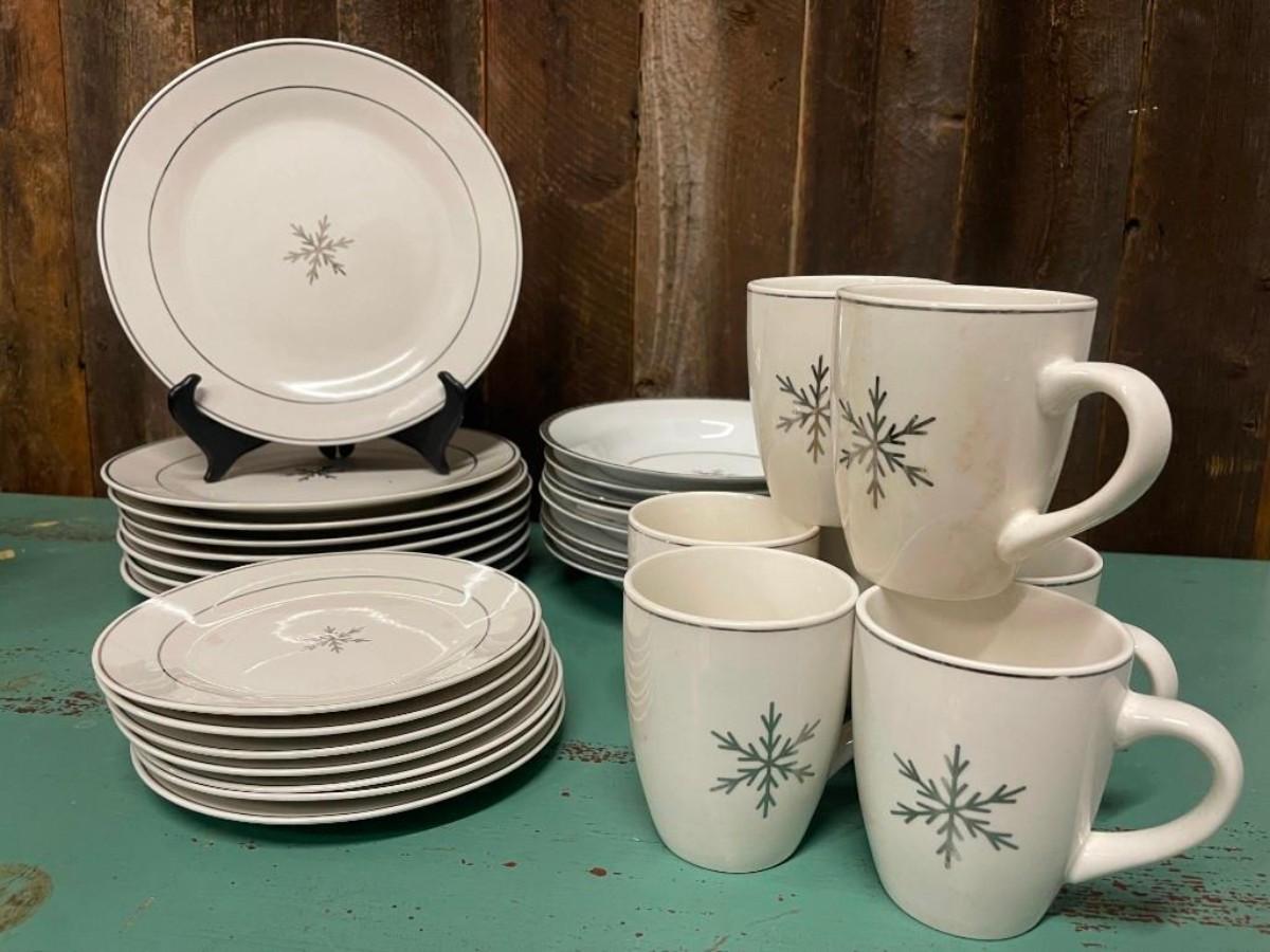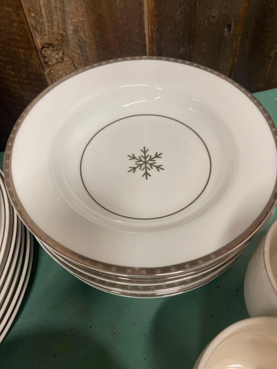 Lot of snowflake dishes. Includes set of 6 mugs, 8 dinner plates and 7 salad/luncheon plates from the same set. Also includes 8 snowflake soup bowls from a different maker. Note that the set of snowflake plates and mugs is more of an ivory and the bowls are more white.