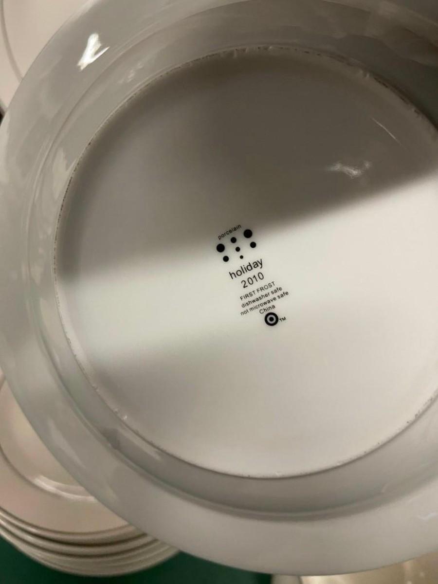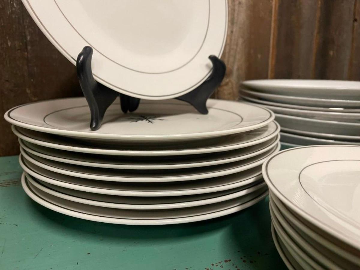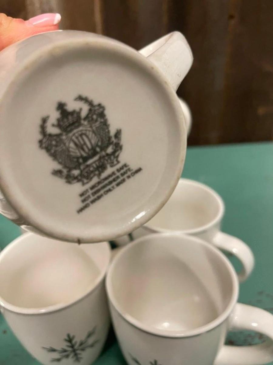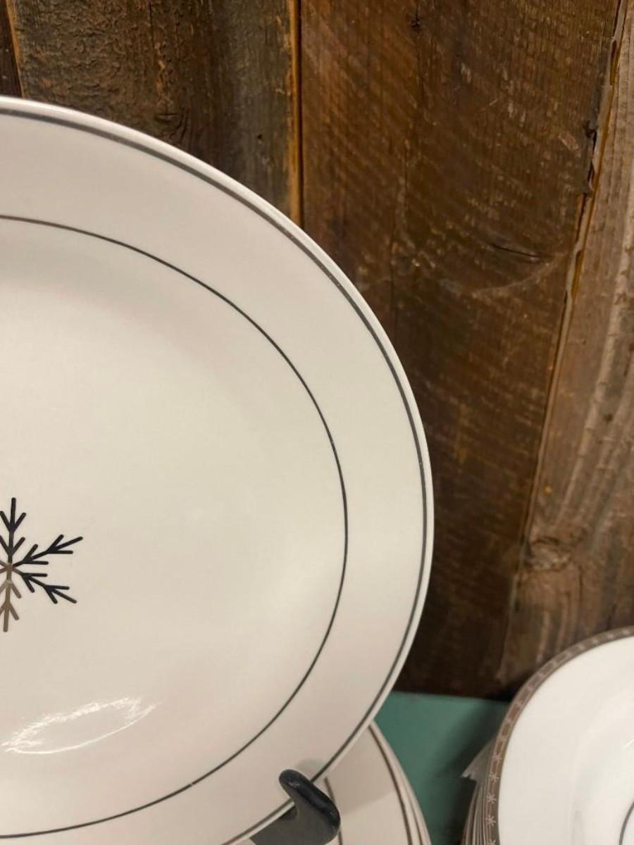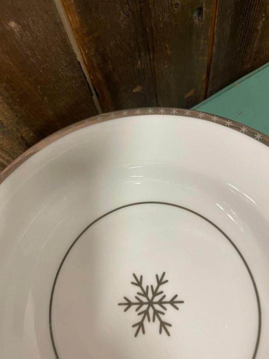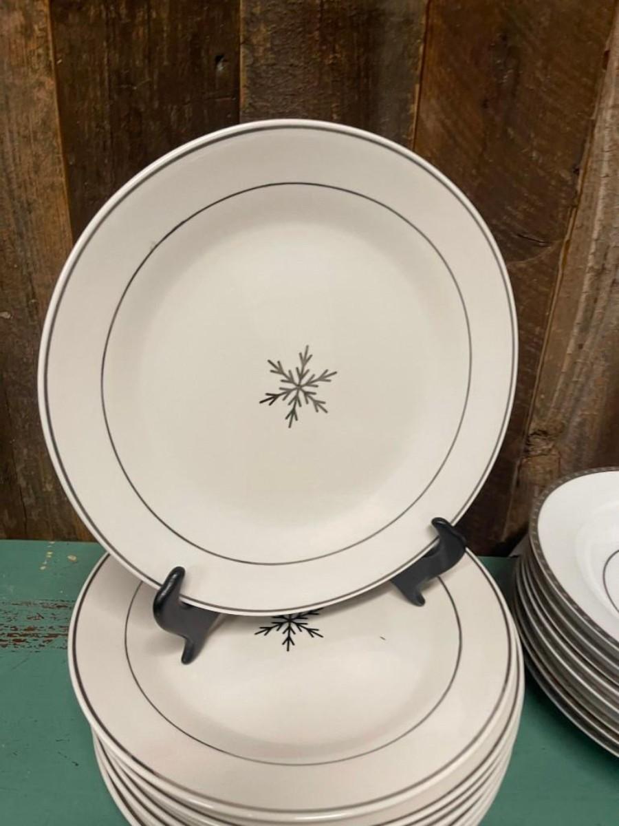 Lot of snowflake dishes. Includes set of 6 mugs, 8 dinner plates and 7 salad/luncheon plates from the same set. Also includes 8 snowflake soup bowls from a different maker. Note that the set of snowflake plates and mugs is more of an ivory and the bowls are more white.