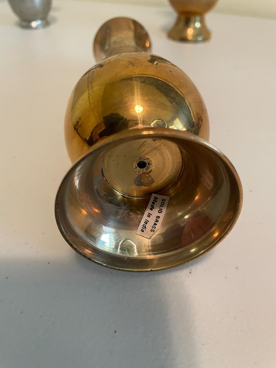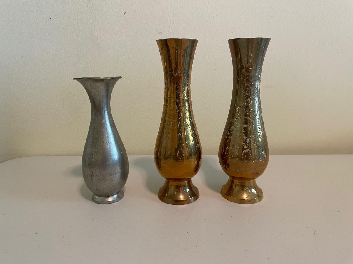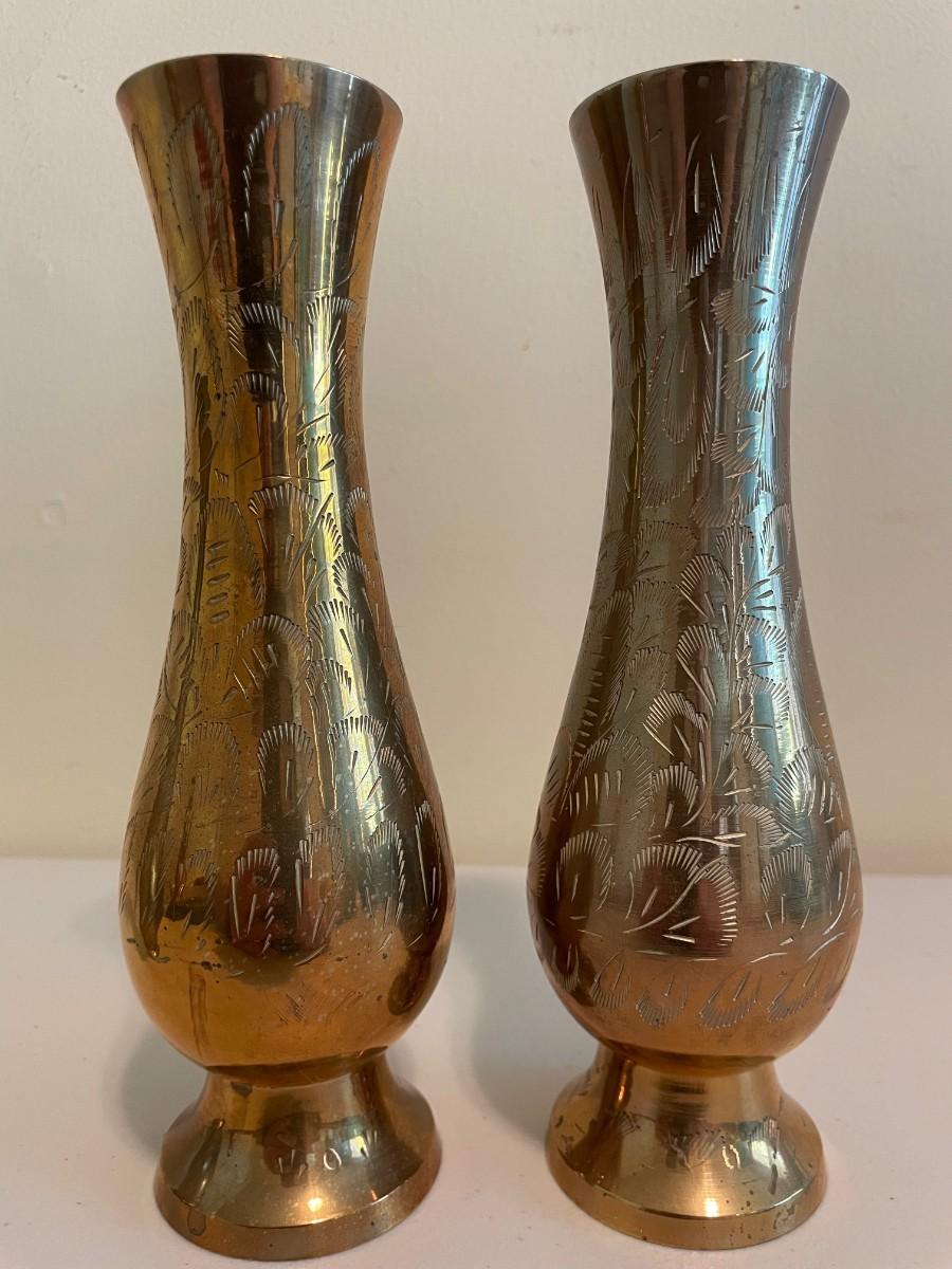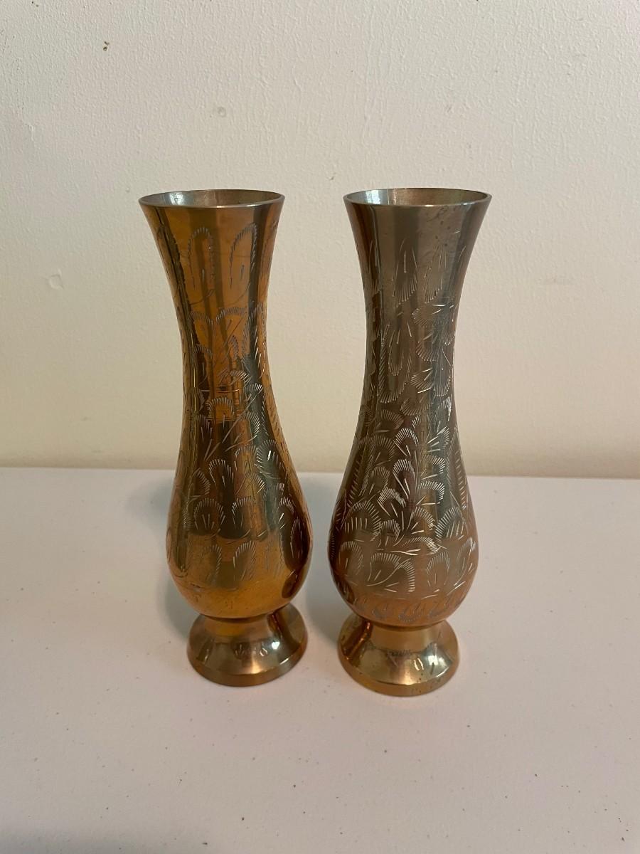 Set of Vintage solid brass etched brass vase 8in tall and single brass vase 6” tall