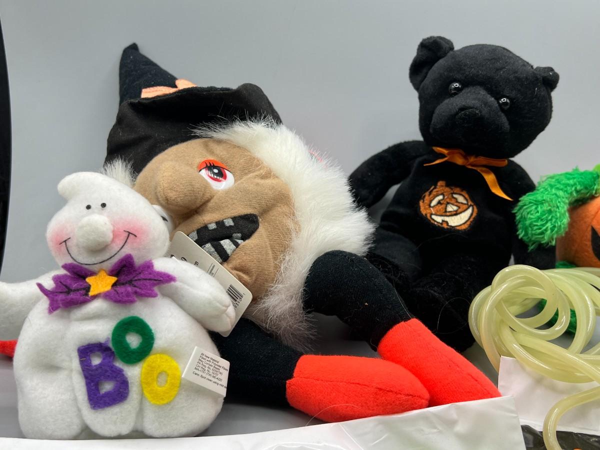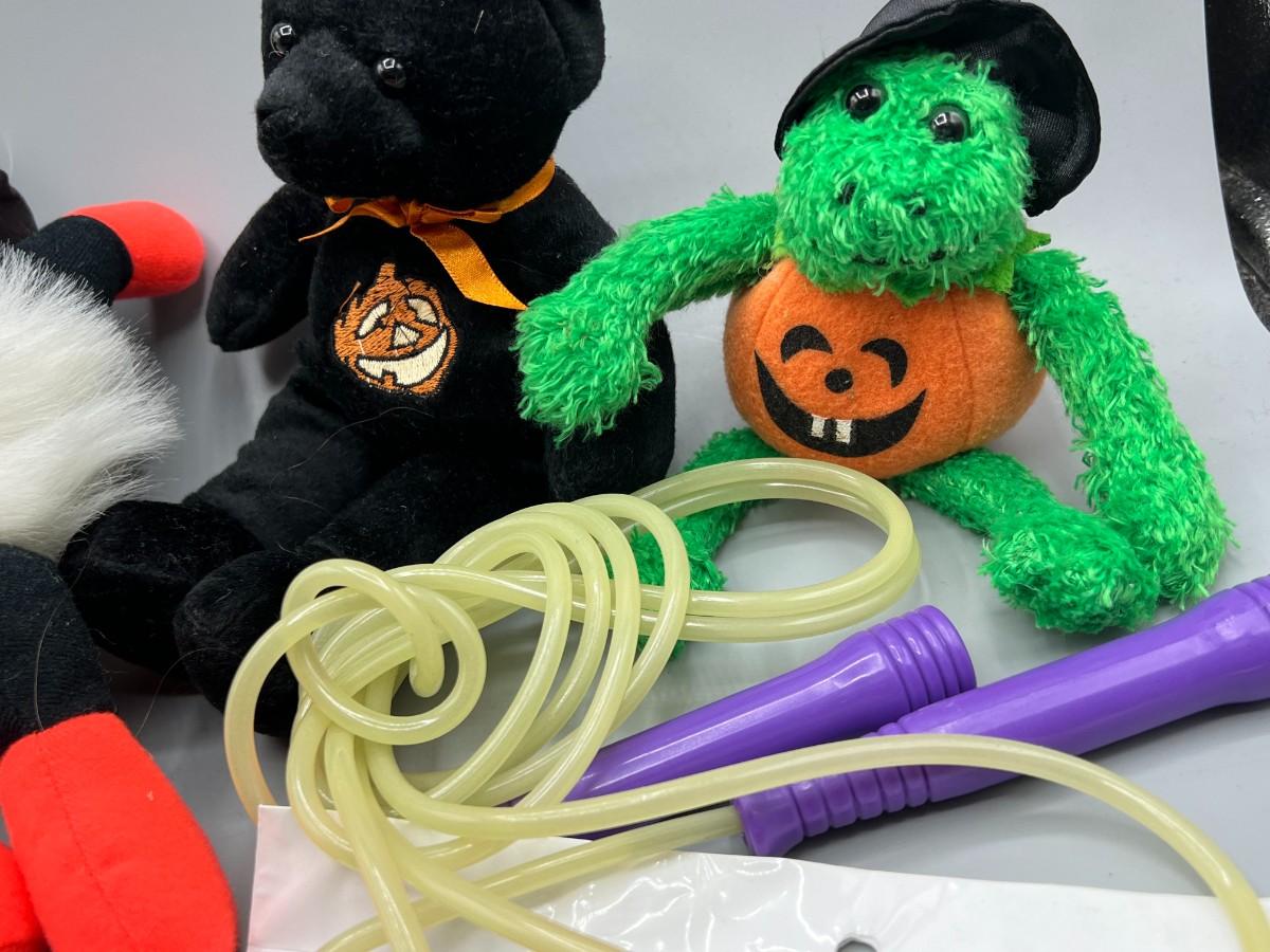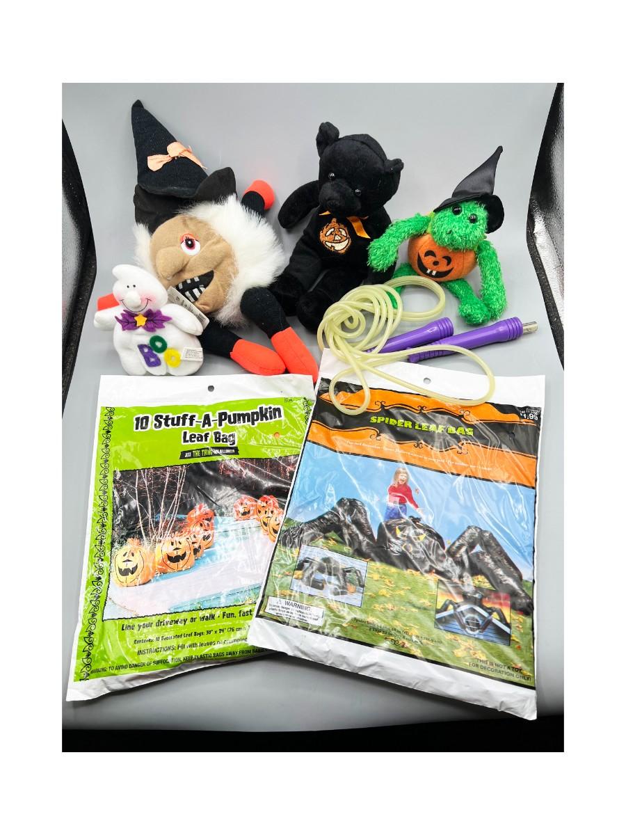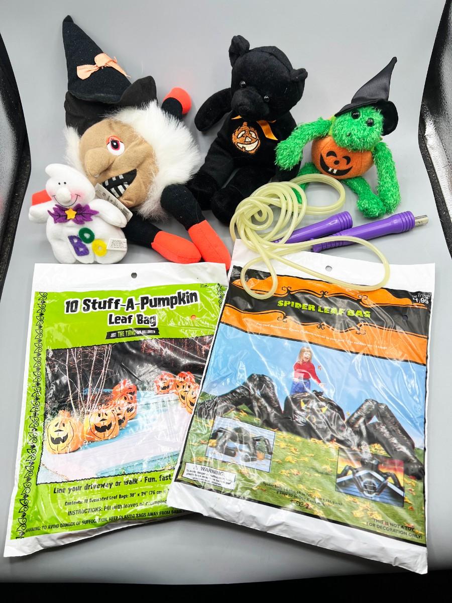 Lot of Spooky Halloween Plushies Decorations Leaf Bag, Jump Rope, Stuffed Animals & More