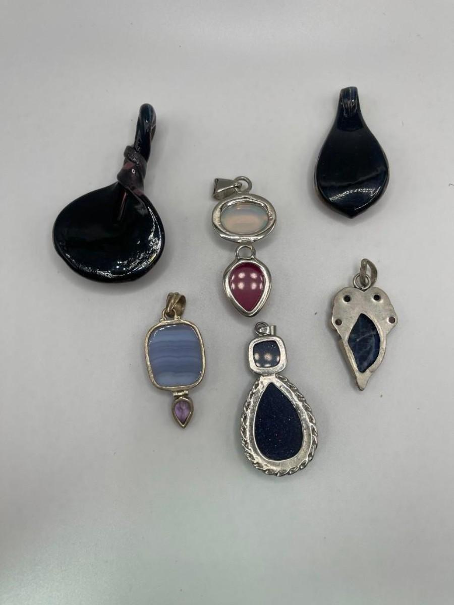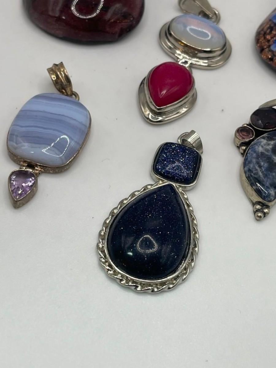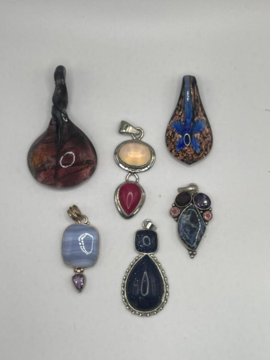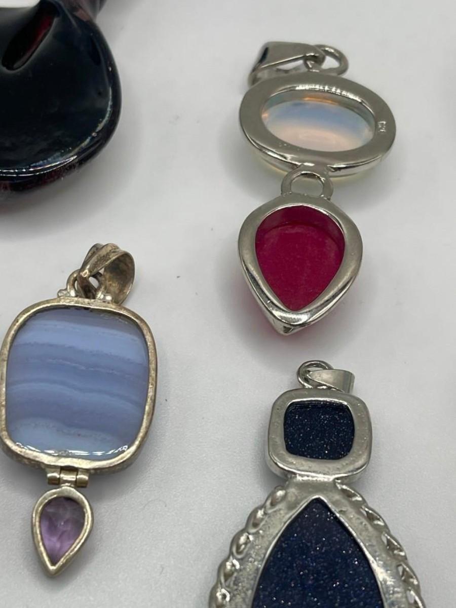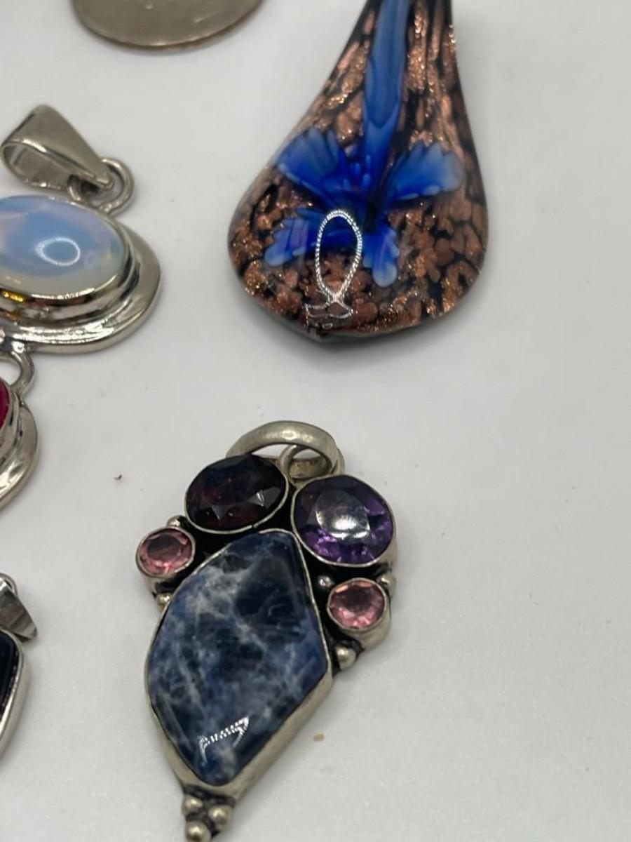 Lot of sterling silver pendants set with natural, simulated or manipulated stones along with a couple of art glass pieces. Please examine photos carefully.