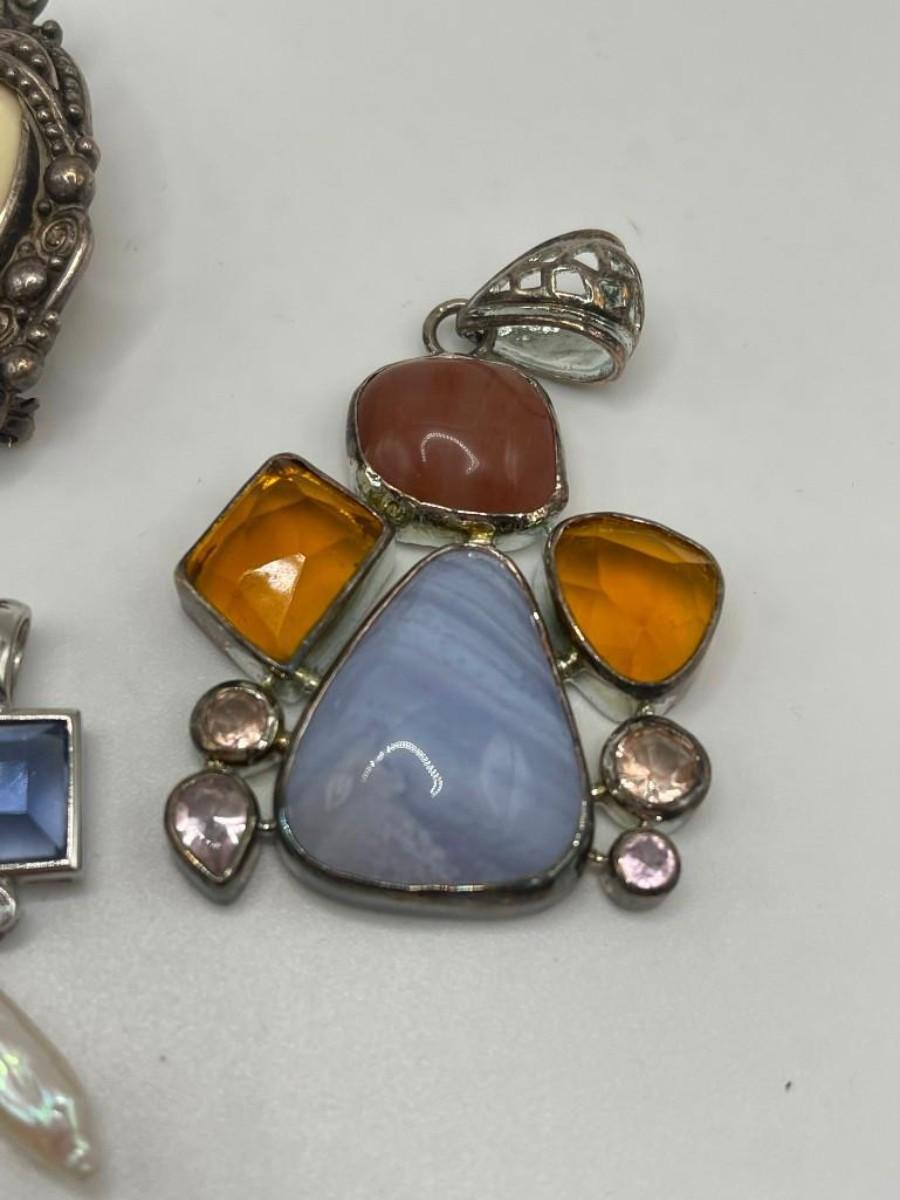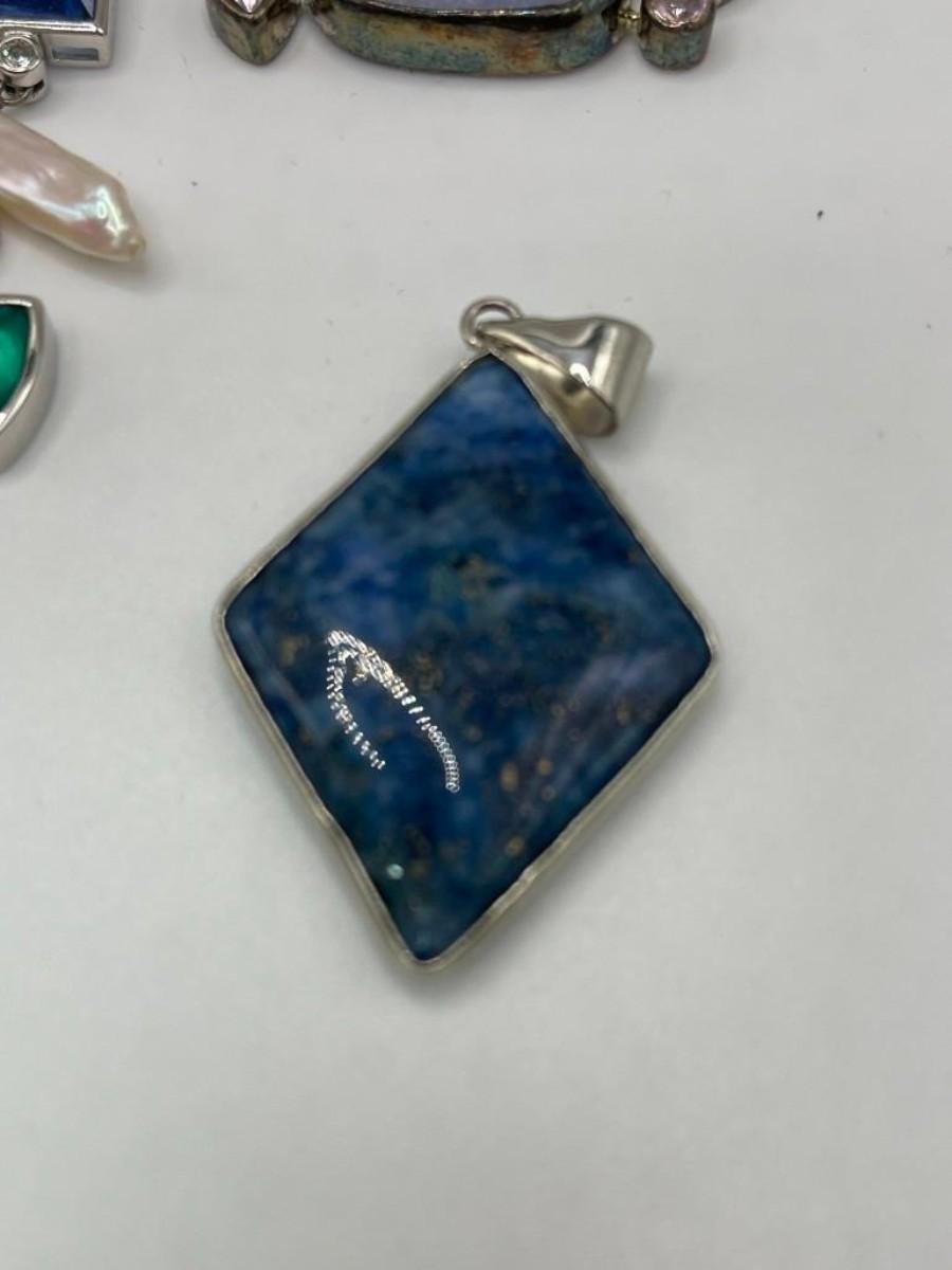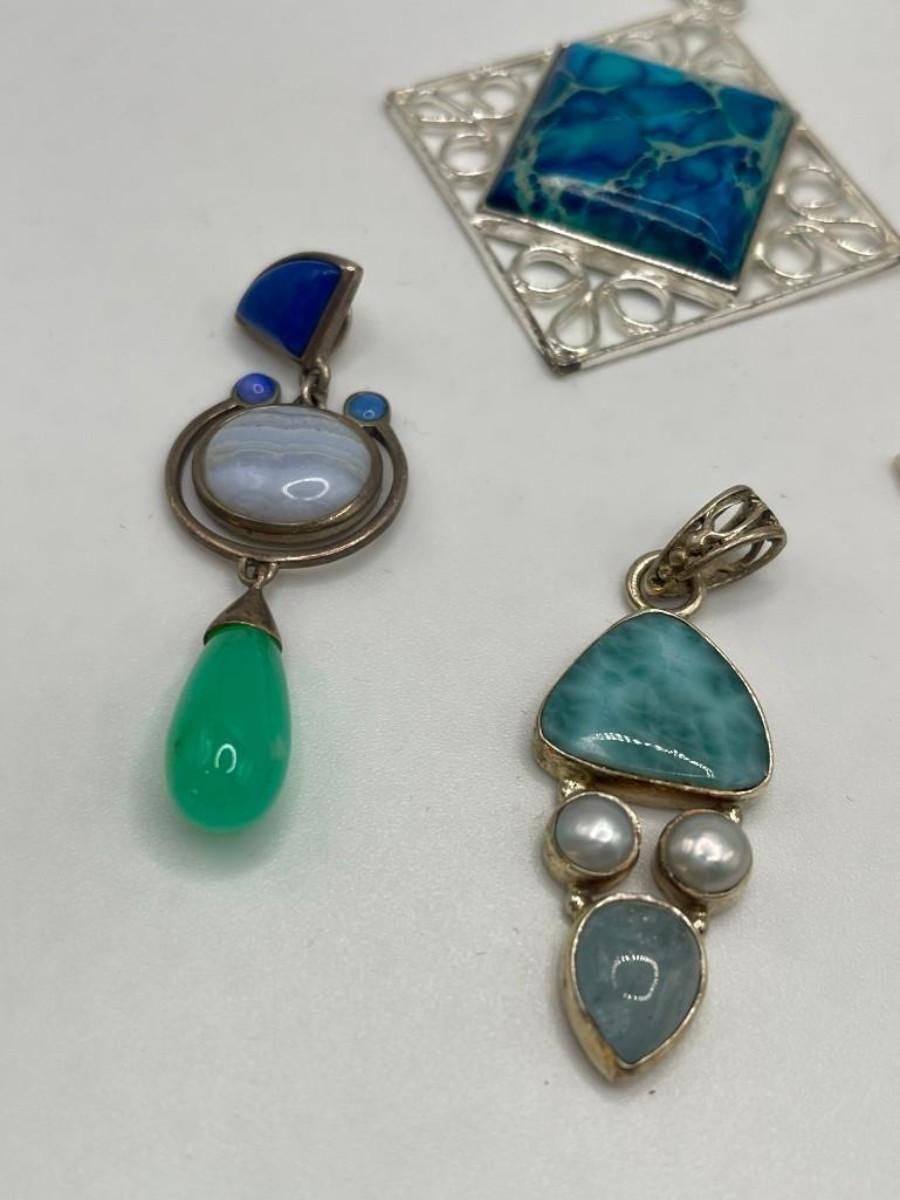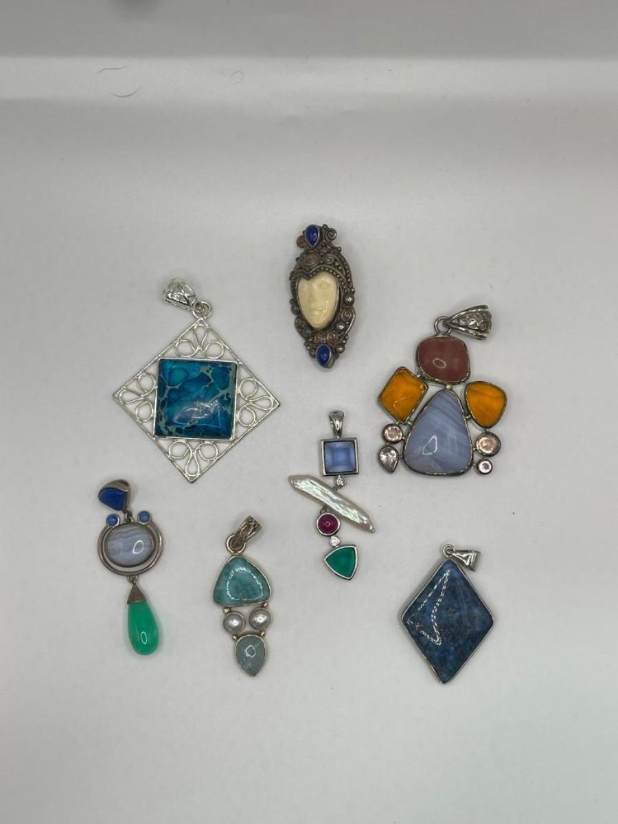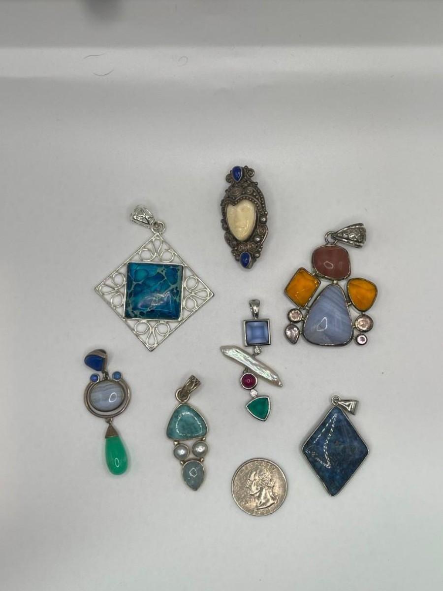 Lot of sterling silver pendants set with natural, simulated or manipulated stones along with a couple of pure costume jewelry pieces.  Please examine photos carefully.