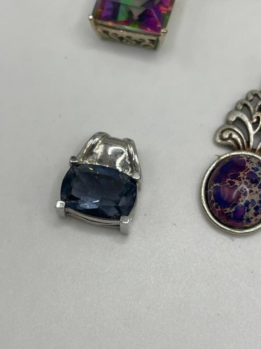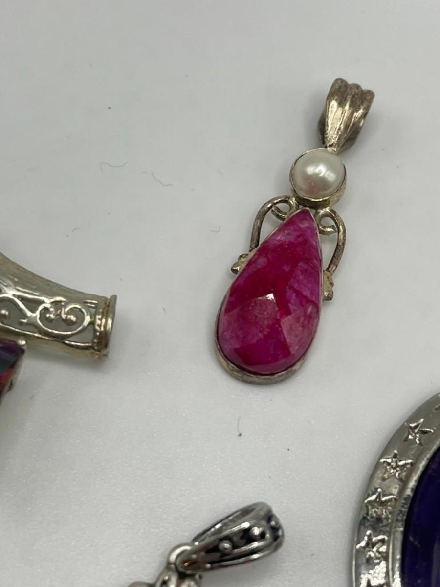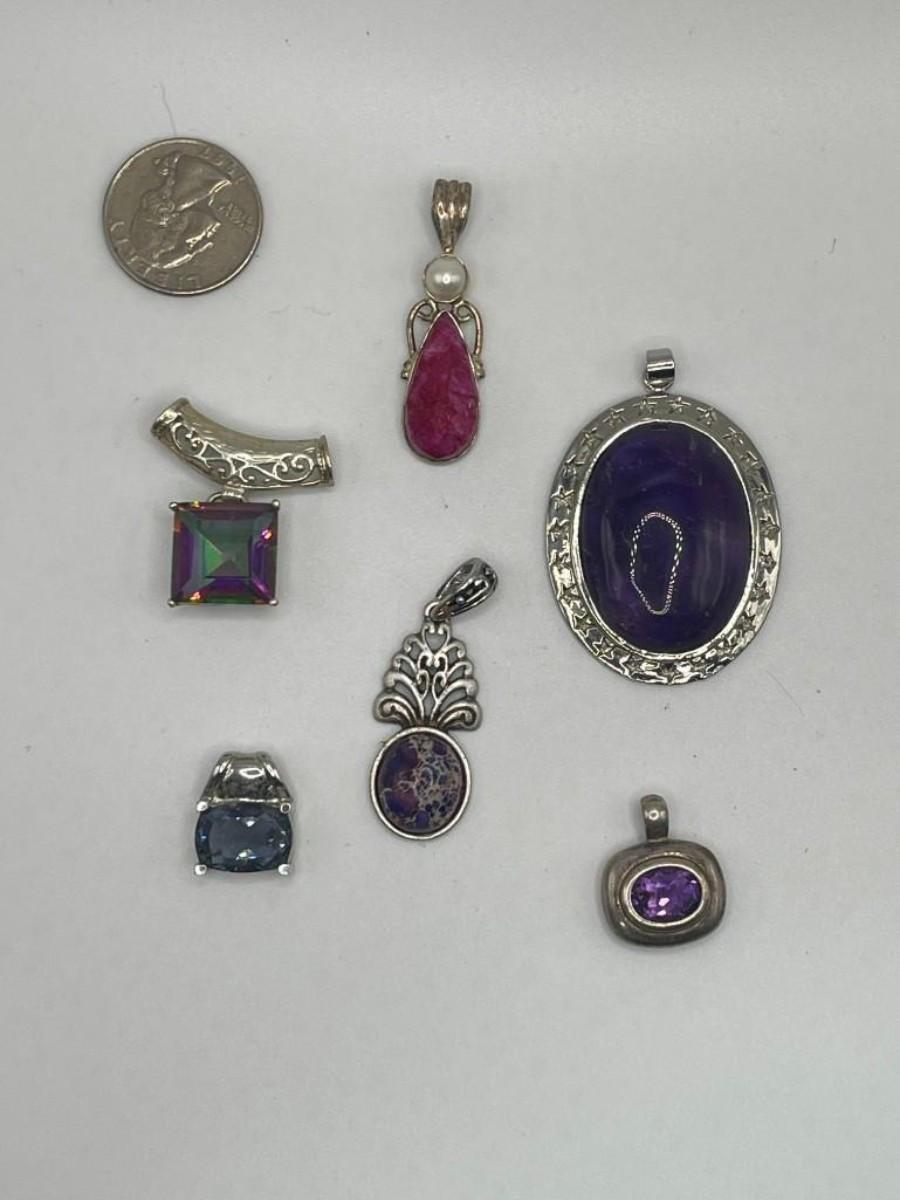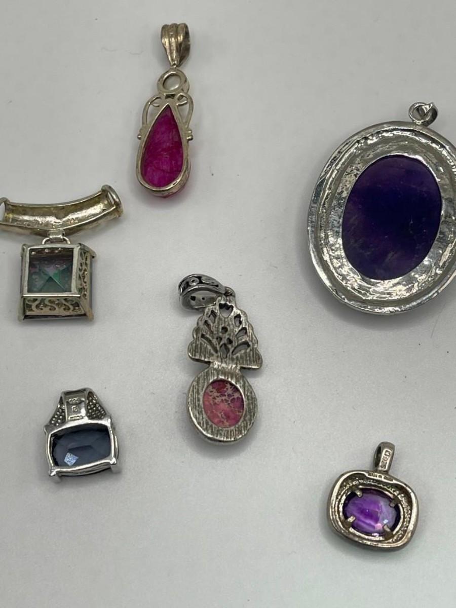 Lot of sterling silver pendants set with natural, simulated or manipulated stones along with a couple of pure costume jewelry pieces. Please examine photos carefully.