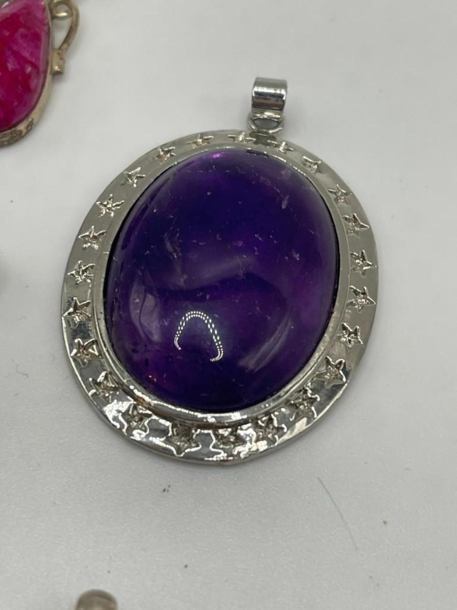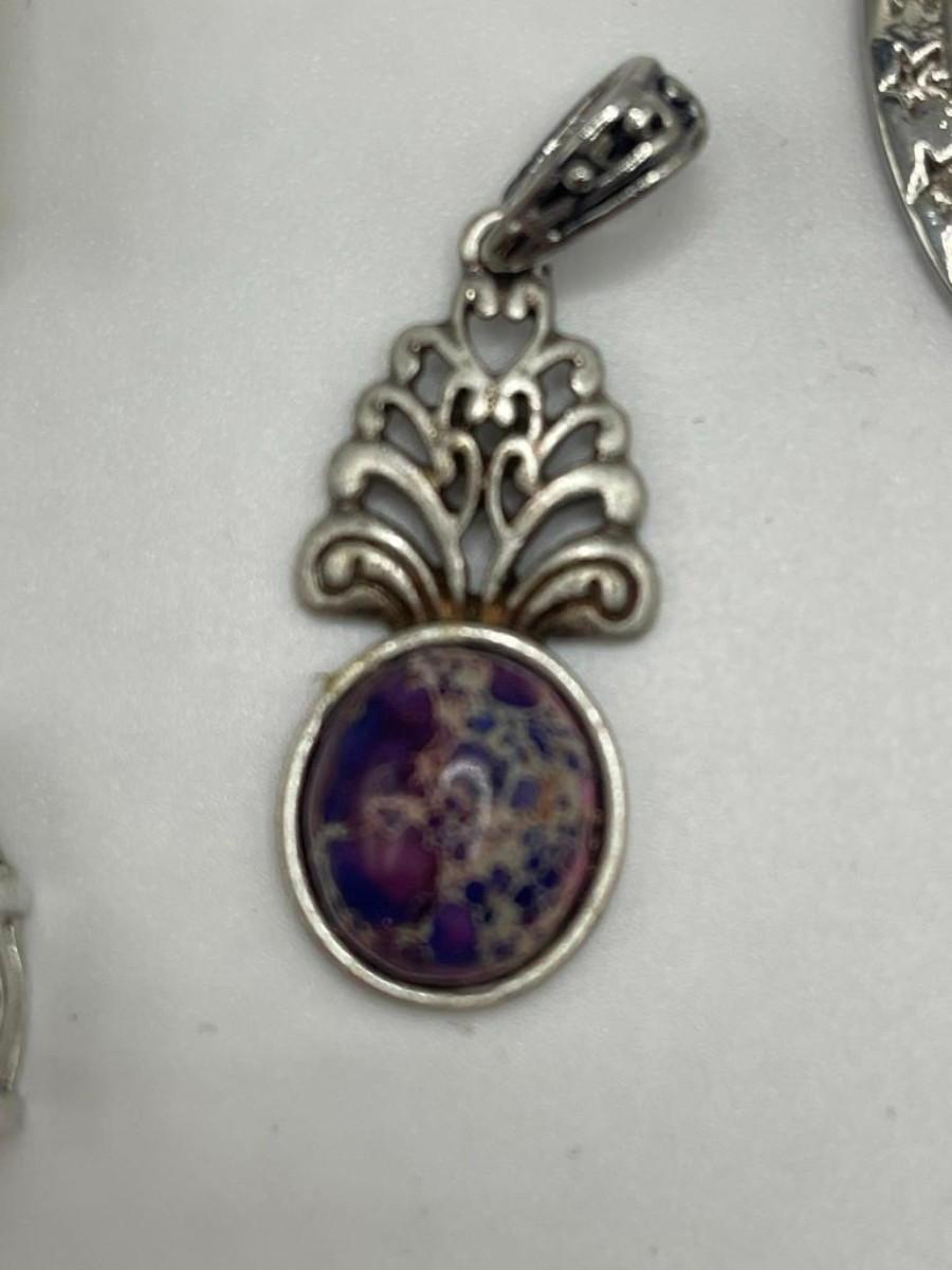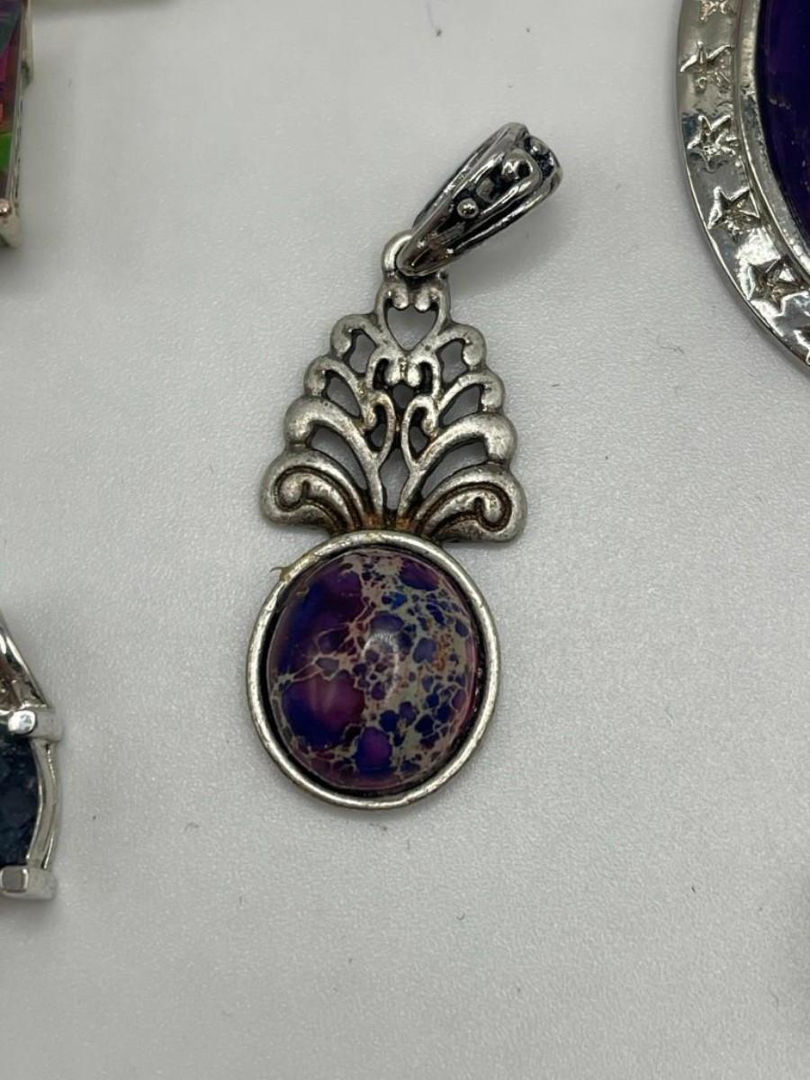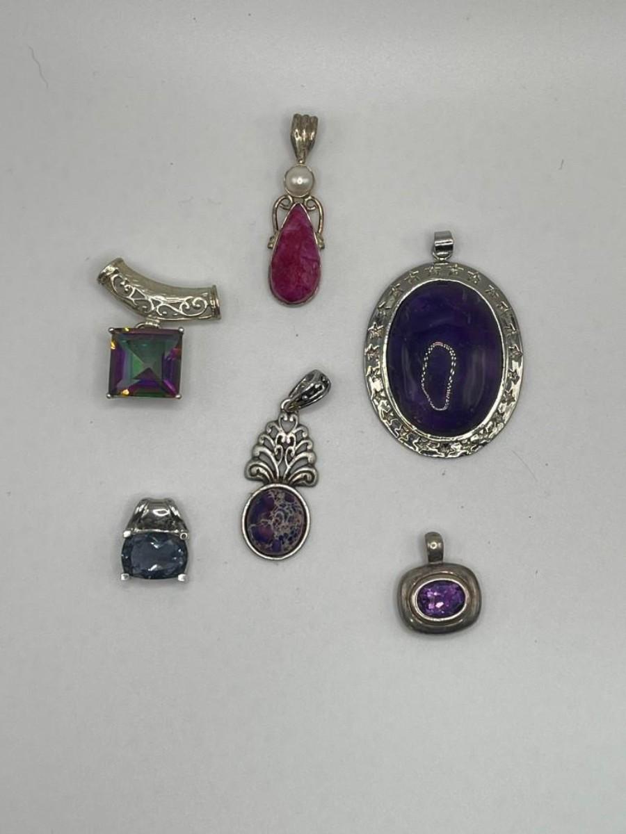 Lot of sterling silver pendants set with natural, simulated or manipulated stones along with a couple of pure costume jewelry pieces. Please examine photos carefully.