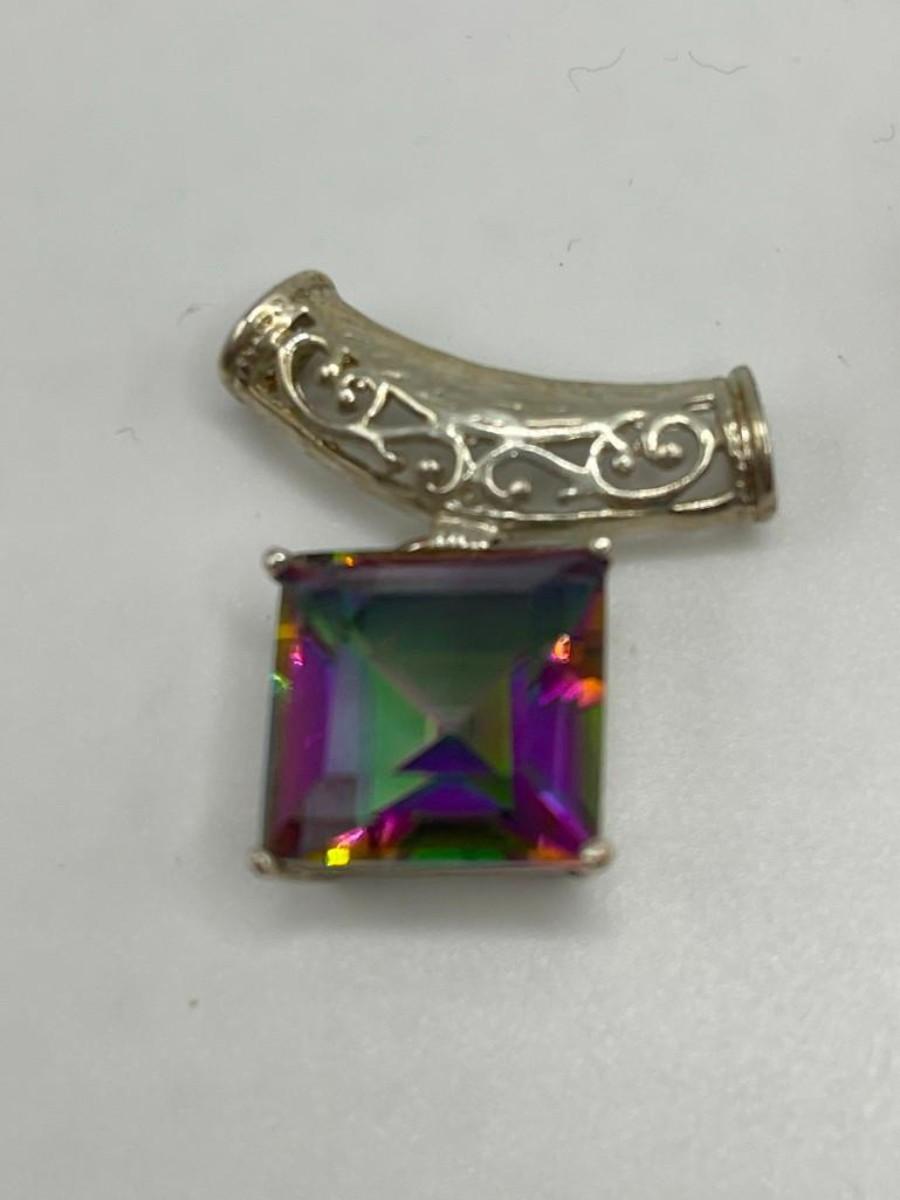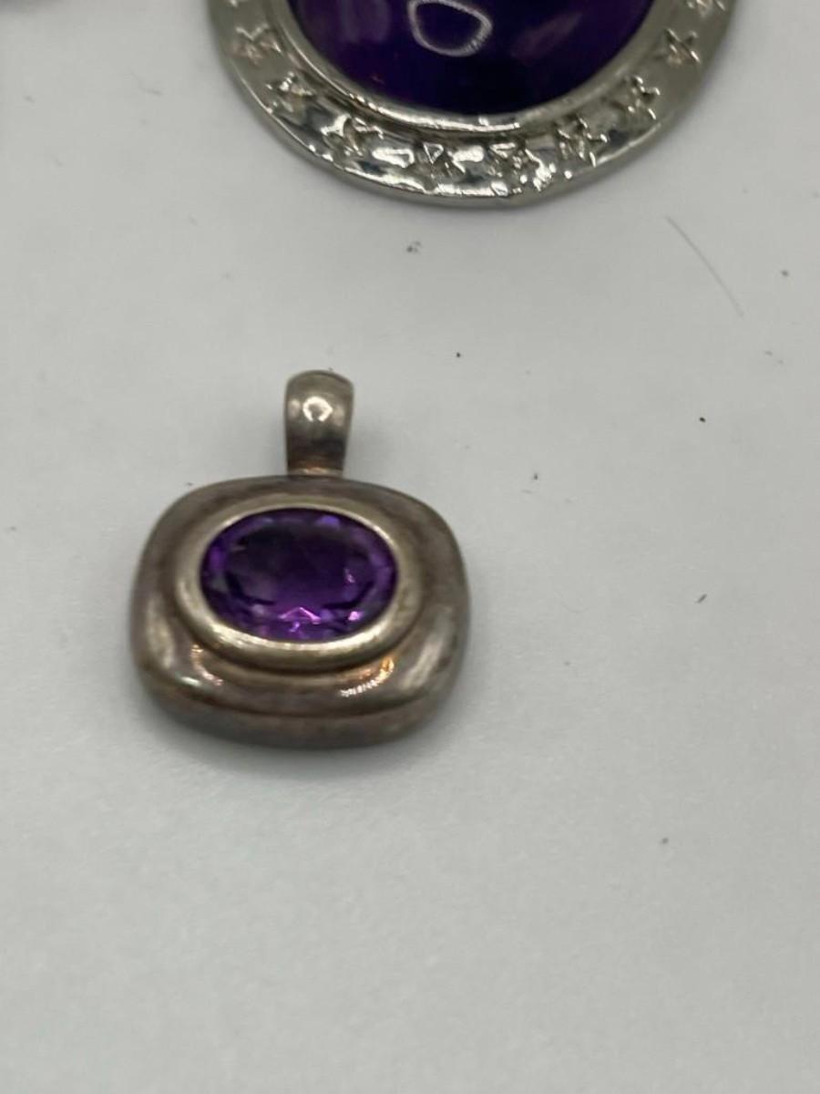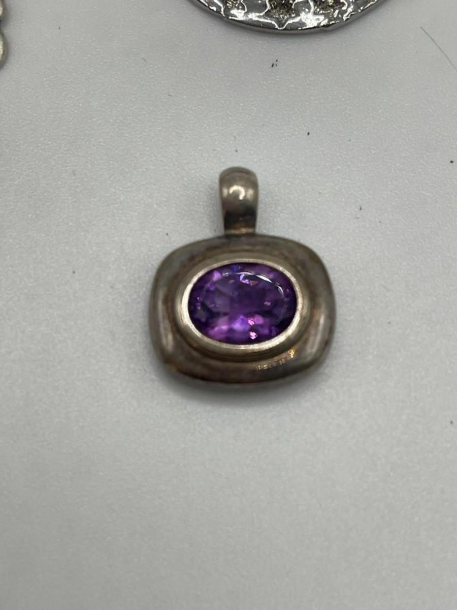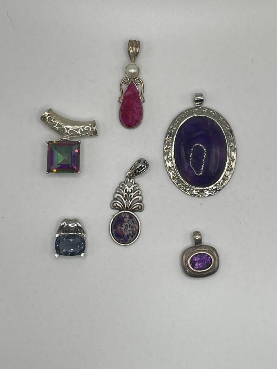 Lot of sterling silver pendants set with natural, simulated or manipulated stones along with a couple of pure costume jewelry pieces. Please examine photos carefully.
