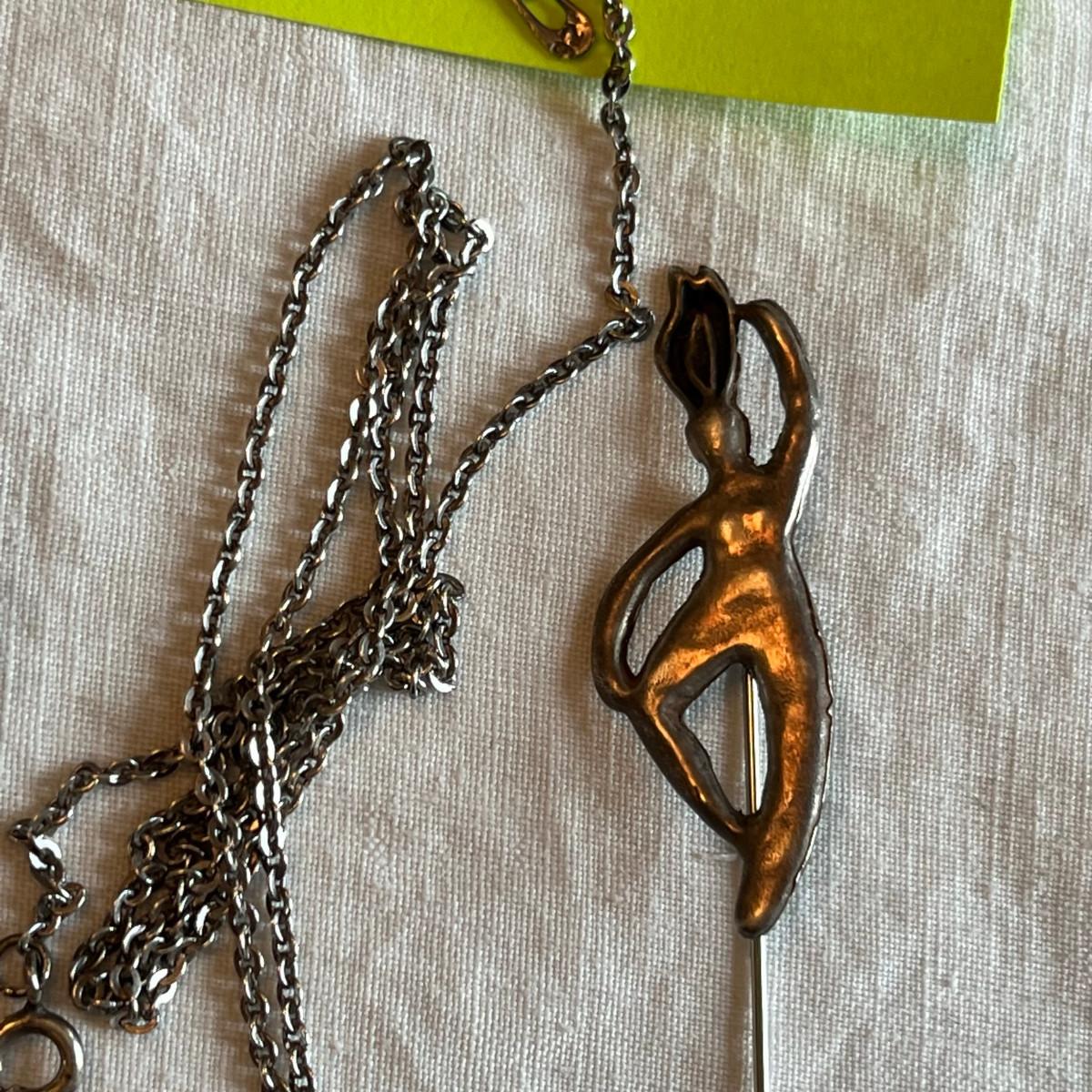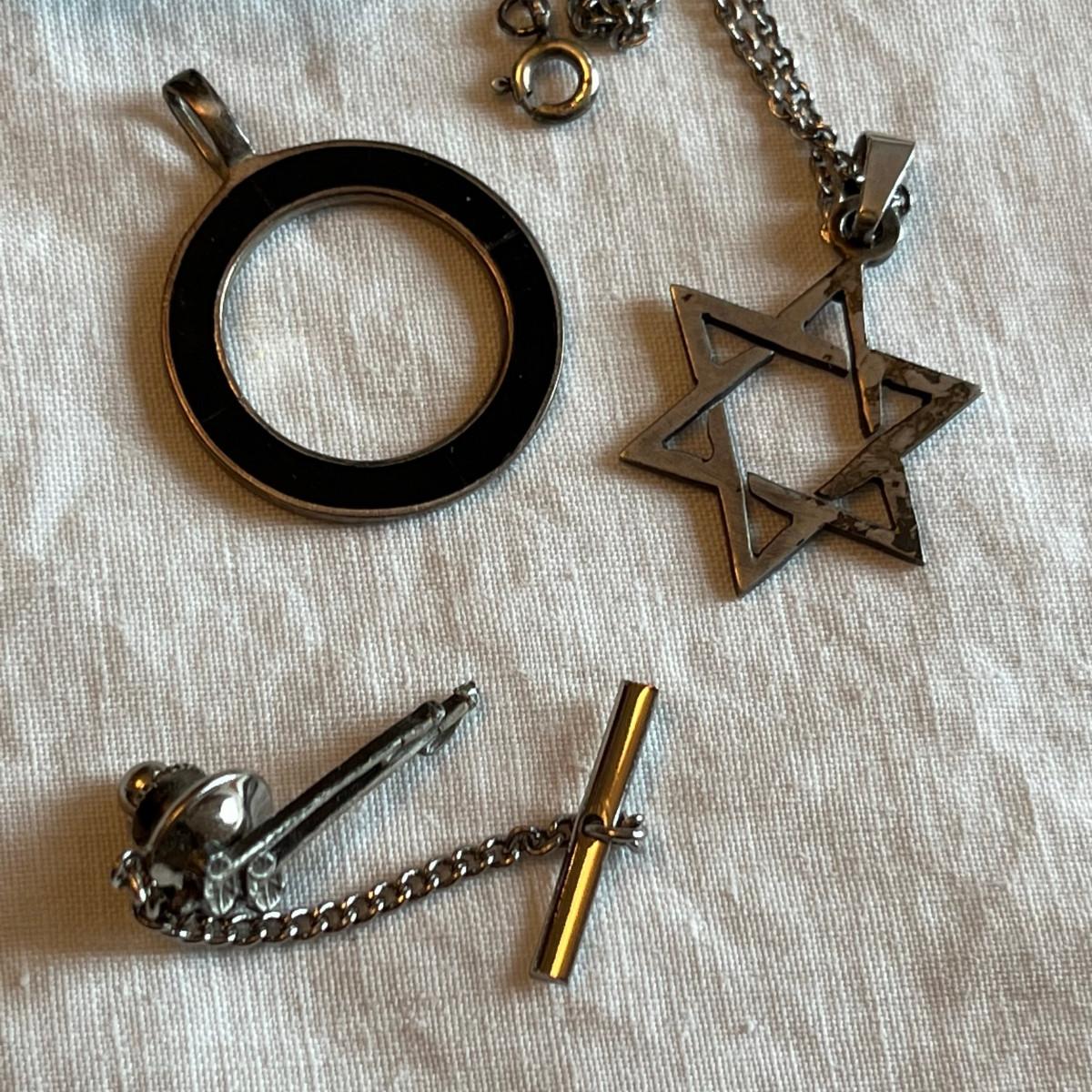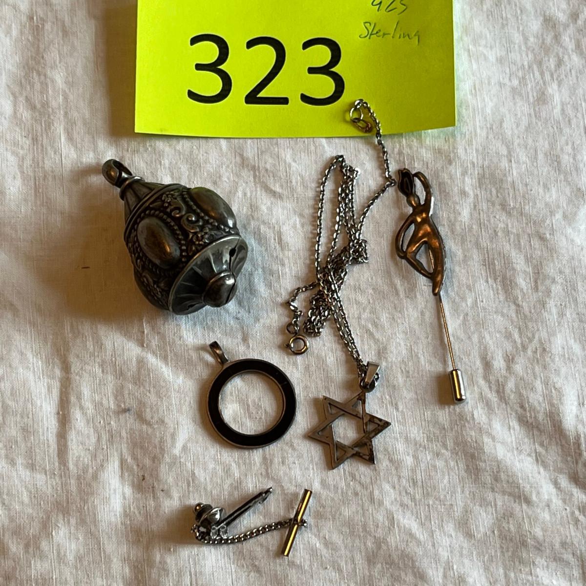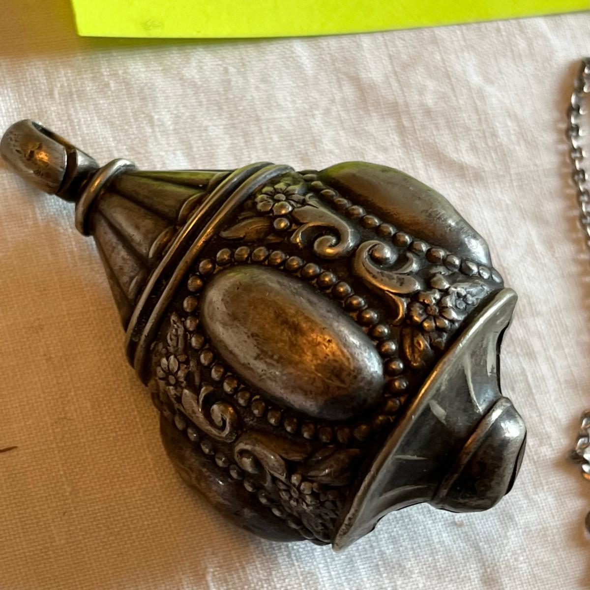 The large pendant is a rattle. Not signed, don't know if it is plate or sterling.
