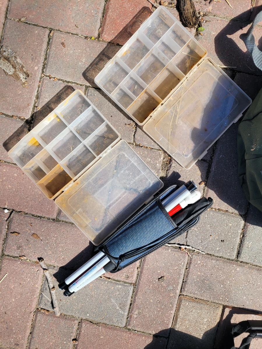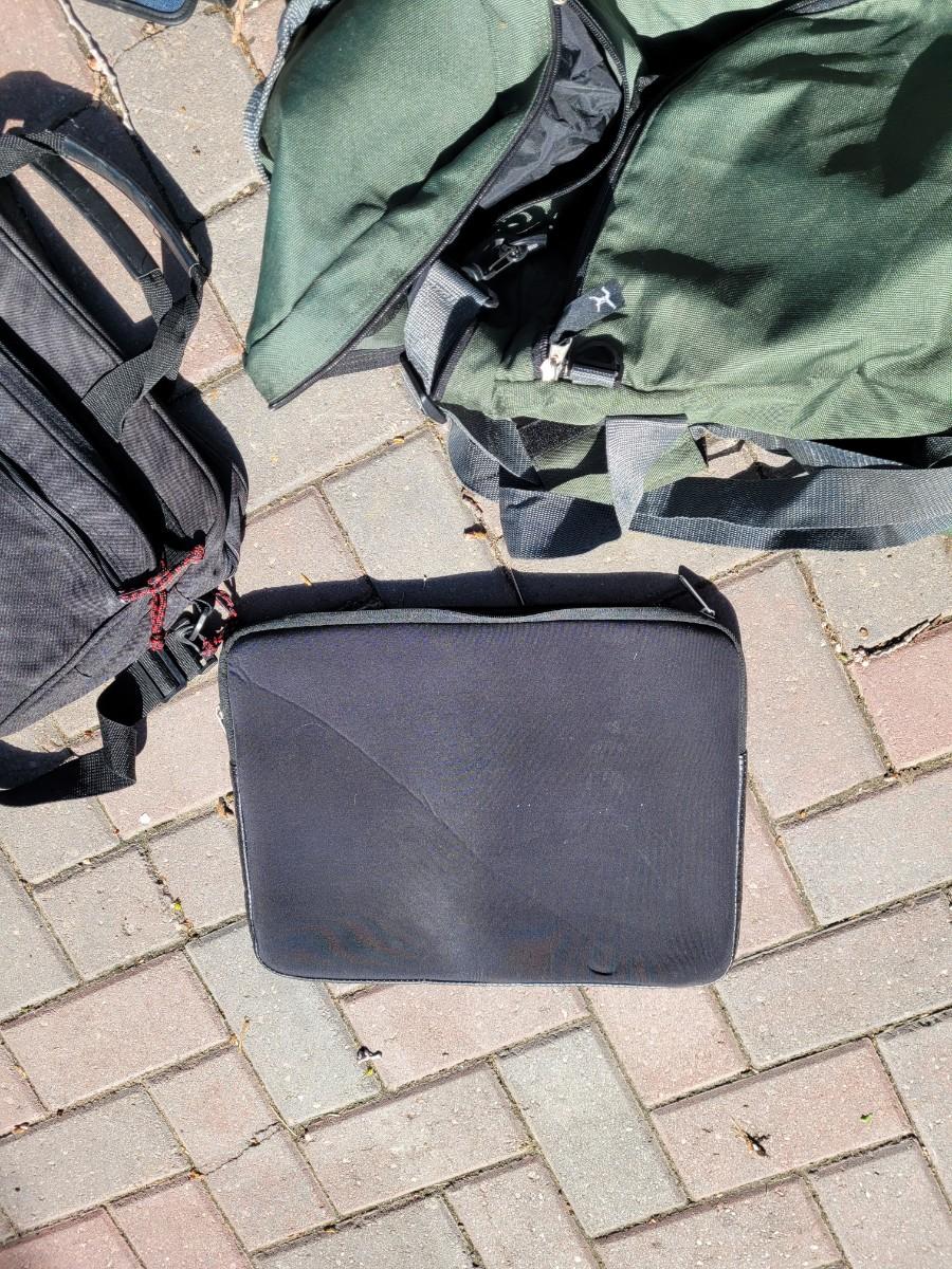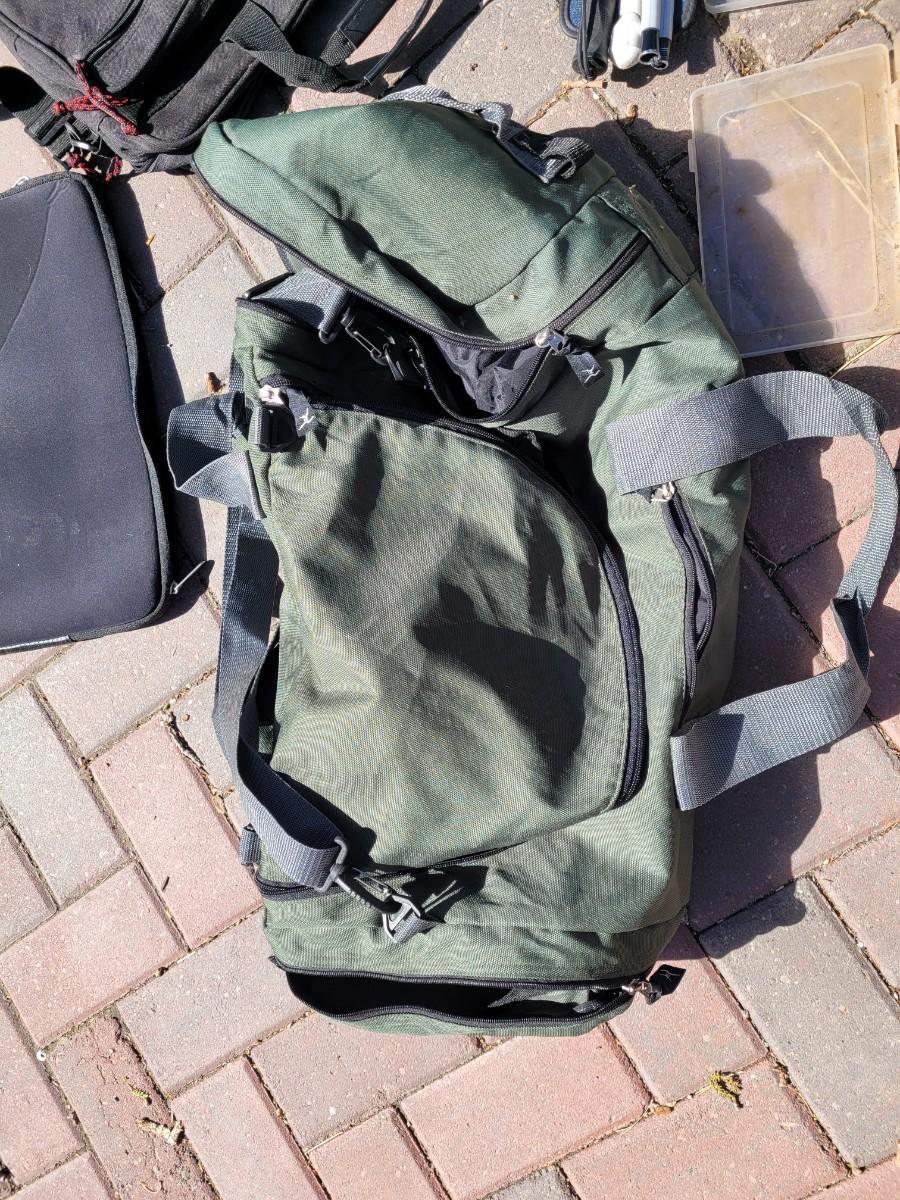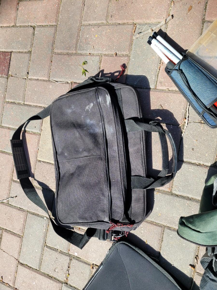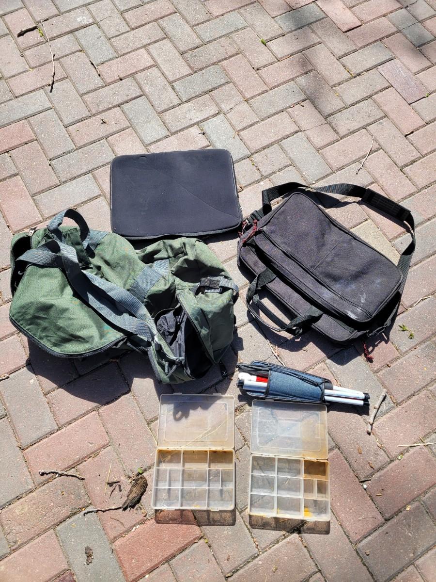 Large gym bag padded computer case padded portfolio bag/ computer case and two small plastic tins and a foldable cane
