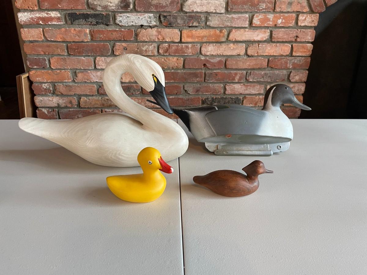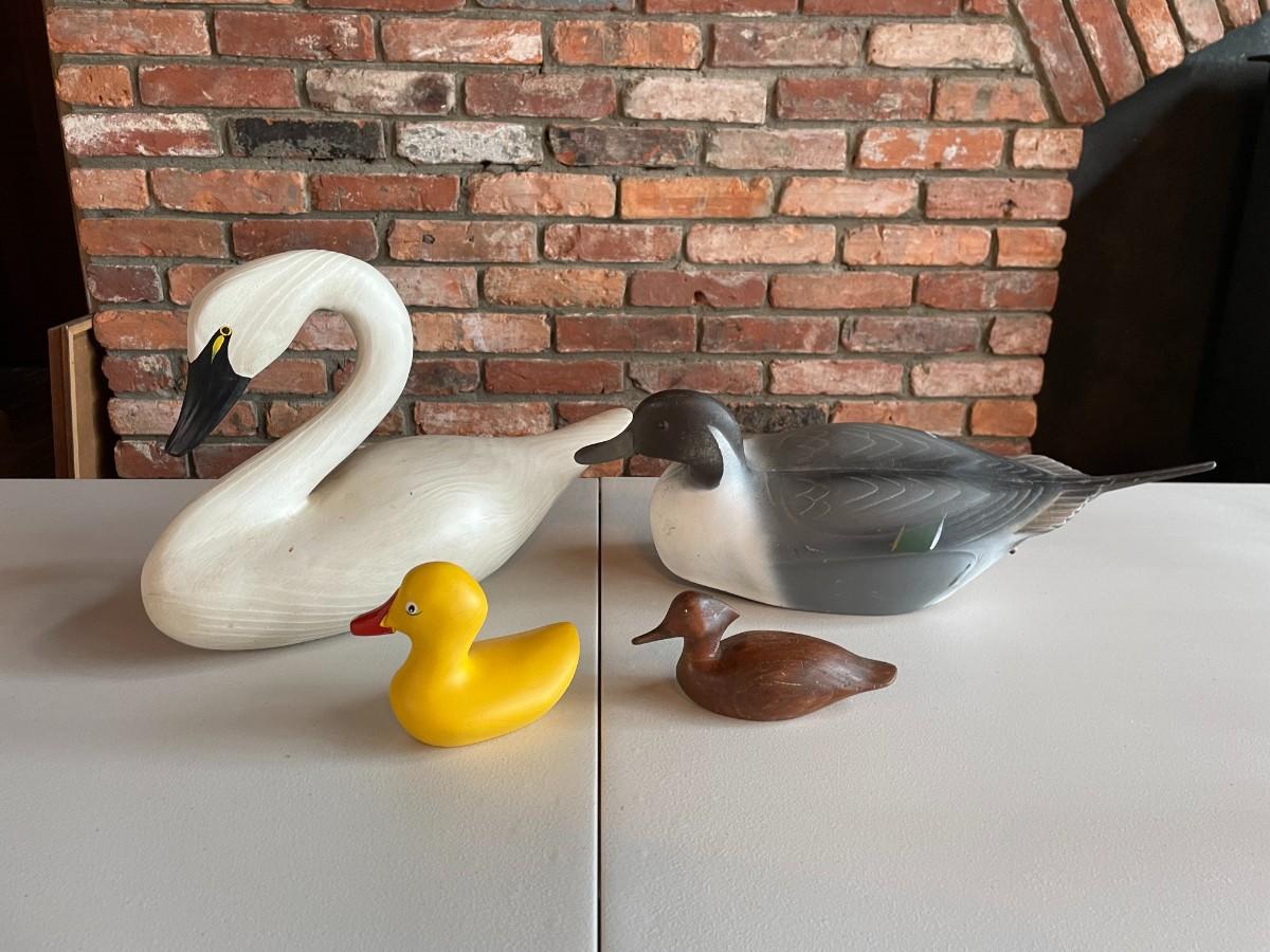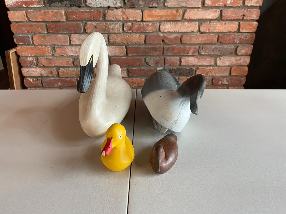 3 wood and 1 rubber Duck Decoy. Swan: 17L x 7W x 11H
