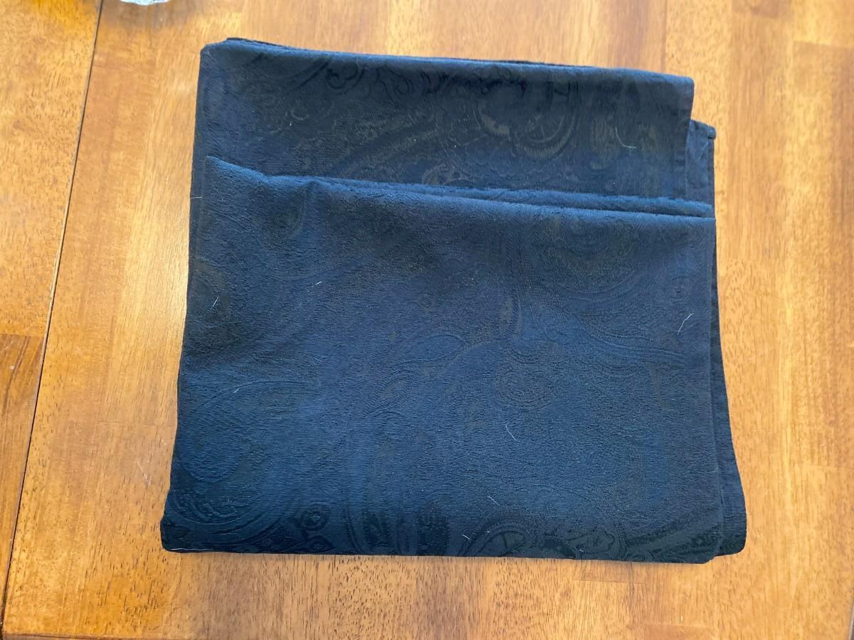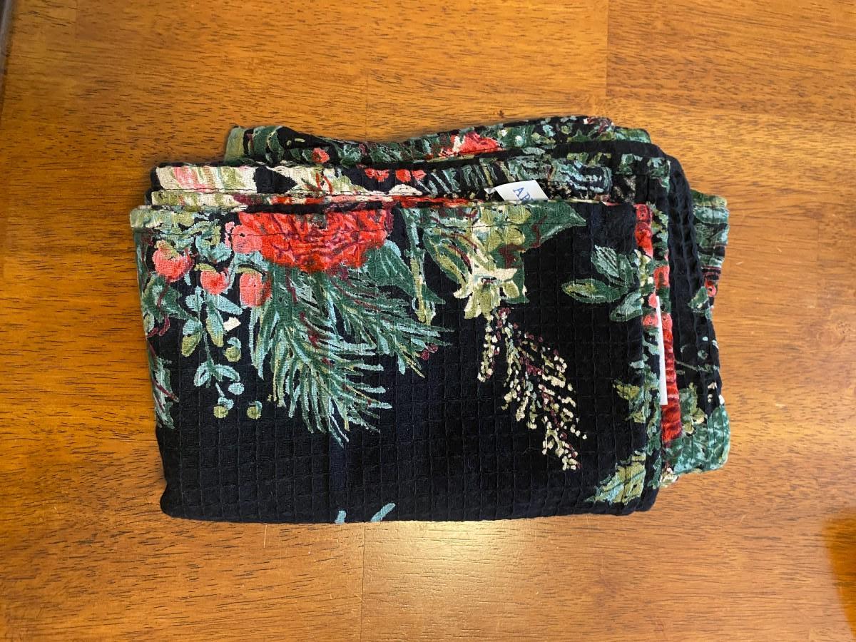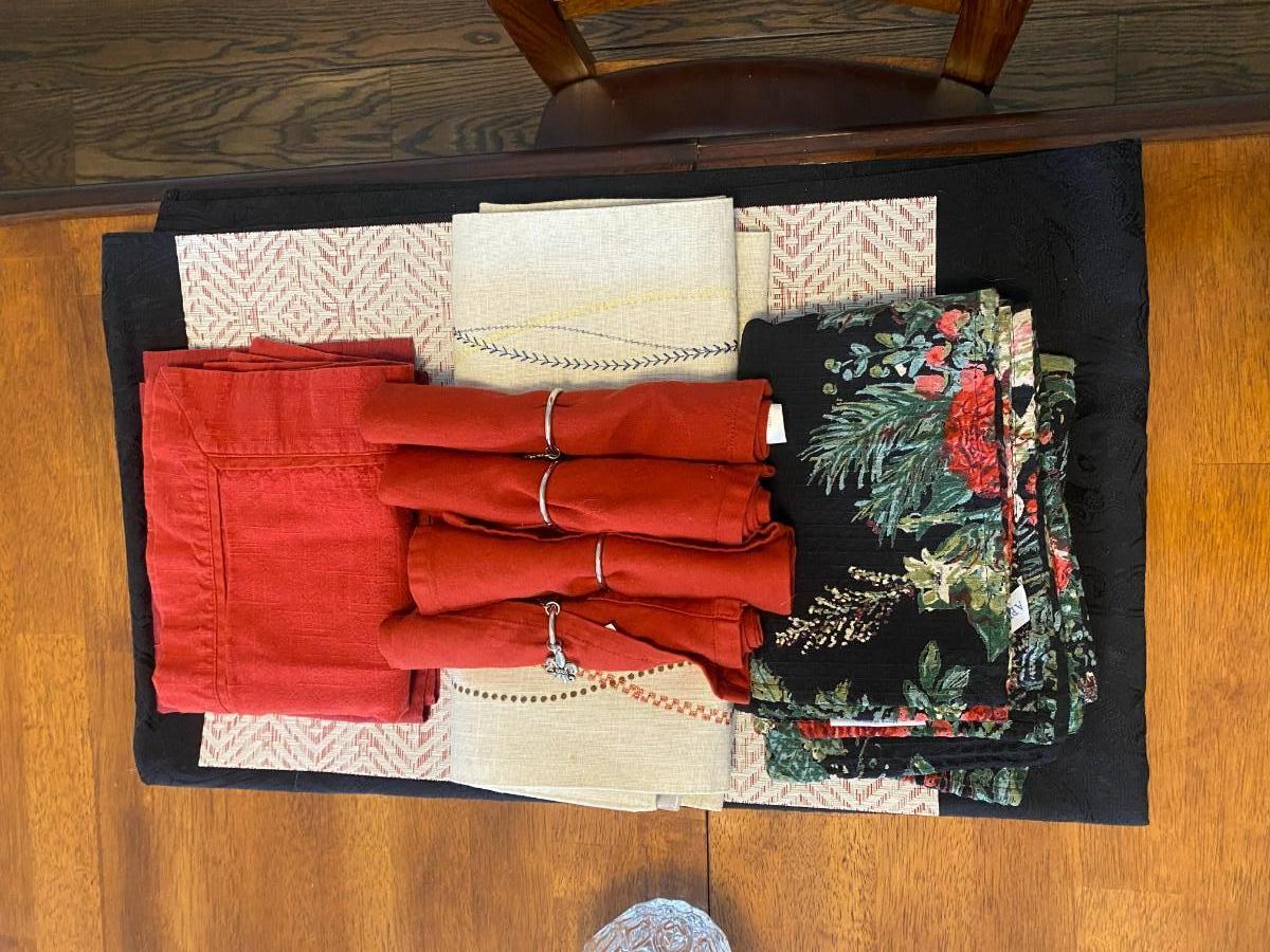 Sets of floral, red place mats, napkins. black tablecloth, cream printed table runner, metal napkin holders and wicker place mats are included in this lot.