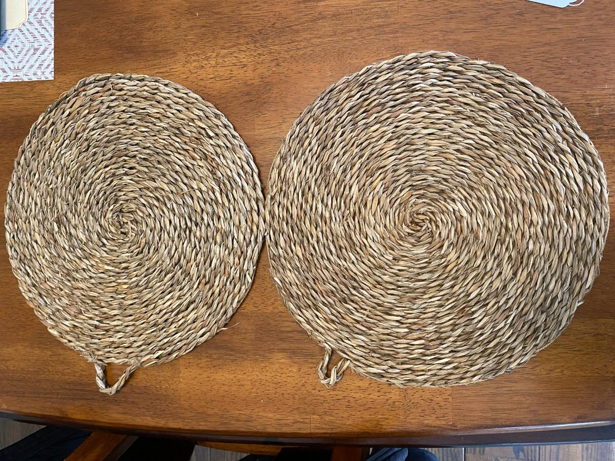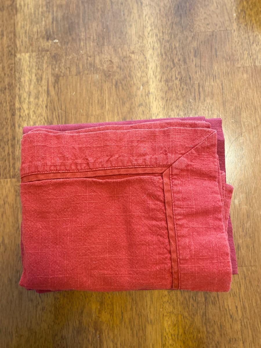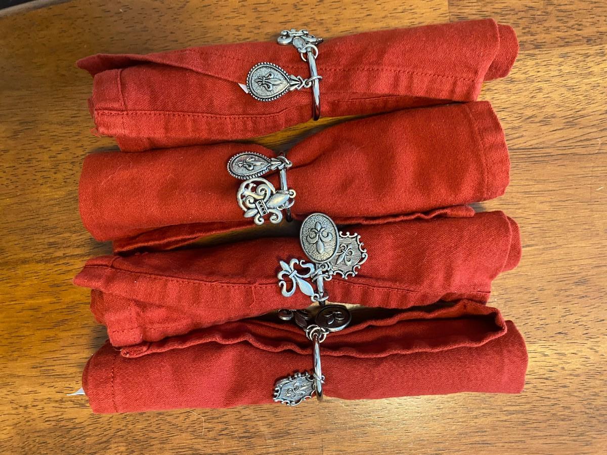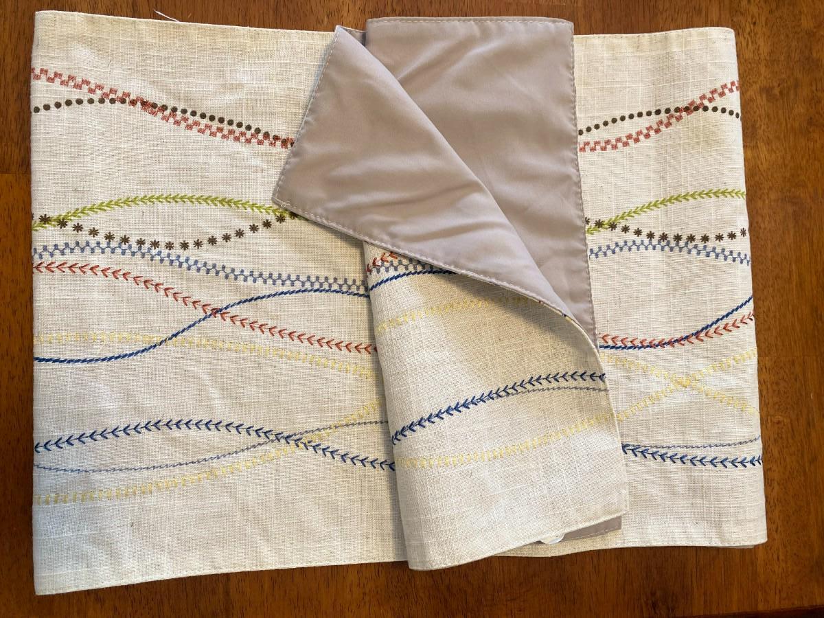 Sets of floral, red place mats, napkins. black tablecloth, cream printed table runner, metal napkin holders and wicker place mats are included in this lot.