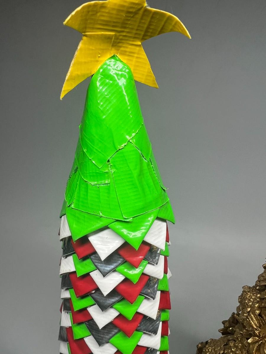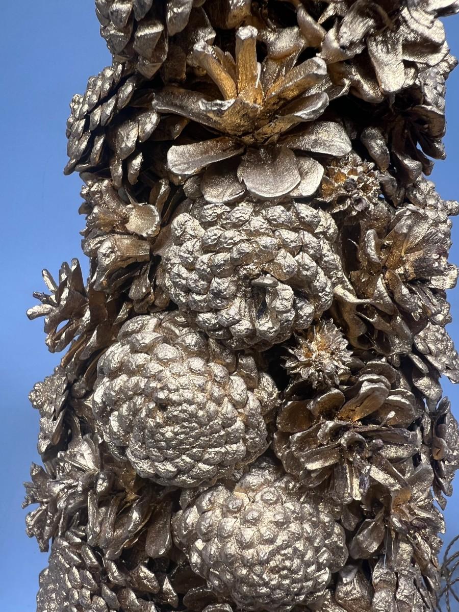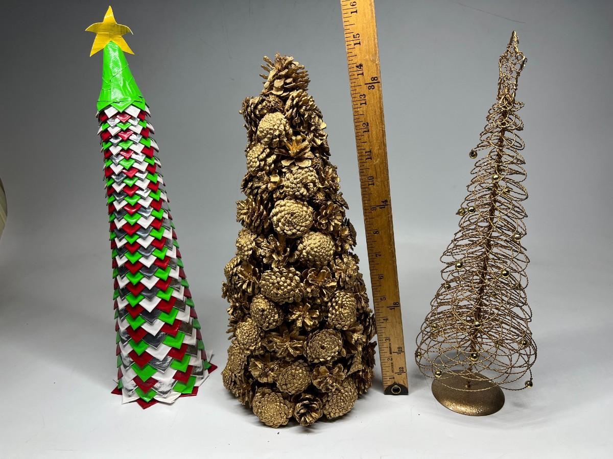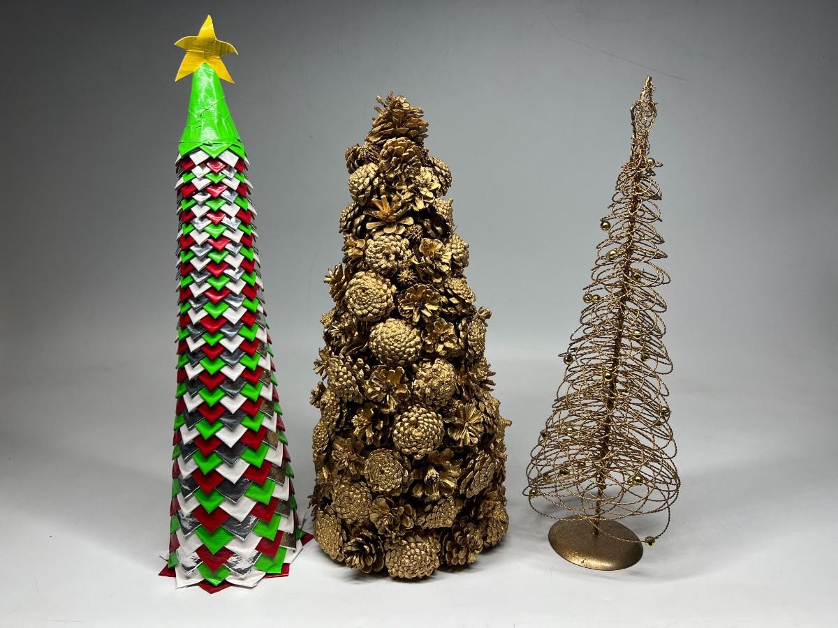 Lot of Tall Thin Christmas Tree Decorative Decor Duct Tape Crafted, Gold Spray Painted Pinecones, & Metal Wire Tree