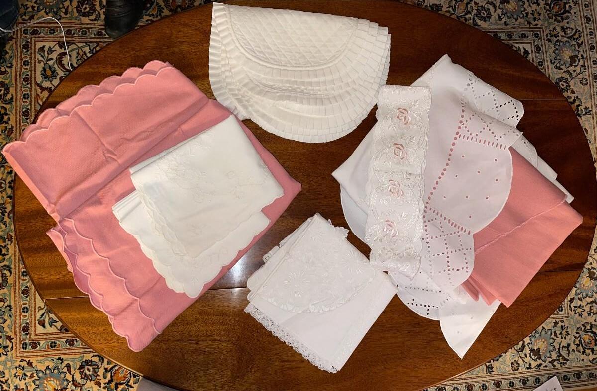 Scallops and lace. Includes Napkins, Placemats and Runners as well as napkin holders as pictured. Very good condition. See pic