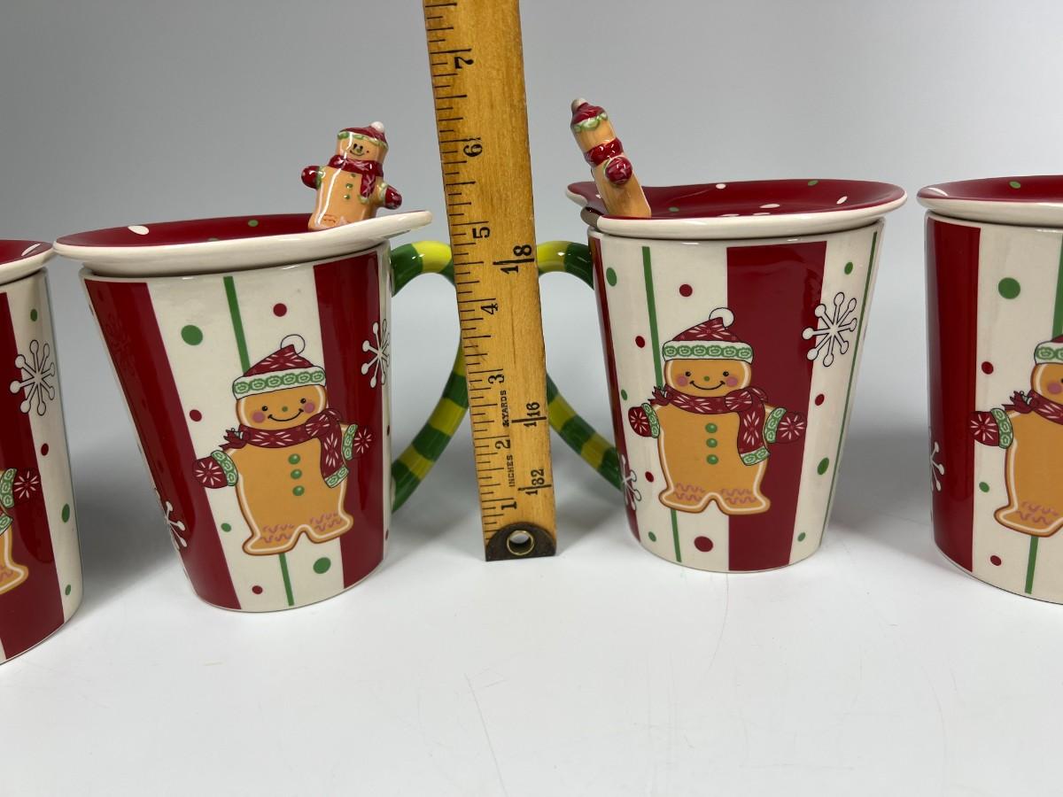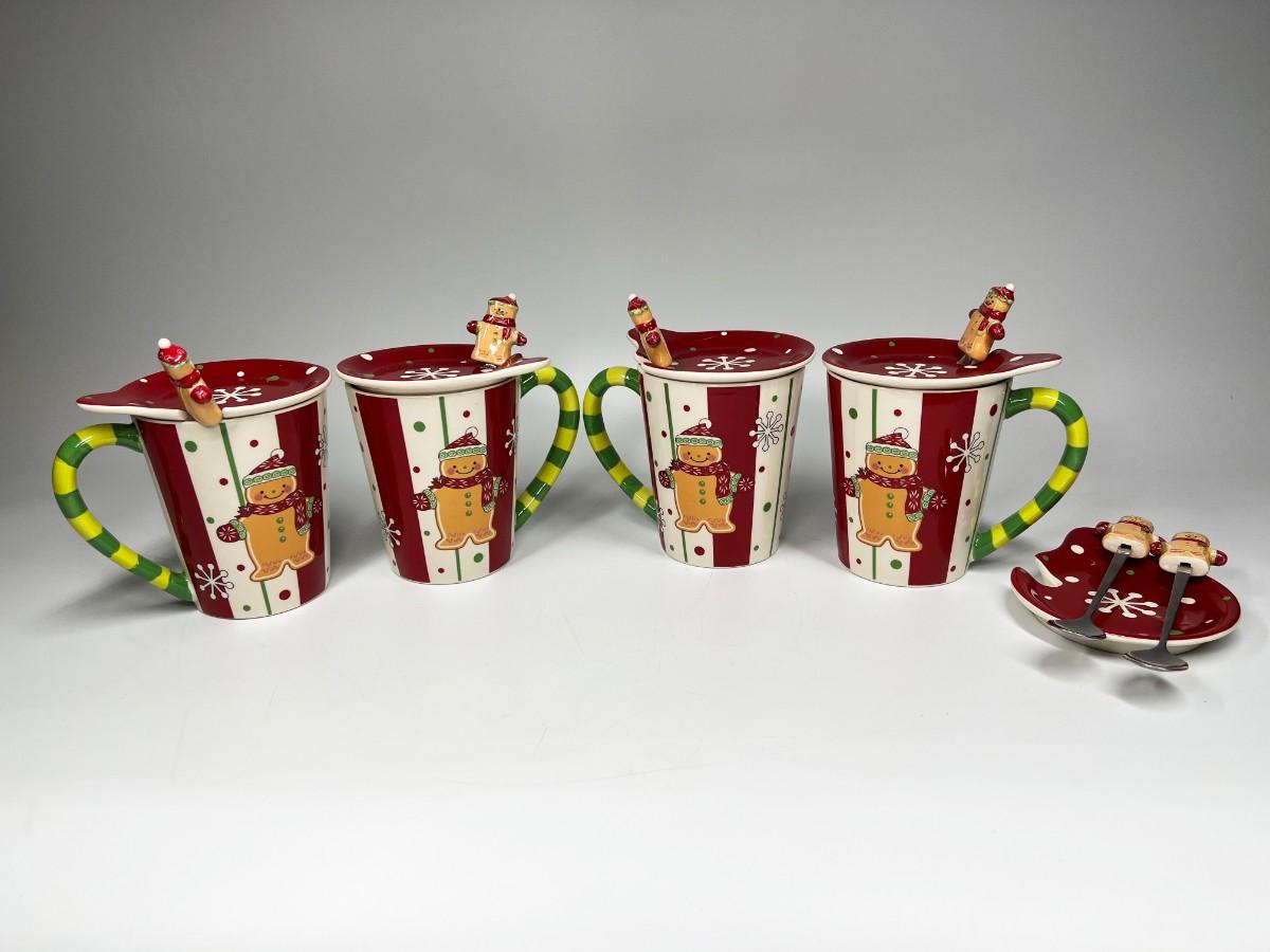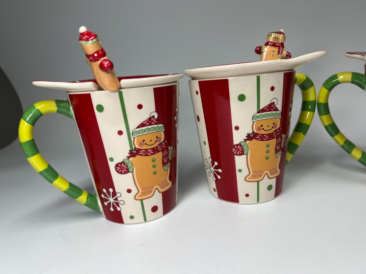 Lot of Temptations Hand Painted Handcrafted Ceramic Gingerbread Coffee Tea Mugs with Ceramic Lid and Matching Spoons