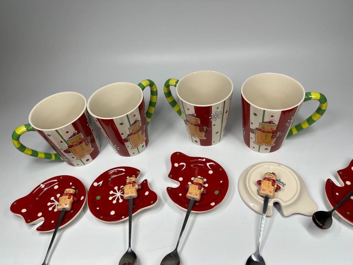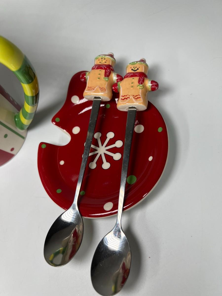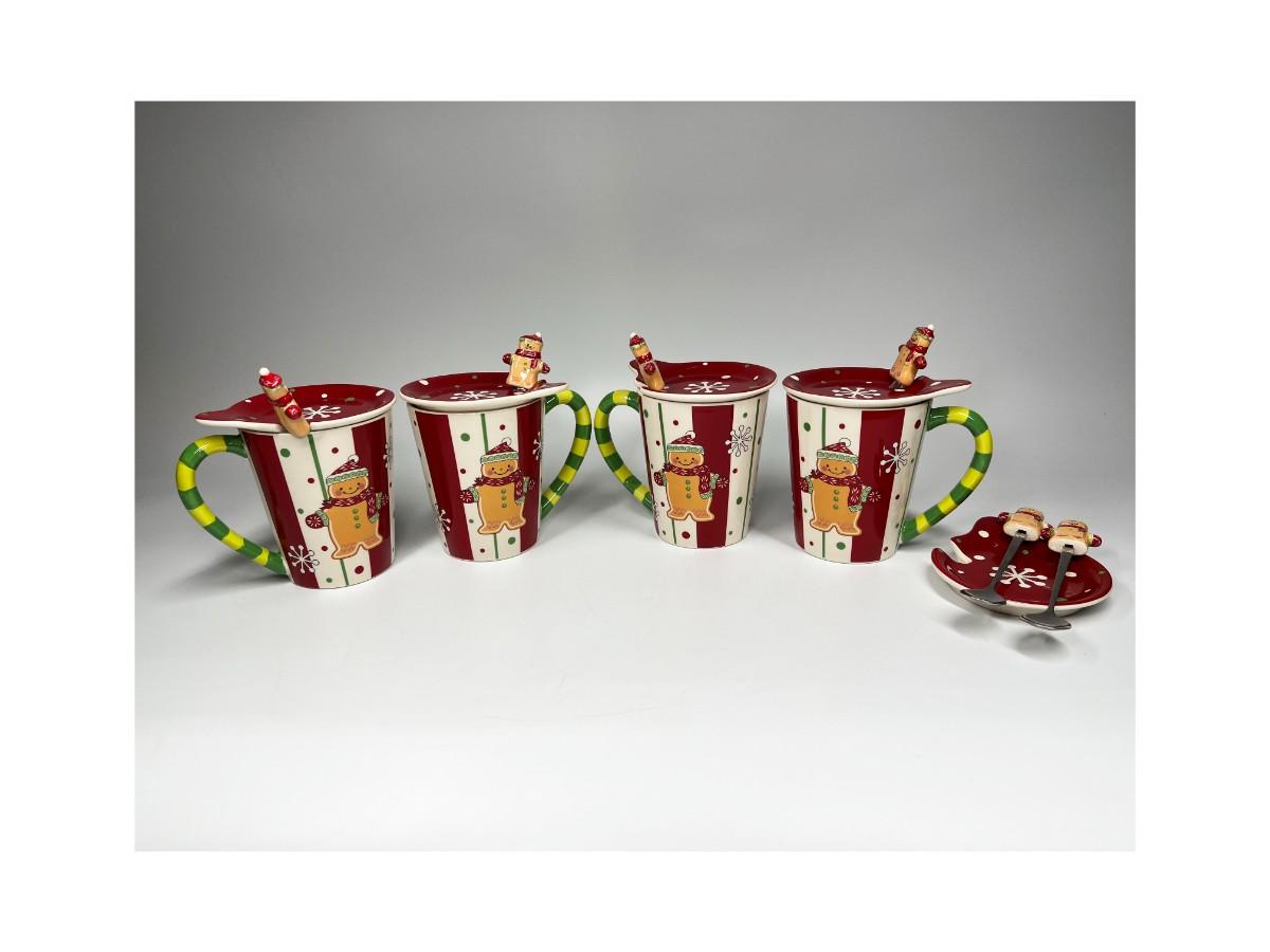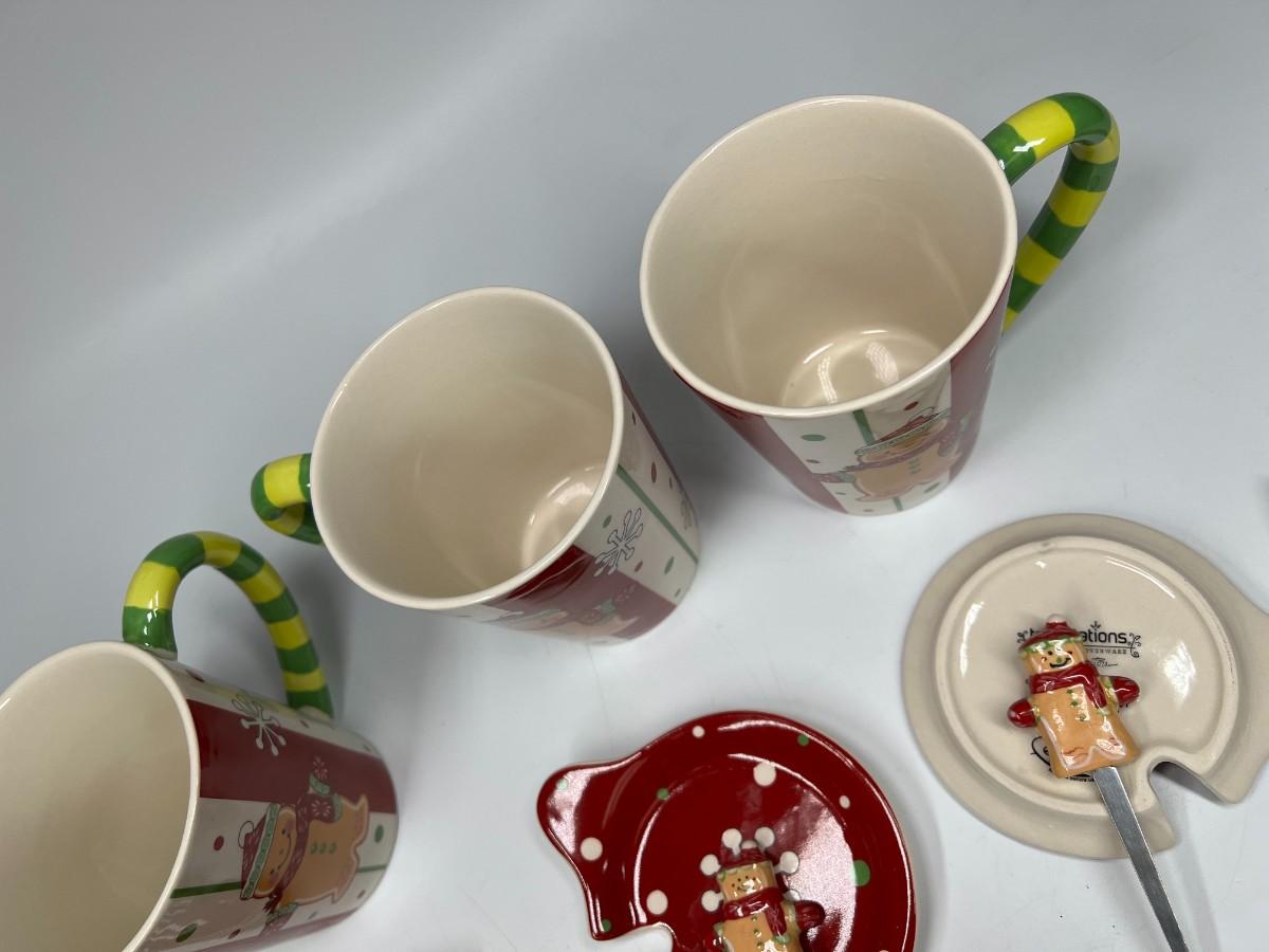 Lot of Temptations Hand Painted Handcrafted Ceramic Gingerbread Coffee Tea Mugs with Ceramic Lid and Matching Spoons
