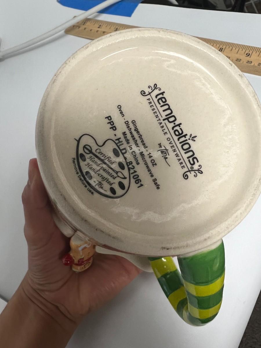 Lot of Temptations Hand Painted Handcrafted Ceramic Gingerbread Coffee Tea Mugs with Ceramic Lid and Matching Spoons, there is no significant damage to the ceramic pieces in the lot and is in good useable condition. Comes with an extra lid and two spoons. Check pictures for more details and for sizing.