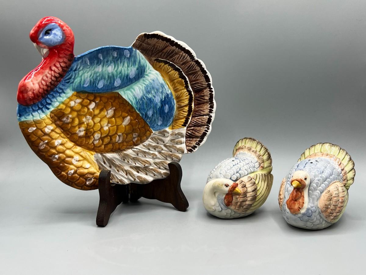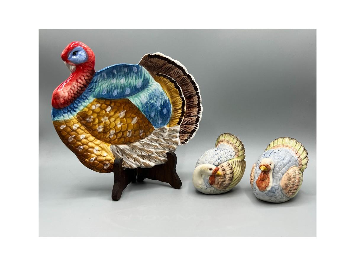 Lot of Thanksgiving Wild Turkey Salt & Pepper Shakers and Decorative Ceramic Plate
