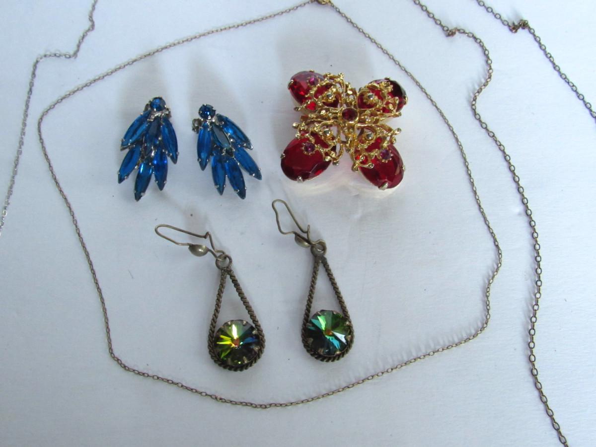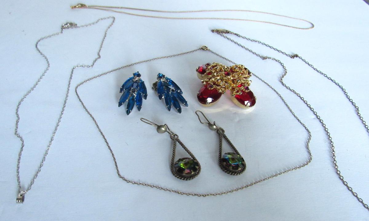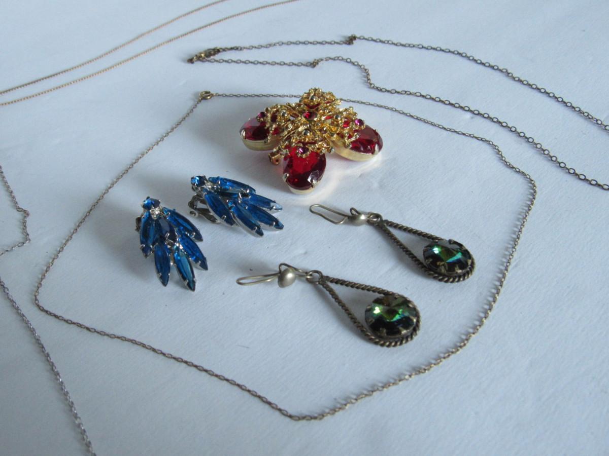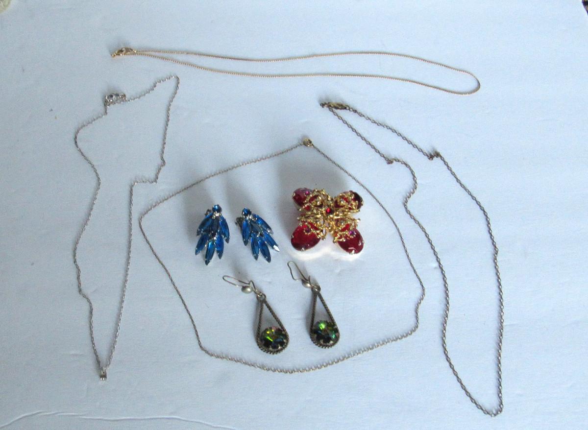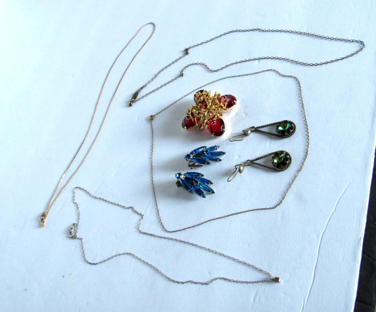 Lot of Thin Chains, Rhinestone Earrings and Brooch