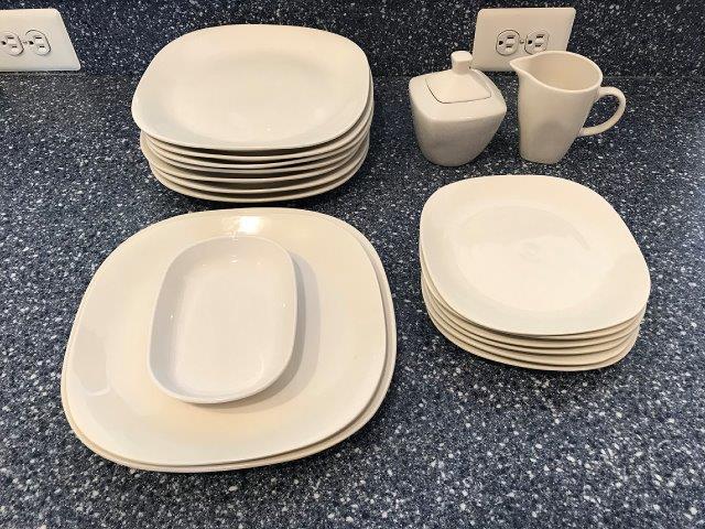Includes 8 dinner plates, one chop plate, 6 dessert/salad plates, cream & sugar, open butter. White square in shape