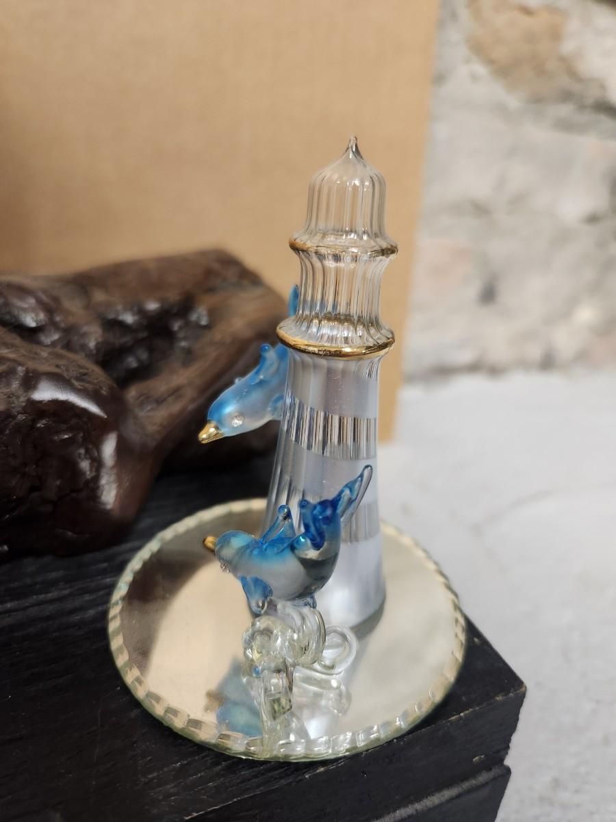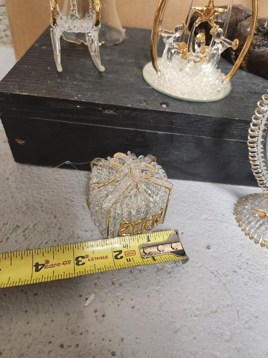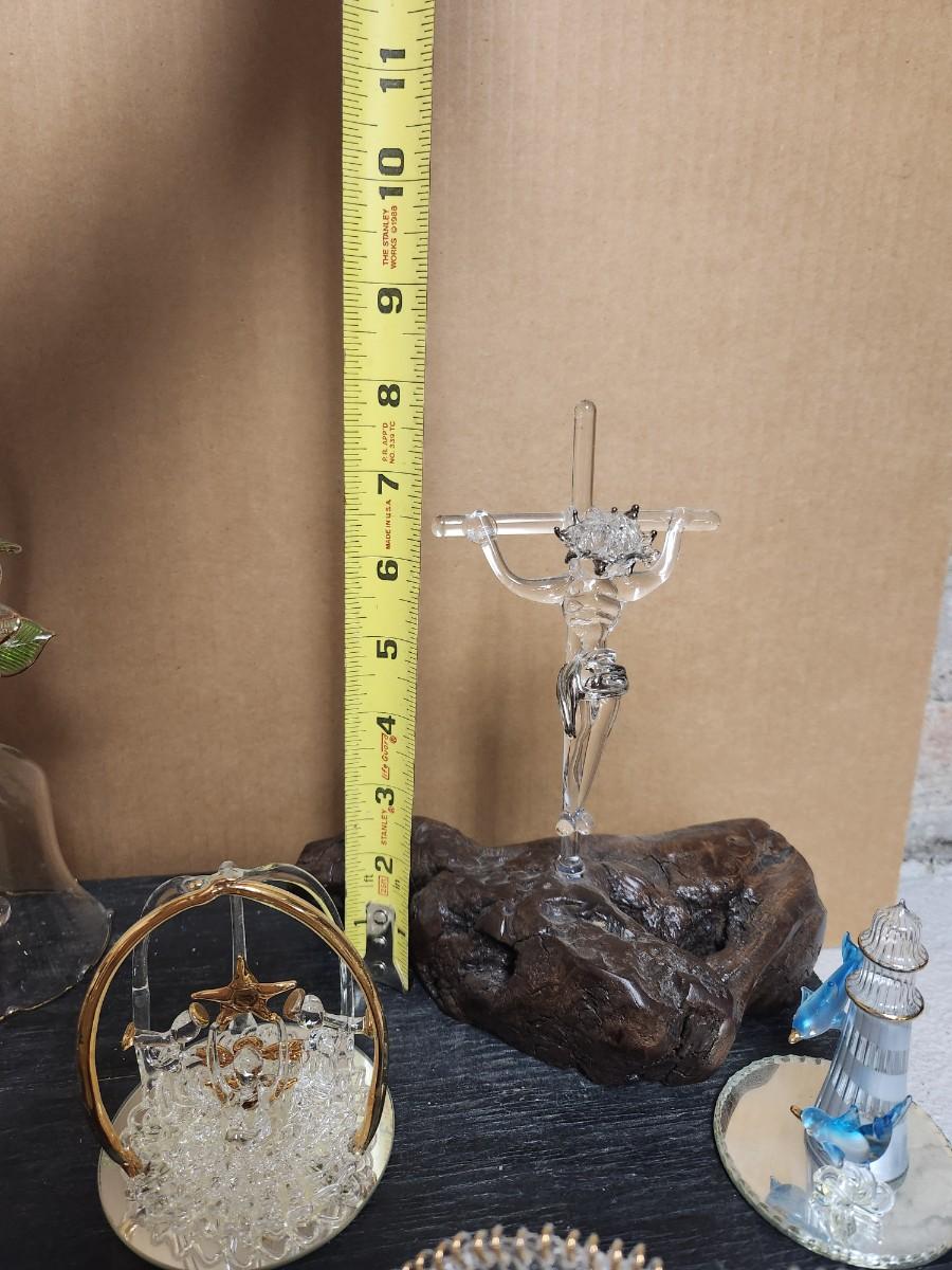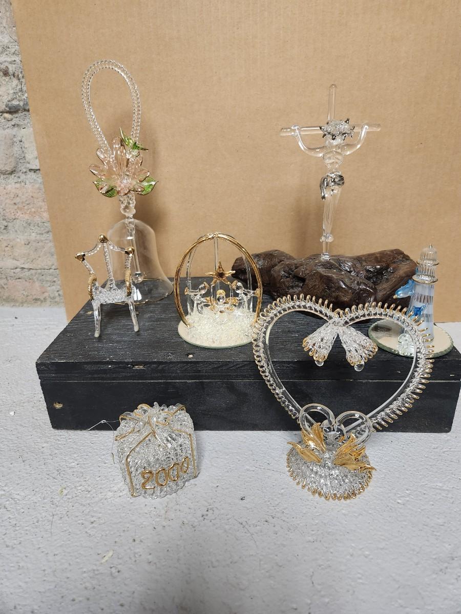 This lot of threaded glass includes a glass bell, a nativity, a dolphin lighthouse and other items