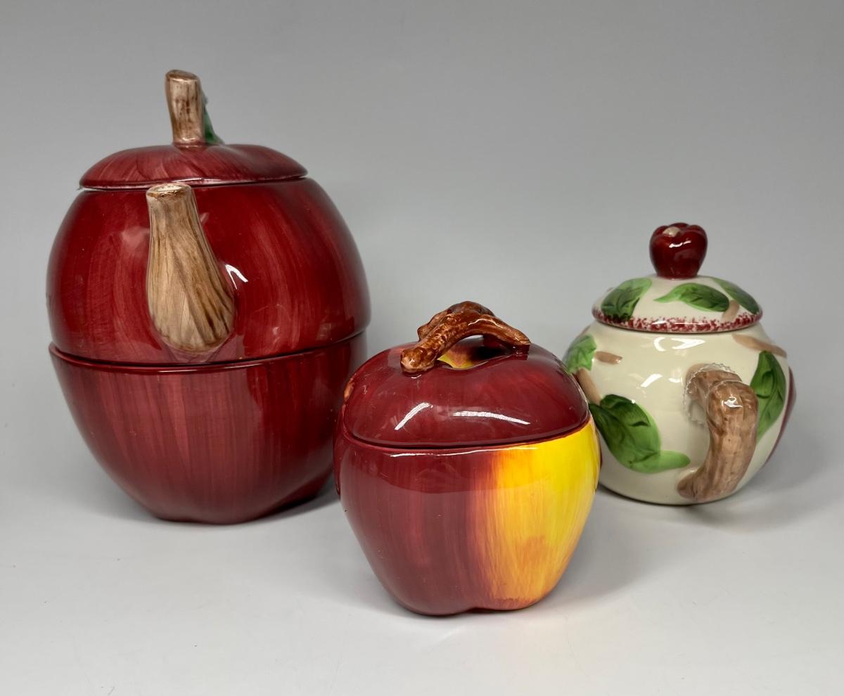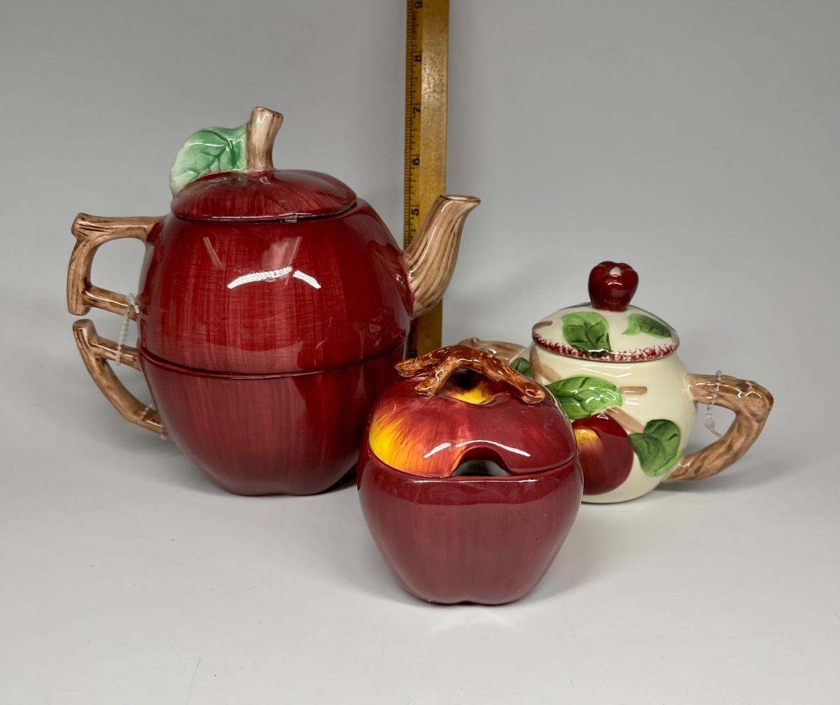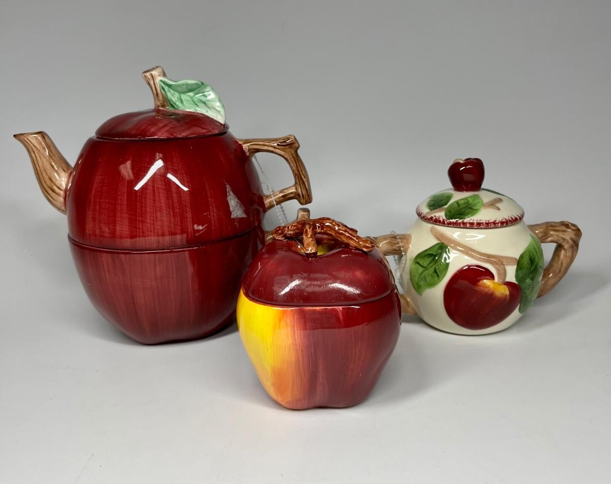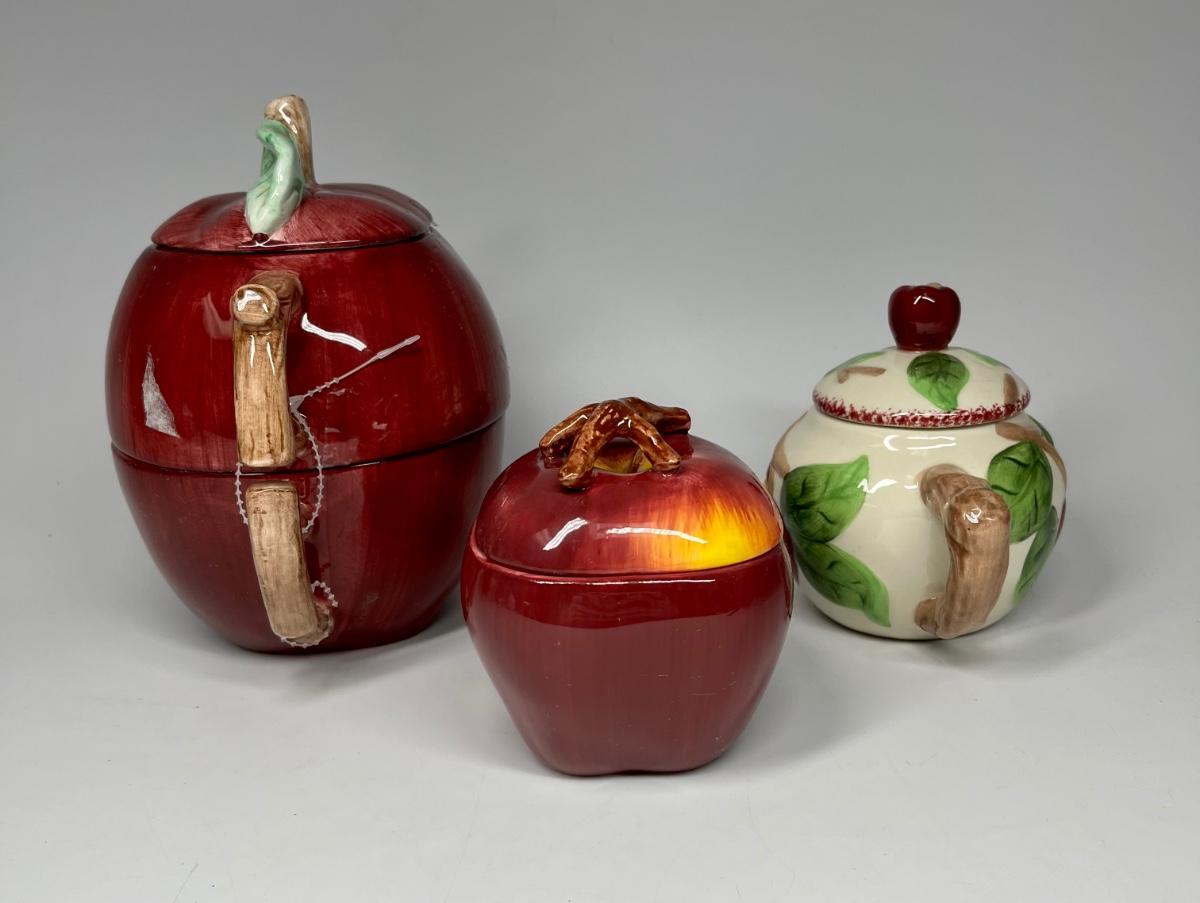 Lot of three apple themed tea pot and sugar bowls. Made by different makers.