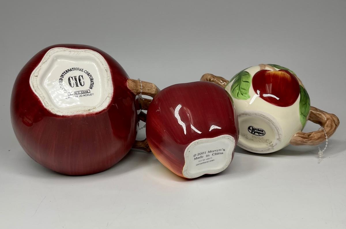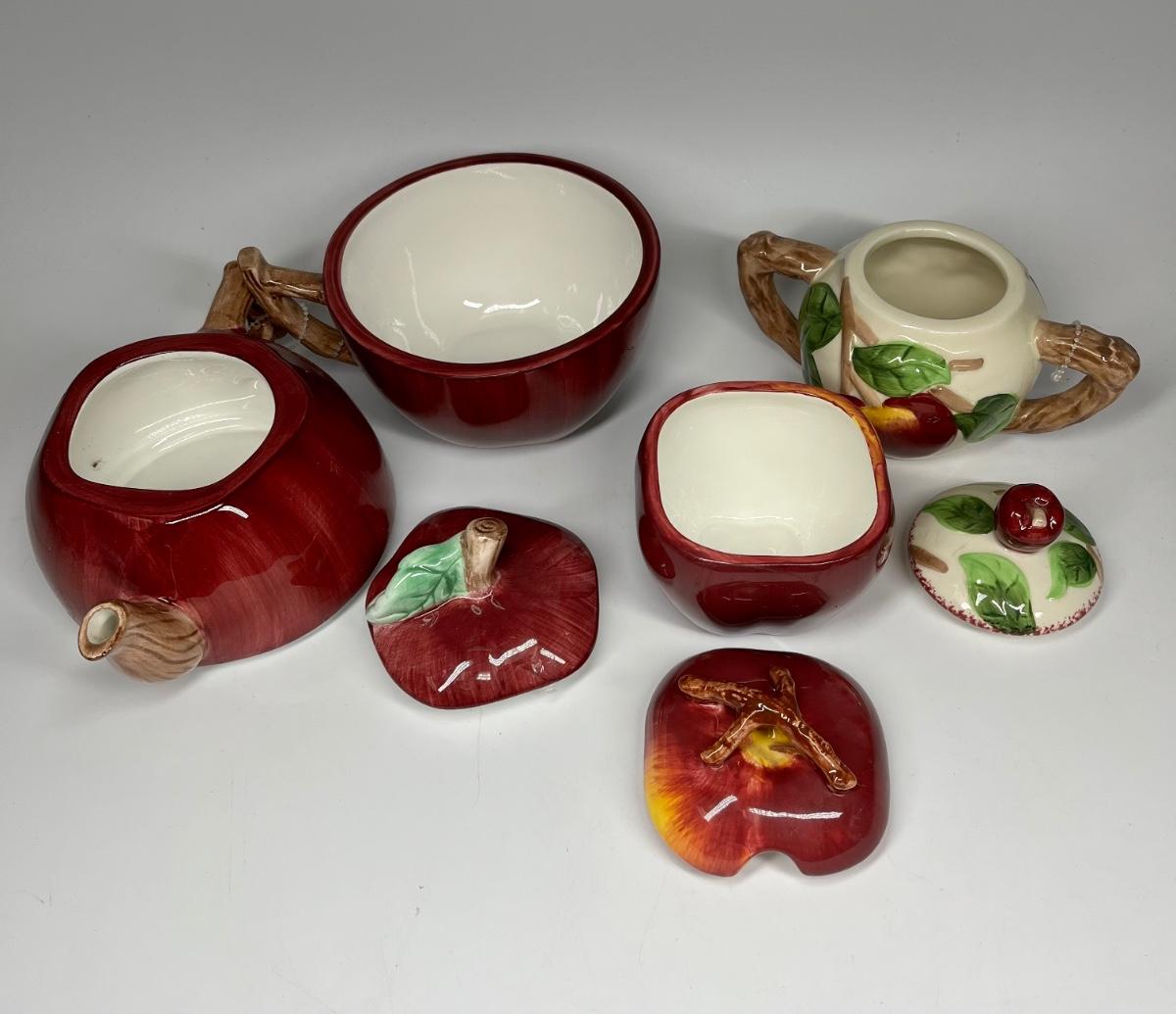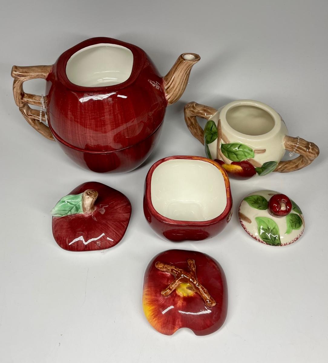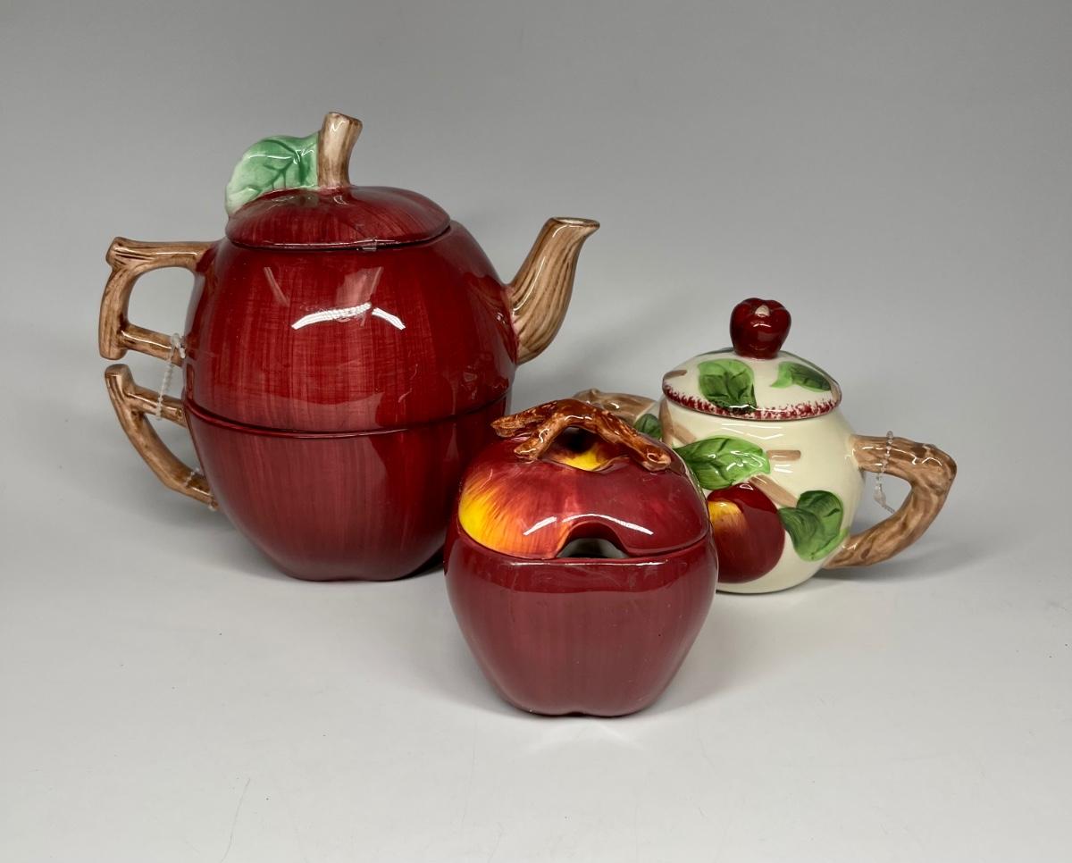 Lot of three apple themed tea pot and sugar bowls. Made by different makers.