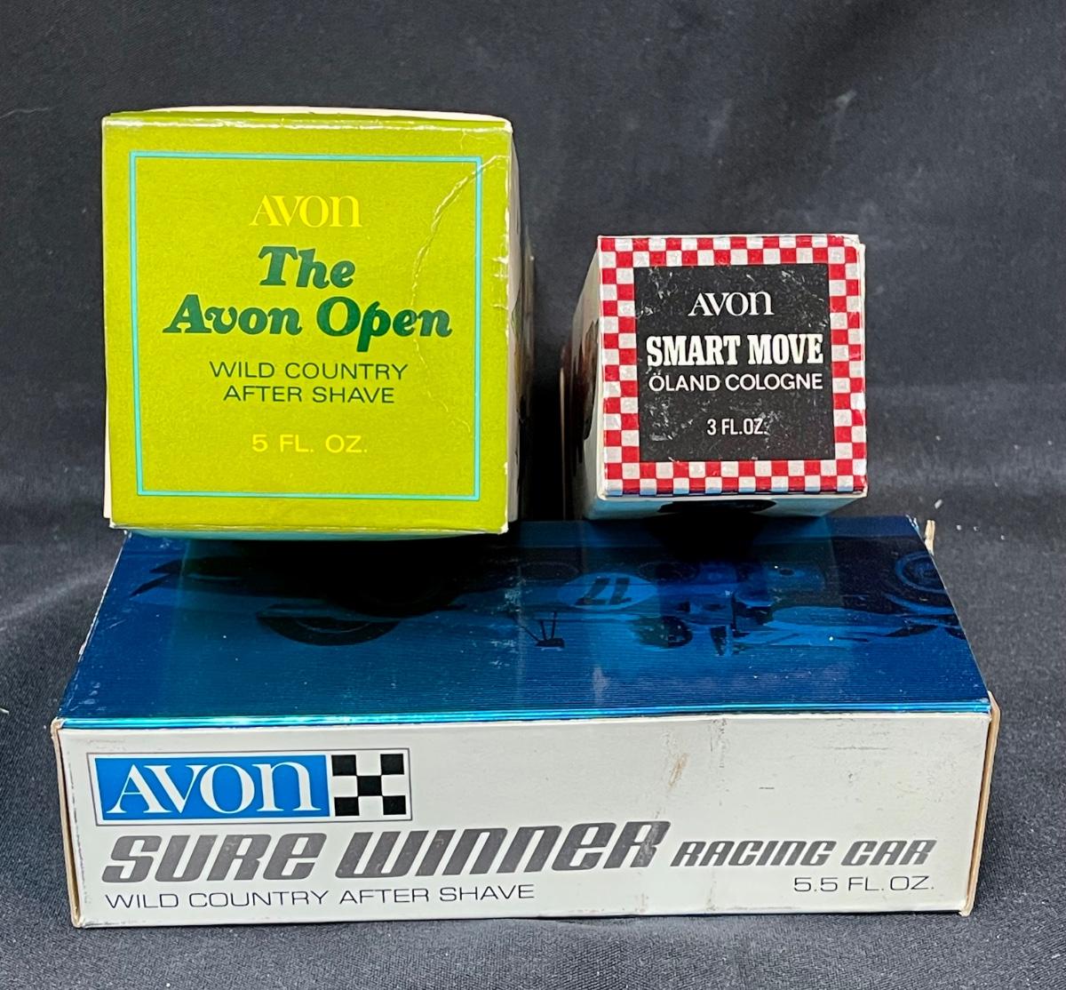 Lot of three Avon, cologne, bottles, figure roll, race, car, chess piece golf