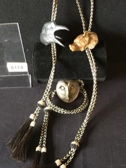 Lot of Three Bolo Ties Native American Indian Artisan Made Cast Bronze Owl Bear Bird Heads