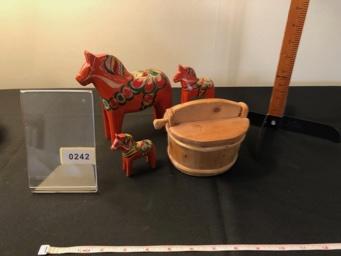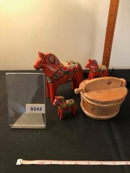 Lot of Three Swedish Dala Horses/ Folk Art Box