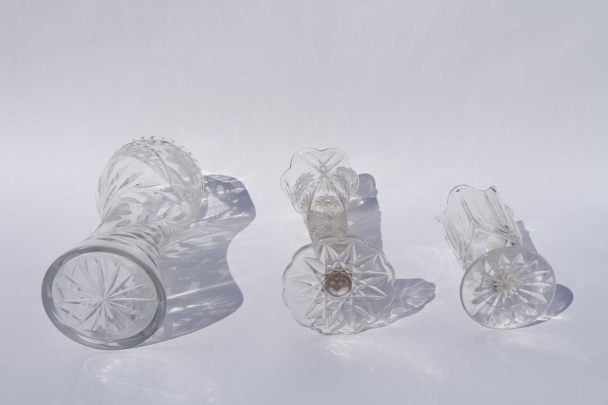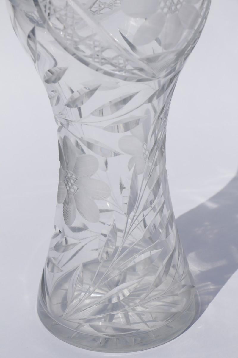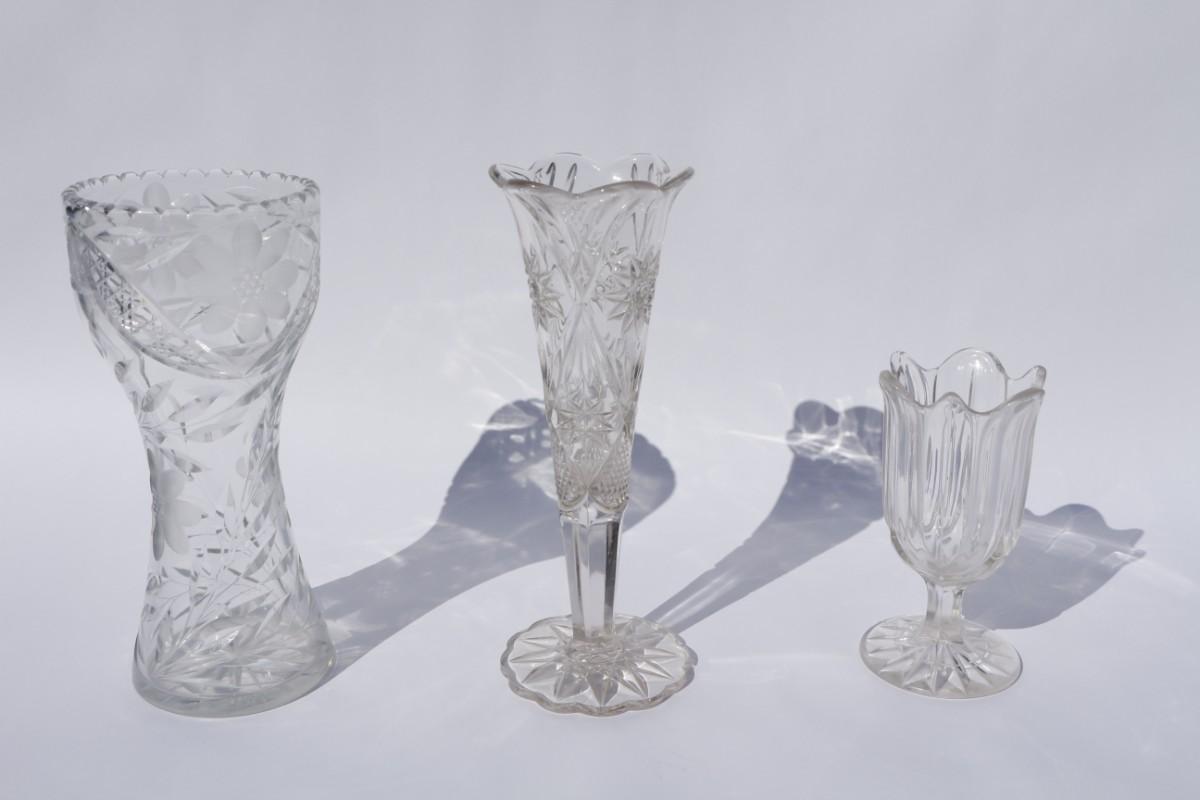 Three vintage glass vases: one tulip vase (12 inches tall, 4.5 inches diameter), one large heavy crystal vase (12 inches tall, 5.5 diameter), one tapered vase (7.5 tall, 4 inches diameter). Excellent condition; no chips or cracks.