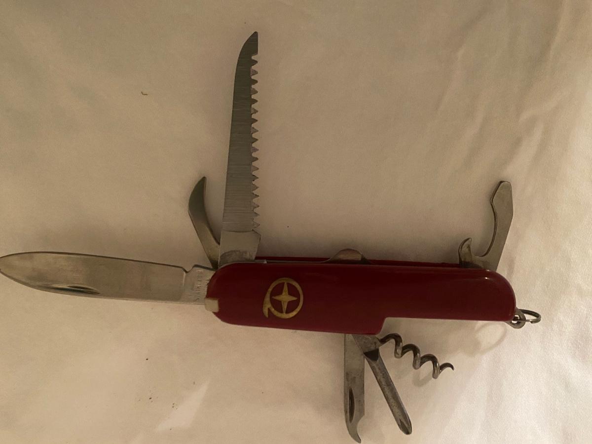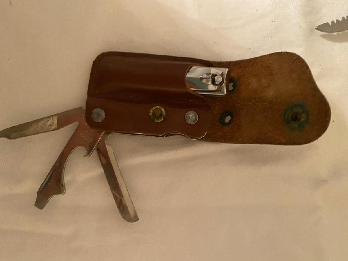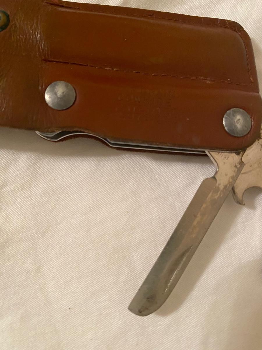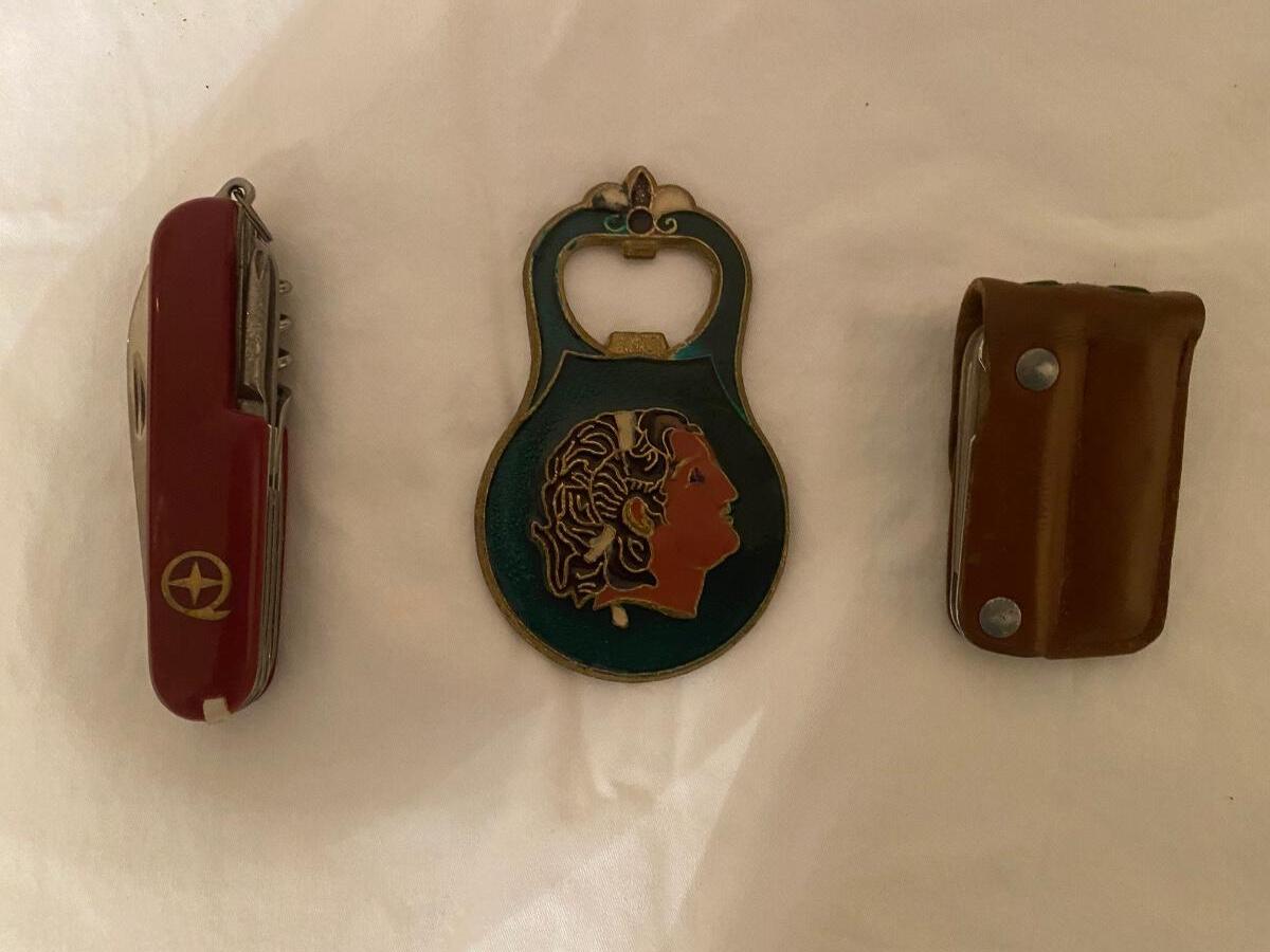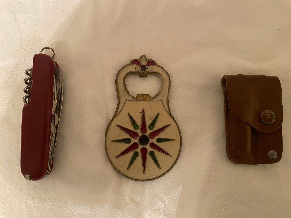 Lot of three vintage utility items: Cross utility knife, vintage bottle opener (Krewe favor), top grain cowhide case with utility knife and nail clippers. All in good vintage condition