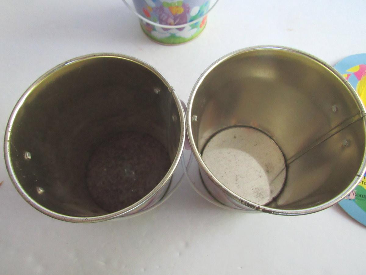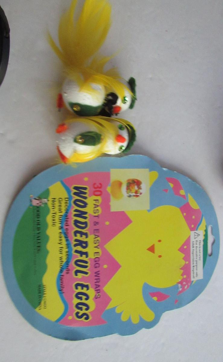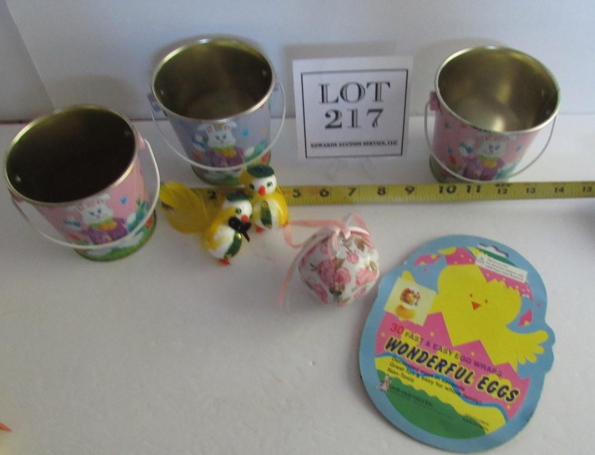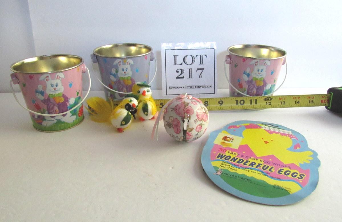 The chicks need TLC - need legs and or a base. The wraps are unused, bell is very pretty and buckets are nice but one is darkened inside. Shipping is available on this lot with additional shipping and handling fees. See our terms for details.