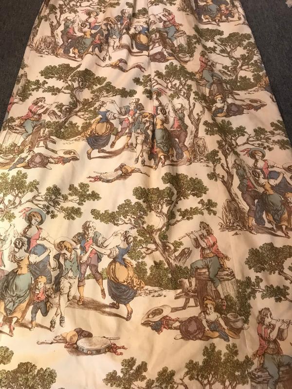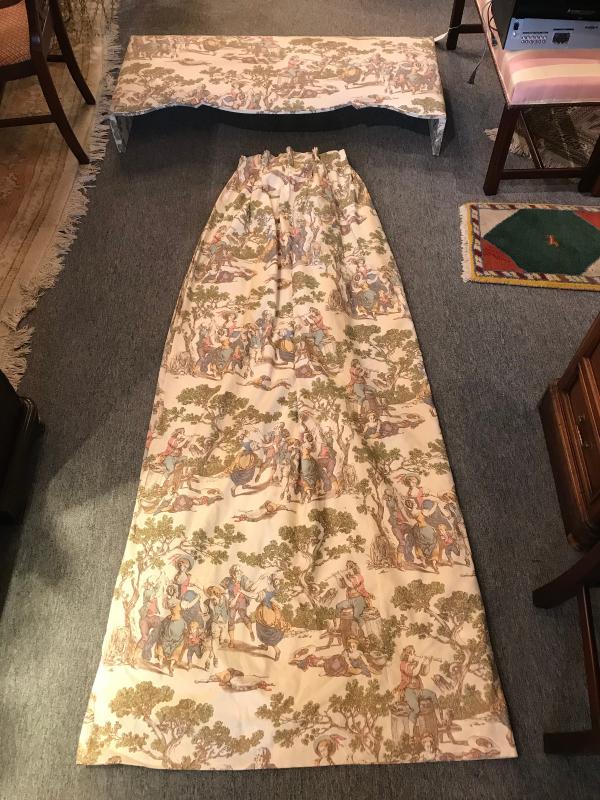 Lot of upholstered cornices with matching lined drapes. Board cornices are padded, lined, and upholstered, and are shaped to fit around standard crown moulding. 81" lined pinch pleated drapes to match. Fabric is a large print Toile de Jouy on cream with pastel shades of lavender, blue, aqua, pink, green, and tan. Lot includes four cornices 51 1/2" x 22 1/2" x 7" with drapes to fit (standard window size), and one cornice 130" x 22 1/2" x 9" with drapes to fit (sliding glass door size). They are in as found condition- some fading and age staining on draperies. Large cornice has water staining. Could be cleaned and used as is, or use the yards and yards of fabric for another project.