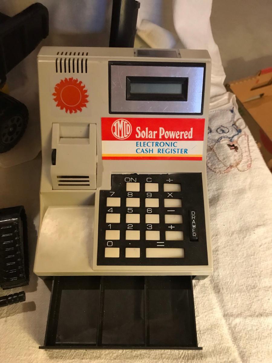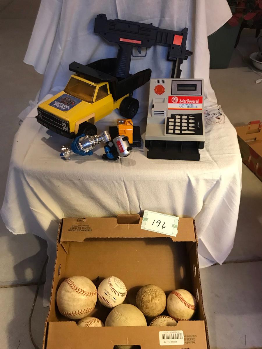 Baseballs, Tonka truck, & cash register